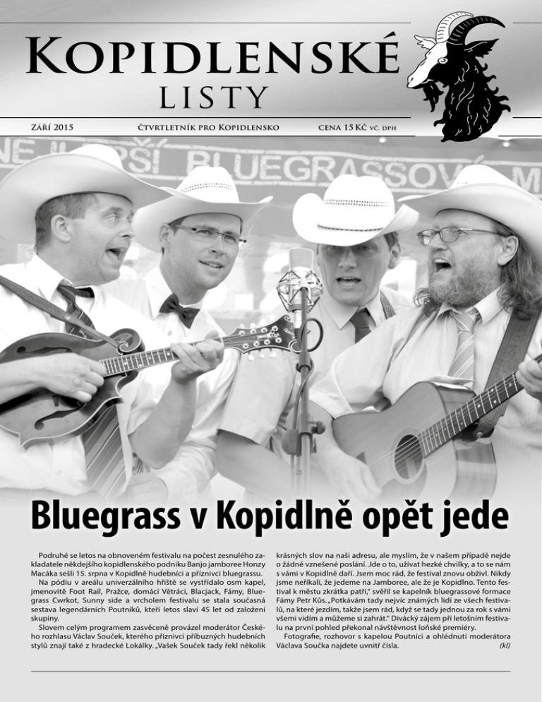 Kopidlenské list y Září 2015 čtvrtletník pro Kopidlensko cena 15 Kč vč. dph Bluegrass v Kopidlně opět jede Podruhé se letos na obnoveném festivalu na počest zesnulého zakladatele někdejšího kopidlenského podniku Banjo jamboree Honzy Macáka sešli 15. srpna v Kopidlně hudebníci a příznivci bluegrassu. Na pódiu v areálu univerzálního hřiště se vystřídalo osm kapel, jmenovitě Foot Rail, Pražce, domácí Větráci, Blacjack, Fámy, Bluegrass Cwrkot, Sunny side a vrcholem festivalu se stala současná sestava legendárních Poutníků, kteří letos slaví 45 let od založení skupiny. Slovem celým programem zasvěceně provázel moderátor Českého rozhlasu Václav Souček, kterého příznivci příbuzných hudebních stylů znají také z hradecké Lokálky. „Vašek Souček tady řekl několik krásných slov na naši adresu, ale myslím, že v našem případě nejde o žádné vznešené poslání. Jde o to, užívat hezké chvilky, a to se nám s vámi v Kopidlně daří. Jsem moc rád, že festival znovu obživl. Nikdy jsme neříkali, že jedeme na Jamboree, ale že je Kopidlno. Tento festival k městu zkrátka patří,“ svěřil se kapelník bluegrassové formace Fámy Petr Kůs. „Potkávám tady nejvíc známých lidí ze všech festivalů, na které jezdím, takže jsem rád, když se tady jednou za rok s vámi všemi vidím a můžeme si zahrát.“ Divácký zájem při letošním festivalu na první pohled překonal návštěvnost loňské premiéry. Fotografie, rozhovor s kapelou Poutníci a ohlédnutí moderátora Václava Součka najdete uvnitř čísla. (kl) strana 2 Kopidlenské září 2015 list y Snažíme se udělat maximum, abychom postupně zrekonstruovali areál ZŠ a MŠ Vážení spoluobčané, v úvodu svého příspěvku bych Vás chtěla pozdravit a dovolte mi v krátkosti seznámit Vás s děním ve městě. Jednou z hlavních akcí tohoto roku, která byla začátkem letních prázdnin zahájena, bylo předání stavby „Snížení energetické náročnosti MŠ Kopidlno“. S touto akcí jsme zároveň zadali i další práce, jako byla rekonstrukce elektroinstalace v celé budově mateřské školy a kompletní výmalba vnitřních prostor této budovy. Elektropráce však neprobíhaly tak, jak bychom si představovali, a došlo k dvoutýdennímu zdržení prací, na které měly navazovat práce malířské. V posledním prázdninovém týdnu však byly vnitřní prostory hotovy a s počátkem září mohly učitelky vítat děti v čistě vymalovaných a nově vyzdobených prostorách. Na tomto místě bych ráda poděkovala všem, kdo se podíleli na úklidu po řemeslnících, hlavně z toho důvodu, že tyto úklidové práce probíhaly důsledkem stavebních problémů v časové tísni. V současné době se provádí práce venkovní. Firma zabezpečila všechny venkovní stavební prostory podle předpisů bezpečnosti práce, ale i přes tato opatření musí učitelky dbát o bezpečí dětí, pokud se zdržují venku. Pro toto období jim byly nabídnuty náhradní prostory v kulturním centru, kde je krásné venkovní hřiště. Celkové náklady akce včetně elektroprací a výmalby by měly být cca 3,4 mil. Kč, dotace pak ze Státního fondu životního prostředí ČR (dále pak SFŽP) bude ve výši 2,1 mil. Kč. Mrzí mne pak poznámky některých občanů, kteří nejsou znalí stavu průběhu akce a snaží se provádět závěry, které jsou adresovány na neschopnost vedení stavby, tedy na nás a na firmy za špatně odvedenou práci. Tito občané, kteří tyto neověřené poznámky po městě šíří, by si měli uvědomit, že se vedení města snaží udělat maximum pro to, abychom postupně zrekonstruovali areál ZŠ a MŠ. Všechny stavební činnosti se ve větší míře neobejdou bez komplikací, ale raději budeme stavět s problémy a zádrhely, které lze řešit, nežli nedělat nic a sedět s rukama v klíně. Práce na veřejném osvětlení v obci Ledkov jsou ve fázi dokončení a tato akce bude v nejbližší době uzavřena revizní zprávou. sportovního hřiště k současnému mostu. Chceme postupně provádět rekonstrukce povrchů silnic a opravy chodníků v celém městě, ale vše se bude odvíjet od finančních možností. Proto se snažíme alespoň po malých částech zlepšit vzhled celého města. Dlouho připravovaHusova dostane nové ná oprava hráze rybníka chodníky na Kamensku bude proV současné době jsou v plvedena v měsíci září. Tuto ném provozu práce na reakci máme dotačně podkonstrukci silnice Husova. pořenou od nadace Člověk Akci provádí Ředitelství silv tísni, kteří nám přispějí Hana Masáková, nic a dálnic, s kterým došlo částkou 300 tis. Kč, a celstarostka Kopidlna k dohodě a naši zaměstnanci ková rekonstrukce bude mohli v rámci akce provést v hodnotě 360 tis. Kč. výměnu obrubníků pro následnou výstavbu Z dalších úspěchů, které nás těší, je získání dochodníků a zaměstnanci Vodohospodářské spo- tace na akci „Drobná sakrální architektura s molečnosti opravu vodovodních přípojek a kanali- tivem kříže – Pševes“, kde jsme žádali v dotačním začních vpustí. Následná rekonstrukce chodníků programu Podpora obnovy a rozvoje venkova bude provedena v podzimních měsících podle u Ministerstva pro místní rozvoj. Celkové náklapracovního vytížení zaměstnanců místního hos- dy akce budou 183 tis. Kč a přislíbená dotace podářství, případně se bude jednat o první akci je ve výši 128 tis. Kč. Na podzim dojde k předároku 2016. ní stavby panu Janu Sklenářovi z Lužan, který Dále nás také čeká akce „Snížení energetické byl výběrovým řízením vybrán jako dodavatel, náročnosti MěU Kopidlno“, na kterou jsme ob- a stavba by měla být dokončena na jaře 2016. drželi dotaci ze SFŽP ve výši 2,1 mil. Kč a celkové n