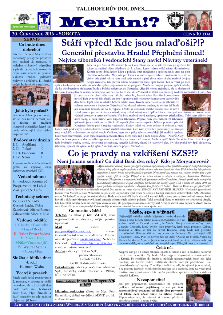 _____________________________TALLHOFERŮV DOL DNES______________________________ Merlin!? 30. ČERVENCE 2016 - SOBOTA SERVIS Co bude dnes dobrého? Krčma u Veselé Mileny dnes naposledy poskytne prostory pro snídani 2. turnusu, v poledne si kuchyň odpočine a přejde do našich rukou. A první naše večeře se ponese v duchu tradiční gulášové polévky a chlebíku. K druhé večeři bude chléb s paštikou. Jaké bylo počasí? Sice stále lehce poprchávalo, ale to nás trápit nemusí, my se těšíme na tradiční slunečné počasíčko, které nás bude následující dva týdny doprovázet! Bodový stav družin 1. I. Angličané 2. II. Poláci 3. III. Francouzi 4. IV. Němci 1 0 0 1 V jakém oddíle je Váš táborník zjistíte na seznamu, který stáhnete na stránkách SpT. Vedení tábora: Hl. vedoucí: Komár :-) Progr. vedoucí: Labuš Zást. pro TS: Láďa Technický sektor: Vedoucí TS: Láďa Kuchař: Láďa, Pískle Zásobovač: Michal,Roman Zdravotník: Máca + Niki Vedoucí oddílů: I. Chackal+Panchelka +Lúca+Rocki II. Haše+Error+Sedma III. Máca+Tony +Niki+Vitalinea/Jíťa IV. Wydra+Syréna +Morče+Pat Služba a hlídka dne: 4. oddíl Huliman: Wydra Včerejší prasáci: Pátek patřil ještě prasátkům z 2. turnusu, v sobotu se příliš neboduje, ale již zítřejší den bude patřit naší bodovací četě! Myš, Plyš, Šmudla a další prasačky se zde začnou objevovat již brzy! CENA 10 TDA Stáří vpřed! Kde jsou mlaďoši?!? Generální přestavba Hradu! Přeplnění ihned! Nejvíce táborníků i vedoucích! Stany navíc! Návraty veteránek! Jsme tu pro Vás již 26. rokem! Je to k neuvěření, ale je to tak. Noviny již vychází 12. rokem a tradiční videa shlédnete již 3. rokem. Letos máme velký návrat do minulosti. Komár se po dvou letech klidu a pohody opět (nečekaně a spíše nuceně) vrací na post hlavního vedoucího. Mája nás pro letošek opustí a vyrazí nabírat zkušenosti na stáž do ciziny. Ale příští rok se nám snad opět navrátí v plné síle a kráse. A aby tradiční dvojice nebyla narušena, tak pravou rukou Komárovou bude opět Labuš. Ten se vrací po roce zpět z kuchyně a bude nám na celé dva týdny připravovat super program. Morče se naopak přesune zpět k oddílu, ale ku všeobecnému překvapení bude z Polska emigrovat do Německa. „Sice již nejsou nejmladší, ale ty zkušenosti fakt mají k nezaplacení, nevím, nevím, kdo jiný než oni by to měl dělat,“ nechal se slyšet náš přestárlý tradiční komentátor Haše. „No já bych tam ale chtěl vidět taky někoho mladšího, hlavně toho hlavního komentátora novin! Tam by to už fakt chtělo změnu!“ oponoval náš novodobý komentátor táborového dění Srna. Opět jsme nezaháleli během celého roku. Kromě super srazů se na tábořišti ve velkém pracovalo a budovalo. Zejména Hrad doznal takovou změnu, že většina lidí bude jen nevěřícně koukat, jak to tu vypadá. Došlo ke zbourání starého skladu, kde se nově získal prostor pro nová okna a vchod, který získal krásný nový SpT-schůdek. Kuchyně má přistavěné zázemí, nové výdejní prostory a opravený komín. Vše bylo tradičně nově natřeno, opraveno, přeskládáno. Také nám přibyly dva nové stany, a tudíž máme větší kapacitu táborníků. Poprvé nám jede celkem 70 táborníků (přestože jsme chtěli pouze 60), kteří zaplnili plánovanou kapacitu během pouhých pár dní! K nejvíce dětem patří i nejvíce vedoucích. Každý oddíl má letos celkem 4 vedoucí a tudíž každý bude pod stálým drobnohledem. Kromě starších táborníků, kteří nám vyrostli v praktikanty, se nám po roce vrací Jíťa a dokonce po sedmi letech Vitalinea, které se v půlce tábora prostřídají. Již tradiční změnou bude post zdravotníka. Letos bude hlavním léčitelem Máca, který bude mít k ruce novou Žábu – Niki . Celý tábor se letos ponese v duchu velké výpravné etapové hry na motivy středověké Anglie a rytířů Kulatého stolu. Dále nás čeká opět řada kvalitních cechů, sportů, inovovaná petrachtace, kancelář LaKom, slavný 18. táborový ples, 19. olympijské hry SpT, diskotéky, táboráky, zpívání při kytaře, velký výlet. A možná, možná přijde i Slimouš… Co je pravdy na vzkříšení SZS?!? Není Johann senilní? Co dělal Basil dva roky? Kdo je Morganovová? „Mým národům! Zlomeny bolem závažných informací stojí jednotky Sekce zvláštních služeb (SZS) před nelehkým úkolem, jehož zdar či nezdar rozhodne o další existenci nebo neexistenci nás všech. Před dvěma lety byly jednotky rozpuštěny a pouze hrstka nás pokračovala v pátrání. Nyní nastal čas, povolat vás, všechny chrabré ženy a pár zbylých mužů, zpět do služby. Připojit se ke svému národu – věrným a vítězným Angličanům, Polákům, Francouzo-Ukrajincům a v neposlední řadě pak Johannovo milým Germánům. Pomoci zmařit velice nebezpečný plán doktorky Morganovové a jejich kompliců. Očekávám vás, všechny agenty SZS v sobotu 30. srpna 2016 na tajné základně s kódovým označením Tallhoferův Dol přesně v 17 hodin! Basil von Wenceslas, prezident SZS“ Poslední zprávy hovoří o zvláštních věcech! Na scénu se vrací slavná SEKCE ZVLÁŠTNÍCH SLUŽEB! Vysloužilí generálové Johann von Marsch a Basil Wenceslas se po letech odpočinku opět vrací na scénu a hledají staronové dobrovolníky SZS! Aktuálně máme 70 žadatelů o vstup do aktivní služby! Bude to ale stačit?!? Stačit vlastně k čemu? Stále máme pouze skromné informace, které hovoří o doktorce Morganovové, která zmizela během jejích tajných pokusů. Také prosakují fámy o změnách ve středověké Anglii, kde kouzelník Merlin není tím slavným kouzelníkem, ale pouhým poskokem a slavný král Artuš se chová jako hejsek na dvoře svého otce Ute