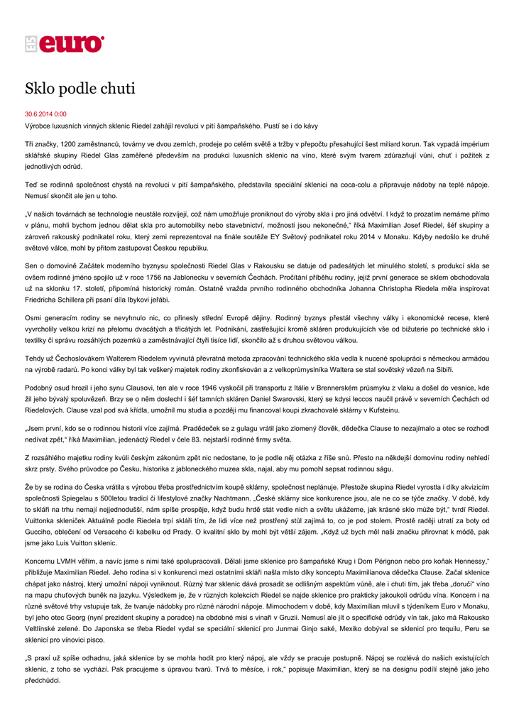 Sklo podle chuti 30.6.2014 0:00 Výrobce luxusních vinných sklenic Riedel zahájil revoluci v pití šampaňského. Pustí se i do kávy Tři značky, 1200 zaměstnanců, továrny ve dvou zemích, prodeje po celém světě a tržby v přepočtu přesahující šest miliard korun. Tak vypadá impérium sklářské skupiny Riedel Glas zaměřené především na produkci luxusních sklenic na víno, které svým tvarem zdůrazňují vůni, chuť i požitek z jednotlivých odrůd. Teď se rodinná společnost chystá na revoluci v pití šampaňského, představila speciální sklenici na cocacolu a připravuje nádoby na teplé nápoje. Nemusí skončit ale jen u toho. „V našich továrnách se technologie neustále rozvíjejí, což nám umožňuje proniknout do výroby skla i pro jiná odvětví. I když to prozatím nemáme přímo v plánu, mohli bychom jednou dělat skla pro automobilky nebo stavebnictví, možnosti jsou nekonečné,“ říká Maximilian Josef Riedel, šéf skupiny a zároveň rakouský podnikatel roku, který zemi reprezentoval na finále soutěže EY Světový podnikatel roku 2014 v Monaku. Kdyby nedošlo ke druhé světové válce, mohl by přitom zastupovat Českou republiku. Sen o domovině Začátek moderního byznysu společnosti Riedel Glas v Rakousku se datuje od padesátých let minulého století, s produkcí skla se ovšem rodinné jméno spojilo už v roce 1756 na Jablonecku v severních Čechách. Pročítání příběhu rodiny, jejíž první generace se sklem obchodovala už na sklonku 17. století, připomíná historický román. Ostatně vražda prvního rodinného obchodníka Johanna Christopha Riedela měla inspirovat Friedricha Schillera při psaní díla Ibykovi jeřábi. Osmi generacím rodiny se nevyhnulo nic, co přinesly střední Evropě dějiny. Rodinný byznys přestál všechny války i ekonomické recese, které vyvrcholily velkou krizí na přelomu dvacátých a třicátých let. Podnikání, zastřešující kromě skláren produkujících vše od bižuterie po technické sklo i textilky či správu rozsáhlých pozemků a zaměstnávající čtyři tisíce lidí, skončilo až s druhou světovou válkou. Tehdy už Čechoslovákem Walterem Riedelem vyvinutá převratná metoda zpracování technického skla vedla k nucené spolupráci s německou armádou na výrobě radarů. Po konci války byl tak veškerý majetek rodiny zkonfiskován a z velkoprůmyslníka Waltera se stal sovětský vězeň na Sibiři. Podobný osud hrozil i jeho synu Clausovi, ten ale v roce 1946 vyskočil při transportu z Itálie v Brennerském průsmyku z vlaku a došel do vesnice, kde žil jeho bývalý spoluvězeň. Brzy se o něm doslechl i šéf tamních skláren Daniel Swarovski, který se kdysi leccos naučil právě v severních Čechách od Riedelových. Clause vzal pod svá křídla, umožnil mu studia a později mu financoval koupi zkrachovalé sklárny v Kufsteinu. „Jsem první, kdo se o rodinnou historii více zajímá. Pradědeček se z gulagu vrátil jako zlomený člověk, dědečka Clause to nezajímalo a otec se rozhodl nedívat zpět,“ říká Maximilian, jedenáctý Riedel v čele 83. nejstarší rodinné firmy světa. Z rozsáhlého majetku rodiny kvůli českým zákonům zpět nic nedostane, to je podle něj otázka z říše snů. Přesto na někdejší domovinu rodiny nehledí skrz prsty. Svého průvodce po Česku, historika z jabloneckého muzea skla, najal, aby mu pomohl sepsat rodinnou ságu. Že by se rodina do Česka vrátila s výrobou třeba prostřednictvím koupě sklárny, společnost neplánuje. Přestože skupina Riedel vyrostla i díky akvizicím společnosti Spiegelau s 500letou tradicí či lifestylové značky Nachtmann. „České sklárny sice konkurence jsou, ale ne co se týče značky. V době, kdy to skláři na trhu nemají nejjednodušší, nám spíše prospěje, když budu hrdě stát vedle nich a světu ukážeme, jak krásné sklo může být,“ tvrdí Riedel. Vuittonka skleniček Aktuálně podle Riedela trpí skláři tím, že lidi více než prostřený stůl zajímá to, co je pod stolem. Prostě raději utratí za boty od Gucciho, oblečení od Versaceho či kabelku od Prady. O kvalitní sklo by mohl být větší zájem. „Když už bych měl naši značku přirovnat k módě, pak jsme jako Luis Vuitton sklenic. Koncernu LVMH věřím, a navíc jsme s nimi také spolupracovali. Dělali jsme sklenice pro šampaňské Krug i Dom Pérignon nebo pro koňak Hennessy,“ přibližuje Maximilian Riedel. Jeho rodina si v konkurenci mezi ostatními skláři našla místo díky konceptu Maximilianova dědečka Clause. Začal sklenice chápat jako nástroj, který umožní nápoji vyniknout. Různý tvar sklenic dává prosadit se odlišným aspektům vůně, ale i chuti tím, jak třeba „doručí“ víno na mapu chuťových buněk na jazyku. Výsledkem je, že v různých kolekcích Riedel se najde sklenice pro prakticky jakoukoli odrůdu vína. Koncern i na různé světové trhy vstupuje tak, že tvaruje nádobky pro různé národní nápoje. Mimochodem v době, kdy Maximilian mluvil s týdeníkem Euro v Monaku, byl jeho otec Georg (nyní prezident skupiny a poradce) na obdobné misi s vinaři v Gruzii. Nemusí ale jít o specifické odrůdy vín tak, jako má Rakousko Veltlínské zelené. Do Japonska se třeba Riedel vydal se speciální sklenicí pro Junmai Ginjo saké, Mexiko dobýval se sklenicí pro tequilu, Peru se sklenicí pro vínovici pisco. „S praxí už spíše odhadnu, jaká sklenice by se mohla hodit pro který nápoj, ale vždy se pracuje postupně. Nápoj se rozlévá do našich existujících sklenic, z toho se vychází. Pak pracujeme s úpravou tvarů. Trvá to měsíce, i rok,“ popisuje Maximilian, který se na designu podílí stejně jako jeho předchůdci. Od Koly ke křížové výpravě Byl tak i u toho, když se Riedel pustil do výroby sklenice pro cocacolu. Cel