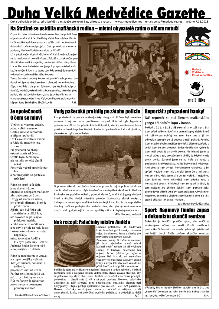 Duha Velká Medvědice Gazette Duha Velká Medvědice, sdružení dětí a mládeže pro volný čas, přírodu, a recesi. www.medvedice.net email: [email protected] vydáno 7.11.2013 Na Strážné se usídlila mafiánská rodina – místní obyvatelé zatím o ničem netuší O prvním listopadovém víkendu se na Strážné poblíž Brna objevila mafiánská famílie Duhy Velké Medvědice. Desítka účastníků a pětice vedoucích zažila další neočekávaná dobrodružství v rámci projektu Get up! realizovaného za podpory Nadace Vodafone a dotace MŠMT. Už v pátek večer dostali všichni mafiánská jména, kterými se pak oslovovali po celý víkend. Taktéž v pátek večer postihla Rodinu veliká tragédie, zemřel starý Don Vito, hlava klanu. Nezanechal nástupce, jen pokyny pro následovníky, že novým kápem se stane ten, kdo se nejlépe osvědčí v dovednostech mafiánského kodexu. Tento šestnácti bodový kodex má prověřit schopnosti budoucího kápa ve všech směrech ohledně vedení rodiny. Kápo musí být znalý praní špinavých peněz, likvidaci protivníků, krádeží, vaření a distribuce perníku, skrývání před policií, ale i takových věcech, jako je uvázání kravaty. Nakonec se poslední hrou Vyloupení banky stala novým kápem Jane Smith (Eva Zbožínková) R.H. Ze společnosti: O čem se mluví V pátek to všechno začalo, jedno velké neznámo. Cestou jsme se seznámili a přitom i pobavili. Do České nás vláček zavezl a Ráďa do tmavého lesa zavedl. Při příchodu do chaty, ostatní na nás už čekali. Světlo bylo, teplo bylo, ale na jídlo se ještě chvíli čekalo. Po skvělé večeři proběhlo pár her a potom rychle do postele a spát jen! Ráno po smrti šéfa šéfů, jsme dostali výzvu: Staňme se nejlepším mafiánem ,tím zabereme celý den. Drogy už máme za sebou, jen převalit diamant, který je přede mnou. Zjistit, kdo byl fízl a kdo mafián byla těžká hra, ale nakonec se policajtka prásknout nedala. Vrahů máme ve městě moc a za chvíli přijde na řadu losos. Lososa nám všemocné vody neposlaly, místo toho nám Anděl s kuchyní palačinky usmažili. Jedenáct hodin jsme tu měli a do postýlek už ulehali. Ráno se moc nechtělo vstávat a z teplé postýlky vylézat. Teď jen snídání, bodování a uklízení, protože čas nás už uhání. Pár her se stihnout ještě dá, pak už jen batohy na záda. Být mafiánem je těžká věc, proto na cestu dostaneme pořádný žvanec! Hanka Rákosníková, účastnice Vody pašeráků prořídly po zátahu policie Reportáž z přepadení banky! Pro podezření na prudce zvýšený výskyt drog v okolí Brna byl proveden výzkum, který se tímto problémem zabýval. Bohužel byla hypotéza potvrzena a případ byl předán kriminální policii, která si nedávala na čas a pustila se hned do práce. Hodně dlouho jim pachatelé utíkali a skrývali se, ale nakonec byl zdroj odhalen. O prvním víkendu letošního listopadu provedla tajná policie zátah na dlouho sledované místo. Byla to náročná, ale úspěšná akce! Ve Strážné na Brněnsku se podařilo odhalit, pomocí dealerů, mafiánský gang složený hned z několika složek různého původu. Spolupráce složek ruských, italských a amerických mafiánů byla vynikající natolik, že se nepodařilo všechny zločince pochytat do dnešního dne, ale bylo výrazně omezeno množství drog dostávajících se do republiky a tím i k obyčejným občanům. Míša Motlová, vedoucí Náš recept: Palačinky mistra Anděla Budeme potřebovat: 15 hladových krků, bezedný pytel mouky, hromadu vajec, barel mléka, krávu a slepice pro pravidelné doplňování surovin Pracovní postup: S vařením začneme již brzo odpoledne, méně zdatní kuchaři nechť začnou již při východu slunce. V kuchyni nalezneme ten největší hrnec (ideální je bojler o objemu 100 l) a do něj smícháme všechny výše uvedené suroviny kromě krávy a slepic tak, aby nám vzniklo ne příliš husté, ani ne příliš tekuté těsto. Pakliže je těsta málo, řídíme se heslem "moukou a vodou nešetřit". V pánvi rozpálíme olej a nalijeme tenkou vrstvu těsta, kterou zavčas otočíme, aby se palačinka opekla z obou stran. Jestliže se palačinka na pánvi přichytí, pohrozíme jí pistolí ráže č. 45 a až poté otočíme. Hotovou palačinku umístíme na talíř střežený před nedočkavými strávníky alespoň pěti bodyguardy. Stejný postup opakujeme pro dalších 1 253 829 palačinek. Hotové palačinky servírujeme dětem a pořádně si užijeme ty tři nanosekundy klidu, než dožvýkají poslední palačinku a dožadují se další várky. Š.Š. Náš reportér se stal členem mafiánského gangu při nočním lupu v bance. Poklad... 2.11. v 9:18 a 53 sekund, ano stál jsem. Stál jsem před velkými dveřmi a vnímal kapky deště, které mi stékaly po obličeji na zem. Byla tma a já byl odhodlán vstoupit do té budovy a najít poklad. Potichu jsem otevřel dveře a našláp dovnitř. Šel jsem kupředu a vydal jsem se po schodech. Srdce tlouklo tak rychle že jsem měl pocit že za chvíli pukne. Ale hlavně jsem se musel držet u zdi, protože jsem věděl, že kdykoli muže projít polda. Zasunul jsem se na hoře do koutu a poslouchal kroky policistu. Každý byl v jedné místnosti. Ale i přes to jsem vyrazil. Pomalu jsem nakračoval a šel vpřed. Neviděl jsem nic ale cítil jsem že v místnosti nejsem sám. Klekl jsem si a vyrazil vpřed. A najednou jsem šáhl na nohu. Okamžitě jsem oddělal ruku a nenápadně couval. Přitisknul jsem se ke zdi a dělal, že tam nejsem. Po chvilce čekání jsem pomalu začal prohledávat skříně. Ano byl jsem polapen. Chytili mne. Najednou se rožlo a všichni s usměvem šli dolu ale já si stejně připadal jak pravej mafián... Jája Hausnerová, účastnice Sport: Napínavý finální zápas v dekomlatu skonč
