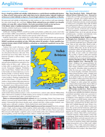 Angličtina Anglie ŠIRŠÍ NABÍDKU KURZŮ A STUDIA NAJDETE NA WWW.INTACT.CZ CO ŘÍKAJÍ NAŠI ZÁKAZNÍCI? ANGLICKY SE MLUVÍ V ANGLII!!! Mgr. Ilona Benešová, škola - Sidmouth International School, Sidmouth, kurz - General+6: „V Sidmouthu se mi líbilo, protože jsem cíleně hledala destinaci v přírodě, což se splnilo dokonale. Ve Při sestavování naší nabídky ve Velké Británii se vždy snažíme o to, aby si svůj kurz našli nejen středoško- škole nám vycházeli vstříc, nabídli spoustu společláci nebo mladí dospělí, ale i zralí klienti. Některé školy nabízejí kurzy pro mládež i pro dospělé, ných aktivit. Výuka byla náročná, úroveň výuky byla na slušné úrovni, promyšlená. Bylo vidět, že lektoři můžete vzít svoje děti s sebou! Každý z Vás bude samozřejmě chodit na jiný typ kurzu. jsou zvyklí pracovat s klienty z různých zemí - nastuTYTO ŠKOLY JSOU V NAŠEM KATALOGU OZNAČENY MODRÝM RŮŽKEM. dovali si příslušné reálie, používali zajímavé aktiviNabídku průběžně doplňujeme a každý rok obměňujeme, na www.intact.cz je více než dvojnásobný ty, pracovali s tématy, na kterých jsme se dohodli. počet kurzů než v tomto katalogu. Byla jsem spokojena i s ubytováním a stravou. Shr• Jestliže jste v katalogu INTACTu nenašli kurz podle svých představ, pošlete nám, prosím, email nebo nutí: vzhledem k tomu, že mi vše vyšlo tak, jak jsem nám zavolejte a sdělte svoje požadavky, určitě Vám dokážeme vyhovět. Navštívili jsme osobně více než si představovala - v mnohém i nad očekávání - mohu 200 anglických škol, takže Vám můžeme podat opravdu solidní informace. jen pochválit. Za sebe dávám jedničku s *.“ • Prakticky všechny školy v naší nabídce jsou uznány Britskou radou. Uznání Britské rady považujeme Mgr. Jana Kaššáková, škola - English in Margaza víceméně věrohodnou visačku kvality. Většina škol z naší nabídky také patří do asociace English UK. te, Margate, kurz - Standard: „Dobrý den, chtěla INTACT navštěvuje pravidelně od roku 1994 jako jediná CK působící v České republice kon- bych Vám jménem všech mých kolegyň, které se se traktační britský veletrh STUDY WORLD a zúčastňuje se následných inspekčních cest po člen- mnou zúčastnily jazykového kurzu v Margate, poděkovat. Všem se nám velice líbilo. Škola je malá, s ských školách. úžasnými učiteli a báječným programem pro • Podávat Vám úvodní informace o Anglii studenty. Děkuji Vám, že jste vše tak narychpovažujeme tak trochu za zbytečné. Většina lo dokázali zařídit. Vše klaplo tak jak bylo naz Vás v Anglii již byla nebo máte velmi spolehliplánováno. Ubytování bylo perfektní a vše se vé a dost přesné informace o této zemi. Víme, nám líbilo. Já jsem uvařila své rodině knedlíky se zelím a masem a dala jsem ochutnat že kromě typu kurzu hraje velkou roli při rozi učitelům. Vše vyšlo ve školních novinách. Mě hodování charakter a velikost města, v němž osobně bylo líto, že musím jet tak brzy domů.“ škola působí. Kateřina Vlasáková, škola - UIC English BriEdinburgh • Londýnské školy jsme vybírali tak, abyste ghton, Brighton, kurz - Morning 20: „Můj nemuseli ztrácet zbytečně čas cestováním z hosNewcastle pobyt v Brightonu byl nezapomenutelný. Brititelské rodiny do školy a zpět - většinou jsou ghton sám o sobě je jedno z nejkouzelnějších to školy sídlící na předměstích jako jsou Greměst v Anglii a výhled na oceán se člověku jen York enwich, Hampstead, Highgate, Wimbledon tak neomrzí. Atmosféra města je podmanivá, Leeds Hull nebo Crystal Palace. Studenti mířící do těchuličky the Lanes jsou osobní, klikaté a barevManchester né a budí atmosféru maloměsta. Dominantou to škol častěji volí intenzivnější kurzy a na lonCambridge Liverpool města je Royal Pavillion, palác, u kterého jsme dýnské památky si nechávají víkendy. NeznaOxford a Canterbury s přáteli pořádali nejeden piknik. UIC Brighmená to však, že bychom diskriminovali školy Wheatley Worcester ton je špičková škola. Se všemi učiteli jsem se v centru Londýna, v katalogu najdete školy kouBristol skamarádila a veškerý personál je velice ochotLondýn Margate sek od Oxford Street, v St. John‘s Wood, BloBath Salisbury ný a usměvavý za každého anglického počaWinchesterRamsgate omsbury. Mnozí studenti chtějí méně intenzivní Sidmouth sí. Nejlepší na celém pobytu byli spolužáci Exeter kurzy v centrálně situovaných školách, protože Hastings Torquay a doprovodný program školy. Nyní se těším na Swanage Worthing Eastbourne po dopolední výuce chtějí poznávat Londýn. návštěvy Prahy mých brightonských přátel.:)“ Paignton Bournemouth Brighton • Školy v přímořských letoviscích jako je Mgr. Alena Smolíková, škola - Academy Jersey SJW Londýn, Londýn kurz - Main Low SeaBrighton nebo Bournemouth či Torbay bývají son: „Na dva týdny na jazykový kurz do SJW v létě více zaplněny, víme však, že naši vnitrodo Londýna jsem odjížděla bez jakékoliv zkušenosti zemští studenti dávají přednost pobytu u moře, ať už kvůli slunci, vzduchu nebo zábavě. Některé školy s podobným způsobem výuky a jen s precizním itisídlící v letoviscích se zaměřují na mladší studenty, jiné se orientují na zralejší a více motivované klienty. nerářem z Intactu. Dala jsem na výborné referenNabízíme i manažerské školy sídlící v přímořských letoviscích. ce kolegyně s touto agenturou a byla jsem nadše• Školy ve vnitrozemských historických městech jako jsou Cambridge, Oxford, York, Exeter mívají ná. Lidi z Intactu mi zařídili letenky, ubytování, dovětšinou vyrovnaný počet studentů během celého roku a vyhledávají je spíš motivovanější a dospě