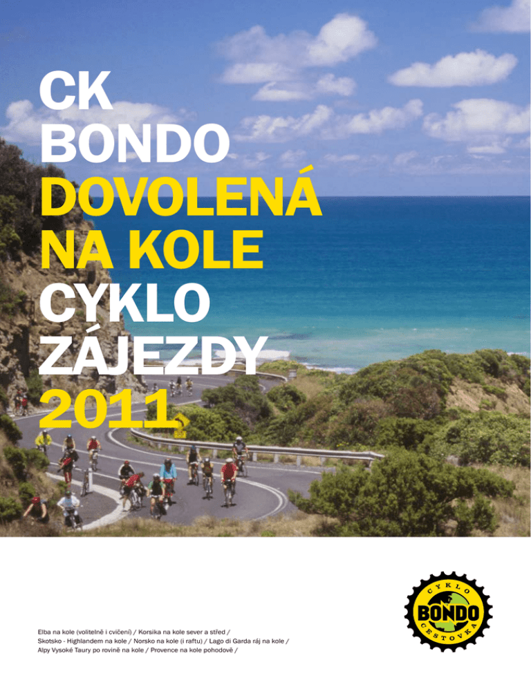 CK BONDo dovolená na kole Cyklo zájezdy 2011 Elba na kole (volitelně i cvičení) / Korsika na kole sever a střed / Skotsko - Highlandem na kole / Norsko na kole (i raftu) / Lago di Garda ráj na kole / Alpy Vysoké Taury po rovině na kole / Provence na kole pohodově / Vítejte v BONDO cyklodovolené Vážení přátelé, milí zákazníci, Lákají vás dálky, objevování nepoznaného, cestování? Chcete strávit aktivní dovolenou nenáročnou cykloturistikou? Naše cestovní kancelář BONDO se specializuje na zájezdy na kole, především po Evropě. Cestujeme za přírodou, místní kulturou i historií. Snažíme se, abyste strávili dovolenou plnou krásných a neopakovatelných zážitků. Na jaře jedeme na ELBU a KORSIKU. Elba je malý voňavý ostrov, kde projížďky na kole jsou stejně pohodové jako koupání v moři. A Korsika? Drsná, ale hřejivá s mnoha horskými soutěskami a potoky vybízejícími ke koupání, stejně jako nádherně modré moře. V létě se chystáme do SKOTSKA a NORSKA. Ve Skotsku projedeme Highland a ostrov Sky, uvidíme mnoho skotských hradů. Perlou našich cyklozájezdů je Norsko na kole, budeme se projíždět kolem norských fjordů a necháme se uchvátit přírodními krásami vodopádů, jezer a hor. Nejblíže k velkým horám je RAKOUSKO, kde si projedeme Alpské cyklostezky, které, jak zjistíte, jsou kupodivu rovinaté. V ITÁLII, na úpatí Dolomit, strávíme krásnou dovolenou u jezera Lago di Garda a nemusíte se obávat velkých kopců, zvolíte-li lehkou trasu, autobus vás vyveze nahoru a jedete jen dolů. Babí léto je pro cykloturistiku ideální počasí a právě tehdy pořádáme velmi oblíbený zájezd do francouzské PROVENCE. Poznáme její přírodní krásy, historické památky a ochutnáme vynikající červené víno. V září si zopakujeme KORSIKU v barvách pozdního, ale zde ještě hodně teplého léta. Na našich cyklozájezdech nás provází podpůrný tým průvodců a samozřejmě autobus, který nás spolu s koly nejen převáží do ciziny, ale bývá i naším doprovodným vozidlem při denní cykloturistice. Je-li tu cokoliv, co potřebujete vědět, prostě nám zavolejte do naší kanceláře na 475 216 452. A jste-li z Ústí nad Labem, stavte se přímo v kanceláři, třeba jen na šálek kávy. Těšíme se na vás na BONDO zájezdech 2011 ! Štěpán, Roman, Blanka a BONDO tým “Milujeme jízdu na kole a chceme se o zážitky z cest dělit s vámi!” Proč s CK BONDO? Chceme, abyste se na své dovolené cítili co nejlépe, abyste se bavili, relaxovali a načerpali nových sil. A v čem se lišíme? Pohodová cykloturistika, i sportovní výzva! U nás si užijete nenáročnou a pohodovou cykloturistiku, ale zároveň máme program pro náročnější cyklisty. Jezdí s námi i rodiny s většími dětmi, začínající i zdatnější cykloturisté, všichni mají na výběr lehkou, střední nebo těžší variantu. Trasy jsme předem vyzkoušeli, naši průvodci jsou součástí průzkumného týmu vždy, když připravujeme novou destinaci. Jezdíte s cyklonavigací GPS Zapůjčíme vám zdarma GPS cyklonavigaci. Jedete-li neznámou krajinou, musíte tu a tam sáhnout po mapě. Kromě tištěné mapy s denními cyklotrasami dostanete navíc GPS cyklonavigaci. Připevníte na kolo a jedete podle předem nahrané trasy. (Vždy jedna navigace pro skupinky 3-4 osob). Ubytování v postýlce! Ve stanech nespíme. Ubytování je pohodlné v postýlce apartmánu, chatičky či karavanu, s vybavenou kuchyňkou. Nestěhujeme se každý den Na jednom místě trávíme více dnů, někdy i celý zájezd. Je to pohodlnější a můžeme tak více poznat místní kraj. Přesto díky doprovodnému autobusu máme široký záběr. Hosteska v autobusu Chceme Vám zpříjemnit cestování, a proto když jedete autobusem, dostáváte zdarma kávičku a sušenky. Chceme, abyste se bavili I my máme rádi hry a rádi se bavíme a ten kdo chce, ať se přidá! S Bondem můžete hledat klíče od BONDO pokladu a věřte, štěstí přeje jak odvážným, tak důvtipným, stačí prostě přijet první na místo úkrytu a trochu pátrat. Vybavení pro vás Něco jste nesehnali nebo zapomněli? Máme pro vás náhradní díly na kolo (lepení, duše, dráty aj.), potravinové doplňky (iontové nápoje, tyčinky aj.), výběr z cyklistické výbavy (pláštěnky, rukavičky, láhve aj. - seznam je dlouhý), to vše vozíme s sebou a je Vám k dispozici, budete-li chtít dokoupit. Víte, co je v ceně V ceně jsou vždy služby průvodce, základní pojištění léčebných výloh, doprava osob a kol, ubytování. Každý zájezd má v popisu přesné detaily. A co si můžete přikoupit? BONDO balíček potravin polopenze, zapůjčení kola, pojištění storna zájezdu, věcí a úrazu, ubytování s menším počtem osob na apartmán/chatičku. Kromě toho můžete na zájezdu dokoupit vše z našeho skladu cyklo a potravinových doplňků. Slevy Ušetříte, když využijete naše slevy: • Věrnostní • Studentské • Dětské • Skupinové • Za včasnou platbu Informujte se na www.bondo.cz nebo zavolejte 475 216 452 CK BONDO / Cyklozájezdy 2011 1 Cyklozájezdy po Evropě s CK BONDO, to je: 2 Cykloturistika nenáročná i sportovní výzva! Každý den je na výběr nenáročná trasa, ale jsou k dispozici i střední nebo více náročnější trasy. Cykloturistika s GPS navigací Zdarma zapůjčujeme skupinkám CYKLONAVIGACI GPS, ve které jsou všechny trasy předem nahrané. Cykloturistika poznávací Známe místopis a navedeme vás na zajímavá přírodní, kulturní či historická místa. Cykloturistika zábavná Rádi se bavíme, můžete soutěžit v hledání pokladu BONDO! Cykloturistika relaxační Nepočítáme jen kilometry, v programu je vždy prostor pro pohodu a odpočinek. Norsko Cyklodestinace 2011 Skotsko Highland Elba na kole (volitelně i cvičení) 13. - 22