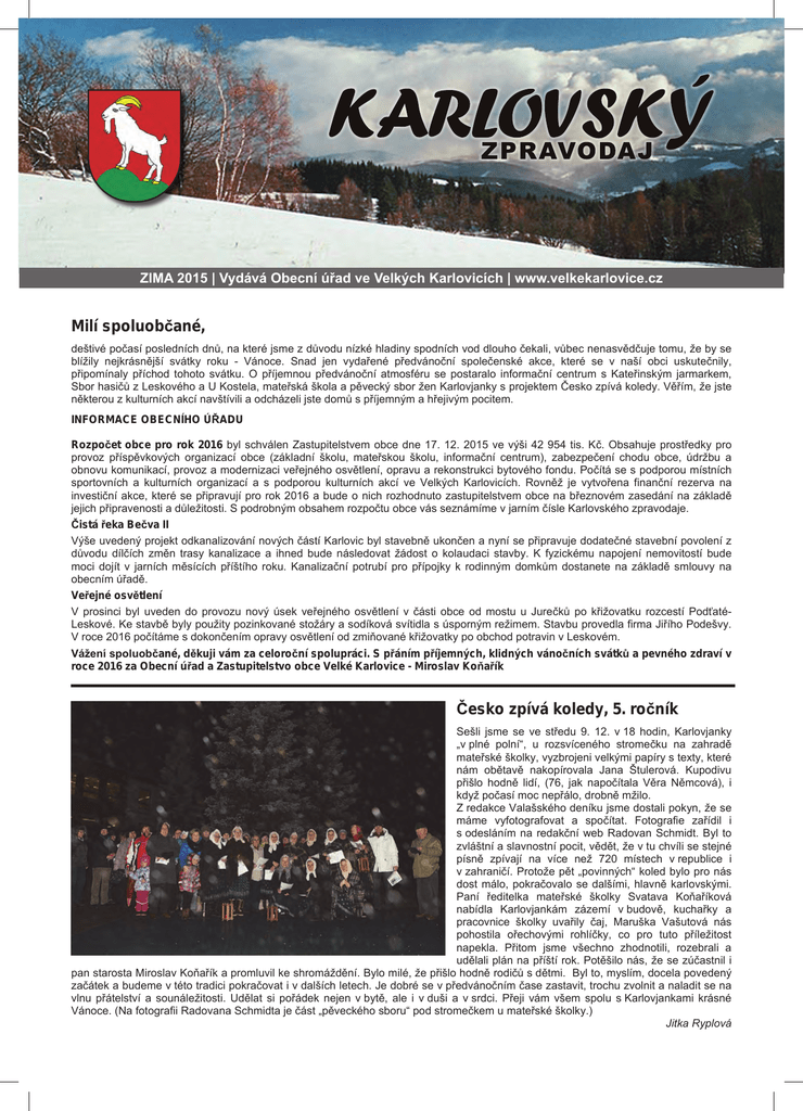 KARLOVSKÝ ZPRAVODAJ ZIMA 2015 | VydáváObecní Obecníúřad úřad ve ve Velkých Velkých Karlovicích ZIMA 2015 | Vydává Karlovicích| www.velkekarlovice.cz | www.velkekarlovice.cz Milí spoluobčané, deštivé počasí posledních dnů, na které jsme z důvodu nízké hladiny spodních vod dlouho čekali, vůbec nenasvědčuje tomu, že by se blížily nejkrásnější svátky roku - Vánoce. Snad jen vydařené předvánoční společenské akce, které se v naší obci uskutečnily, připomínaly příchod tohoto svátku. O příjemnou předvánoční atmosféru se postaralo informační centrum s Kateřinským jarmarkem, Sbor hasičů z Leskového a U Kostela, mateřská škola a pěvecký sbor žen Karlovjanky s projektem Česko zpívá koledy. Věřím, že jste některou z kulturních akcí navštívili a odcházeli jste domů s příjemným a hřejivým pocitem. INFORMACE OBECNÍHO ÚŘADU Rozpočet obce pro rok 2016 byl schválen Zastupitelstvem obce dne 17. 12. 2015 ve výši 42 954 tis. Kč. Obsahuje prostředky pro provoz příspěvkových organizací obce (základní školu, mateřskou školu, informační centrum), zabezpečení chodu obce, údržbu a obnovu komunikací, provoz a modernizaci veřejného osvětlení, opravu a rekonstrukci bytového fondu. Počítá se s podporou místních sportovních a kulturních organizací a s podporou kulturních akcí ve Velkých Karlovicích. Rovněž je vytvořena finanční rezerva na investiční akce, které se připravují pro rok 2016 a bude o nich rozhodnuto zastupitelstvem obce na březnovém zasedání na základě jejich připravenosti a důležitosti. S podrobným obsahem rozpočtu obce vás seznámíme v jarním čísle Karlovského zpravodaje. Čistá řeka Bečva II Výše uvedený projekt odkanalizování nových částí Karlovic byl stavebně ukončen a nyní se připravuje dodatečné stavební povolení z důvodu dílčích změn trasy kanalizace a ihned bude následovat žádost o kolaudaci stavby. K fyzickému napojení nemovitostí bude moci dojít v jarních měsících příštího roku. Kanalizační potrubí pro přípojky k rodinným domkům dostanete na základě smlouvy na obecním úřadě. Veřejné osvětlení V prosinci byl uveden do provozu nový úsek veřejného osvětlení v části obce od mostu u Jurečků po křižovatku rozcestí PodťatéLeskové. Ke stavbě byly použity pozinkované stožáry a sodíková svítidla s úsporným režimem. Stavbu provedla firma Jiřího Podešvy. V roce 2016 počítáme s dokončením opravy osvětlení od zmiňované křižovatky po obchod potravin v Leskovém. Vážení spoluobčané, děkuji vám za celoroční spolupráci. S přáním příjemných, klidných vánočních svátků a pevného zdraví v roce 2016 za Obecní úřad a Zastupitelstvo obce Velké Karlovice - Miroslav Koňařík Česko zpívá koledy, 5. ročník Sešli jsme se ve středu 9. 12. v 18 hodin, Karlovjanky „v plné polní“, u rozsvíceného stromečku na zahradě mateřské školky, vyzbrojeni velkými papíry s texty, které nám obětavě nakopírovala Jana Štulerová. Kupodivu přišlo hodně lidí, (76, jak napočítala Věra Němcová), i když počasí moc nepřálo, drobně mžilo. Z redakce Valašského deníku jsme dostali pokyn, že se máme vyfotografovat a spočítat. Fotografie zařídil i s odesláním na redakční web Radovan Schmidt. Byl to zvláštní a slavnostní pocit, vědět, že v tu chvíli se stejné písně zpívají na více než 720 místech v republice i v zahraničí. Protože pět „povinných“ koled bylo pro nás dost málo, pokračovalo se dalšími, hlavně karlovskými. Paní ředitelka mateřské školky Svatava Koňaříková nabídla Karlovjankám zázemí v budově, kuchařky a pracovnice školky uvařily čaj, Maruška Vašutová nás pohostila ořechovými rohlíčky, co pro tuto příležitost napekla. Přitom jsme všechno zhodnotili, rozebrali a udělali plán na příští rok. Potěšilo nás, že se zúčastnil i pan starosta Miroslav Koňařík a promluvil ke shromáždění. Bylo milé, že přišlo hodně rodičů s dětmi. Byl to, myslím, docela povedený začátek a budeme v této tradici pokračovat i v dalších letech. Je dobré se v předvánočním čase zastavit, trochu zvolnit a naladit se na vlnu přátelství a sounáležitosti. Udělat si pořádek nejen v bytě, ale i v duši a v srdci. Přeji vám všem spolu s Karlovjankami krásné Vánoce. (Na fotografii Radovana Schmidta je část „pěveckého sboru“ pod stromečkem u mateřské školky.) Jitka Ryplová Z obecní matriky Jubilanti za IV. čtvrtletí 2015 80 let: Alois Sibal, V. K. 300 Rozálie Jurečková, V. K. 897 Eliška Hynková, V. K. 624 Zdenka Podešvová, V. K. 327 Barbora Solanská, V. K. 501 85 let: Vlasta Petřeková, V. K. 145 90 let: Jaroslav Grňa, V. K. 858 Vlasta Janíková, V. K. 63 Viktorie Oravcová, V. K. 683 92 let: Emílie Bukovjanová, V. K. 54 Františka Koňaříková, V. K. 236 Štěpánka Šturalová, V. K. 204 93 let: Pavel Bukovjan, V. K. 54 Všem srdečně blahopřejeme! Zpráva z IC Velké Karlovice 29. 11. 2015 v neděli byl zahájen jako každoročně tradiční Kateřinský jarmark v historickém centru Velkých Karlovic u Karlovského muzea a okolí. Součástí jarmarku byla otevřena výstava Bronislava Kuby z Kerska pod názvem Kouzlo vánoc. Odpoledne proběhla vernisáž již 14 ročníku fotosoutěž Valašská krajina. Celým jarmarečním dnem nás provázela naše moderátorka Bára Šimečková a pro dobrou pohodu pořad hudebně doprovodili muzikanti z CM Staré Gatě, gorolská muzika Bukoň a CM z Velkých Karlovic Kyčerka. S velkým ohlasem byly přivítány děti z Valášku a pěvecký sbor při ZŠ Velké Karlovice. Valašskou atmosféru tohoto kraje zcela navodily naše Karlovjanky svým vystoupením. Děti i dospělí si v chalupě U Orságů nazdobili adventní věnec či na skle namalova