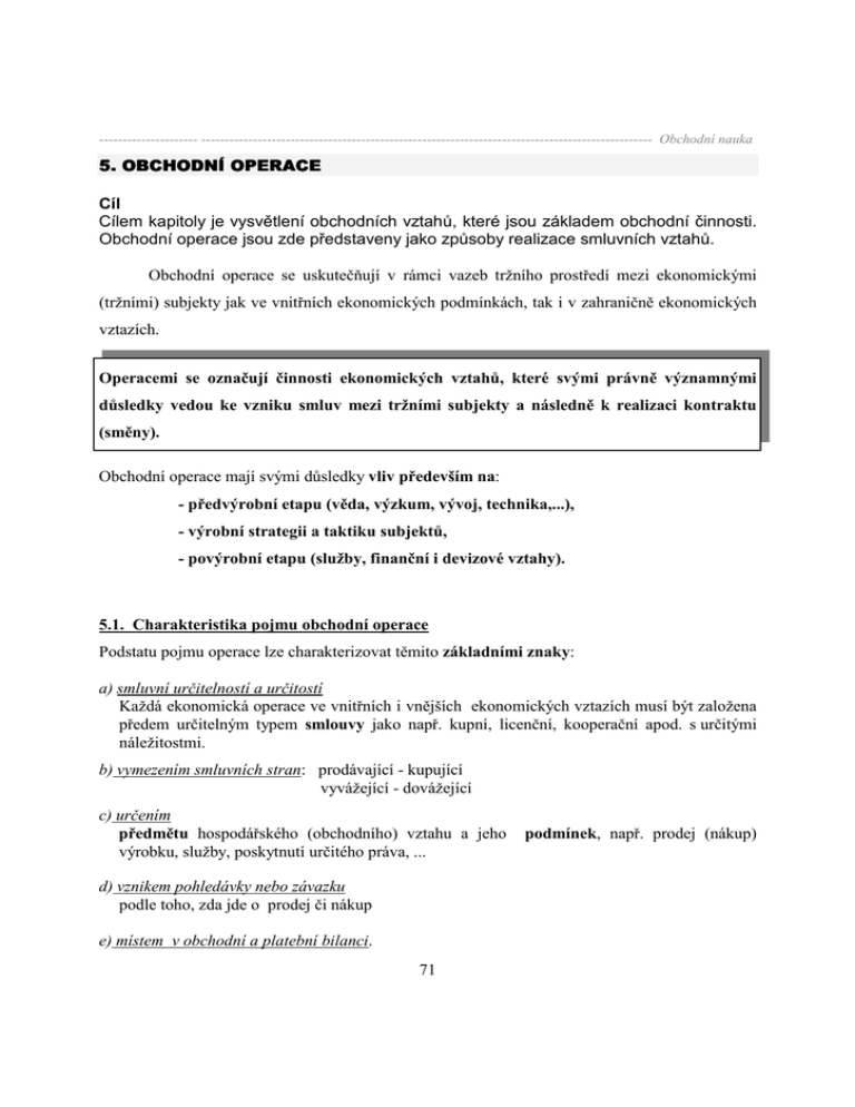 --------------------- ------------------------------------------------------------------------------------------------ Obchodní nauka 5. OBCHODNÍ OPERACE Cíl Cílem kapitoly je vysvětlení obchodních vztahů, které jsou základem obchodní činnosti. Obchodní operace jsou zde představeny jako způsoby realizace smluvních vztahů. Obchodní operace se uskutečňují v rámci vazeb tržního prostředí mezi ekonomickými (tržními) subjekty jak ve vnitřních ekonomických podmínkách, tak i v zahraničně ekonomických vztazích. Operacemi se označují činnosti ekonomických vztahů, které svými právně významnými důsledky vedou ke vzniku smluv mezi tržními subjekty a následně k realizaci kontraktu (směny). Obchodní operace mají svými důsledky vliv především na: - předvýrobní etapu (věda, výzkum, vývoj, technika,...), - výrobní strategii a taktiku subjektů, - povýrobní etapu (služby, finanční i devizové vztahy). 5.1. Charakteristika pojmu obchodní operace Podstatu pojmu operace lze charakterizovat těmito základními znaky: a) smluvní určitelností a určitostí Každá ekonomická operace ve vnitřních i vnějších ekonomických vztazích musí být založena předem určitelným typem smlouvy jako např. kupní, licenční, kooperační apod. s určitými náležitostmi. b) vymezením smluvních stran: prodávající - kupující vyvážející - dovážející c) určením předmětu hospodářského (obchodního) vztahu a jeho výrobku, služby, poskytnutí určitého práva, ... d) vznikem pohledávky nebo závazku podle toho, zda jde o prodej či nákup e) místem v obchodní a platební bilanci. 71 podmínek, např. prodej (nákup) --------------------- ------------------------------------------------------------------------------------------------ Obchodní nauka ekonomické výsledky všech typů operací musí vcházet do obchodní a platební bilance ekonom. subjektů tedy i státu při vnějších ekonomických vztazích. Na přípravě, vzniku a realizaci obchodních operací se podílejí týmy odborníků, kteří by měli být vybaveni obecnými i specifickými znalostmi, zkušenostmi a dovednostmi příslušných úseků a vysokou profesionalitou. 5.2. Hlavní typy operací Obchodní operace lze rozdělit podle těchto hledisek: • podle předmětu: - operace s hmotnými výrobky - operace s nehmotnými výrobky . podle teritorií: - operace v tuzemsku (vnitřní ekonomické vztahy) - operace s partnery - průmyslově vyspělých zemích - rozvojových zemích - bývalých členských zemích RVHP • podle typu smlouvy: - operace kupní (prodejní) podle kupních smluv - operace zprostředkovatelské podle příkazních smluv - operace přepravní podle přepravních smluv • podle pohybu zboží: - operace nákupní a prodejní - operace vývozní a dovozní - operace tranzitní a reexportní, apod. • podle typu obchodu: - operace tradiční - operace netradiční (ve výzkumu) - kooperace • podle vztahu k reprodukčnímu procesu: - operace v oblasti - vědy a výzkumu - výroby - směny - průvodních služeb - samostatných služeb Jednotlivá hlediska jsou v určitých možnostech obchodního styku značně obecná, některá omezující. Přesto nejdokonalejší hledisko na rozdělení operací se jeví podle vztahu k reprodukčnímu procesu. 72 --------------------- ------------------------------------------------------------------------------------------------ Obchodní nauka 5.2.1. Operace v oblasti výzkumu a vývoje ♦ Licenční obchody založené na některém z typ licenčních smluv, jejichž předmětem je poskytnutí práv k využívání chráněných výsledků vědeckovýzkumné činnosti nebo patentů, ochranných známek, chráněných vzorů. Předmětem licence může být i know-how. ♦ Crosslicencing = vzájemná výměna licencí na kompenzačním základě. Vyskytuje se zejména v rychle se vyvíjejících odvětvích průmyslu. ♦ Vědeckotechnická pomoc může být součástí licenční smlouvy nebo být založena smluvně jako součást dodávek strojů, zařízení (investičních celků). Může se engineeringu. poskytovat jako samostatná služba např. v poradenském ♦ Přímá vědecká a výzkumná vývojová součinnost partnerů provozovaná obvykle koprodukcemi nebo společnými podniky. 5.2.2. Operace v oblasti výroby ♦ Zušlechťovací operace jsou založeny na smlouvě o dílo. Lze rozlišit zušlechťovací styk aktivní a pasívní. Zadavatel díla dodá zhotoviteli surovinu (polotovar) k vyššímu stupni finalizace. Zvláštním typem zušlechťovací operace je práce ve mzdě, při které objednatel poskytuje zhotoviteli technické a technologické zařízení, suroviny i materiál a zhotovitel dává pouze živou práci. ♦ Přepracovací operace se vyskytuje jen v oblasti zušlechtění kovu na vyšší ryzost podle přepracovacího kontraktu. ♦ Licenční výroba je založena na zakoupené licenci, operace bývají součástí širších dohod o průmyslové kooperaci. ♦ Koprodukce 73 --------------------- ------------------------------------------------------------------------------------------------ Obchodní nauka tvoří podstatu (jádro) mezinárodní průmyslové kooperace, kde právním základem je smlouva "sui generis" (svého druhu), která zpravidla zastřešuje dílčí dohody mezi kooperujícími partnery. K dílčím dohodám patří smlouvy o dodávkách komponentů, dále smlouvy kupní, montážní, ...apod. ♦ Společné podnikání typu "joint ventures" může vzniknout z předchozí operace podnikatelských dodávek investičních celků. V podstatě se jedná o: - podnikání na základě majetkové účasti. Partneři vytvoří formu spojení na základě vlastnických podílů. - podnikání na základě smlouvy o řízení, kdy se nepředpokládá kapitálová účast partnera, který na základě kontraktu o řízení (man