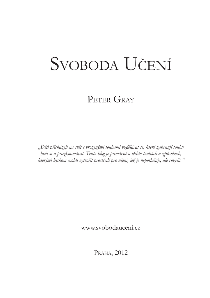 Svoboda Učení Peter Gray „Děti přicházejí na svět s vrozenými touhami vzdělávat se, které zahrnují touhu hrát si a prozkoumávat. Tento blog je primárně o těchto touhách a způsobech, kterými bychom mohli vytvořit prostředí pro učení, jež je nepotlačuje, ale rozvíjí.“ www.svobodauceni.cz Praha, 2012 Originální blog Freedom to Learn naleznete na: www.psychologytoday.com/blog/freedom-learn Vydal: www.scio.cz, s.r.o Překlad: Jiří Košárek Sazba a obálka: Dominik Stroukal ISBN: 978-80-7430-093-6 Obsah Narozeni svobodní: Předmluva ke Svobodě učení. ...............4 Studium vyžaduje svobodu: Úvod k novému blogu o hře, zvědavosti a vzdělávání. .........................................................5 Děti se vzdělávají samy......................................................... 10 Nástin některých důkazů............................................................10 Všichni víme, že je to pravda u malých dětí.............................13 Moudrost lovců a sběračů...........................................................20 Lekce ze Sudbury Valley.............................................................27 Přirozené prostředí pro dětské samovzdělávání: Jak je škola Sudbury Valley jako skupina lovců a sběračů.........................33 Minimálně narušující vzdělávání: Lekce z Indie....................39 Proč bychom měli přestat oddělovat děti podle věku........46 Význam her v zóně nejbližšího vývoje. ....................................46 Unikátní vzdělávací vlastnosti věkově promíchaných her.51 Starší děti jsou vynikajícími vzory, pomocníky a učiteli. .....57 Proč jsou školy takové, jaké jsou..........................................65 Stručná historie vzdělávání.......................................................65 Síly proti zásadním změnám.........................................................75 „Proč studenti nemají rádi školu“ No, proč asi….................82 Sedm hříchů našeho systému nuceného vzdělávání..............86 Je reálná reforma vzdělávání možná? Pokud ano, jak?.......93 Doslov................................................................................. 100 Narozeni svobodní: Předmluva ke Svobodě učení V každém člověku je zakořeněna přirozená touha po svobodě. Na svět přicházíme připraveni a plni dychtivosti s cílem převzít kontrolu nad našimi vlastními životy. Všichni potřebujeme pomoc od ostatních, ale této pomoci chceme využít na základě vlastního úsudku. Pokud se nacházíme v optimálních podmínkách, učíme se rychle, víme komu věřit a komu ne, víme, jak dosáhnout pomoci od ostatních, jak pomáhat těm, kteří to potřebují a jak projevit uznání. Žádostivost a touha poznat okolní svět nás doprovází od narození, chceme zjistit, co jsou zač lidé, kteří nás obklopují a jaké kulturní prostředí po generace budovali. Tuto přirozenou touhu však ničí školní výuka, která nás přesvědčuje o tom, že jsme nekompetentní, že otázky, na které chceme znát odpověď a přání, která si chceme splnit, nejsou podstatná, a že cílem našich životů je podřizovat se těm, kteří nám vládnou. Jsem poctěn a potěšen, že Jiří Košárek přeložil tyto eseje do češtiny a že zařídil jejich vydání v této malé publikaci. Máme důvod k naději! Žijeme nyní ve světě informací, ve kterém již není možné nikoho ukrýt před myšlenkami, racionálními argumenty, filozofiemi a skutečnou historií. Touha porozumět a přemýšlet o věcech jako jedinci prochází znovuzrozením, navzdory zvyšujícím se omezením ve školách. Změna je ve vzduchu. Peter Gray - Shrewsbury, Massachusetts, USA Studium vyžaduje svobodu: Úvod k novému blogu o hře, zvědavosti a vzdělávání Více času ve škole není odpověď. 9. července 2008 Kamkoliv se dnes podíváme, vidíme odborníky a politiky, kteří argumentují ve prospěch restriktivnější školní výuky. Samozřejmě, že nepoužívají slovo “restriktivní”, ale je to v podstatě to samé. Chtějí více standardizovaných testů, více domácích úkolů, více dozoru, delší školní dny, delší školní roky a více sankcí vůči dětem, které jedou na den či dva na rodinnou dovolenou. Toto je oblast, s kterou politici z hlavních stran, na každé úrovni vlády souhlasí. Více školní výuky nebo přísnější školní výuka je lepší než méně. „Školní výuka“ a „vzdělávání“ (které je v současné době často synonymem školní výuky) jsou výrazy, které okolo sebe mají svatozář. Jsou a priori dobré; logikou, kterou běžně slýcháme, nemůže být nic důkazem proti významu školní výuky. Pokud se děti učí, děkujeme školám. Pokud se děti příliš neučí, znamená to, že se potřebují ve školách více učit. Pokud se ekonomice nedaří, musí to být způsobeno nedostatkem úsilí ve školní výuce. Pokud se ekonomice daří, potvrzuje to hodnotu školní výuky a nabádá k tomu, abychom ji ještě zintenzivnili. Pokud se lidské vědomosti rozšiřují stále rychlejším tempem, potom se studenti musí učit více 5 předmětů. Pokud současný svět vyžaduje kritické myšlení, potom ho musíme přidat do dlouhého seznamu věcí, které vyučujeme a testujeme. Pokud věříme, že lidské bytosti mají „více oblastí inteligence“, potom je musíme vyjmenovat a vyučovat každou tuto oblast zvlášť. Pokud si ceníme rovnosti, musíme věřit tomu, že každý by měl studovat stejné osnovy a psát stejné testy, abychom je mohli udělat rovnými (a tím zapomenout na myšlenku našich demokratických zakladatelů, že lidé mohou být rozdílní, přesto v hodnotě rovní). Co se stalo s myšlenkou, že děti se učí díky svým hrám a zkoumání? Každá seriózní psychologick