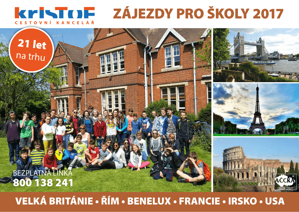 ZÁJEZDY PRO ŠKOLY 2017 21 let na trhu BEZPLATNÁ LINKA 800 138 241 VELKÁ BRITÁNIE • ŘÍM • BENELUX • FRANCIE • IRSKO • USA Mapa pobytových míst pro jazykové kurzy a poznávací zájezdy, TOP 10 nejnavštěvovanějších atrakcí Orkney Island Hebrides Thurso Old M an Mohérové útesy Inverness of Sto rr Skye Portree Nádraží Goathland Fort William Striling Dundee Falkirk Wheel St. Andrews Giant‘s Causeway Mohérové útesy Edinburgh Glasgow Newcastle Belfast Carlisle Dublin Whitby Goathland Scarborough Lake District Leeds York Manchester Liverpool Douglas ostrov Man Holyhead Conwy Caernarfon Roman Bath Chester Snowdon Stratford Warner Bros. Studio U.K. Fishguard Swansea Cambridge Cardiff Bath Stonehenge Exeter Land‘s End Truro Oxford Plymouth Windsor Stonehenge Salisbury Portsmouth Torquay Isle Of Wight Londýn Brighton London Eye Margate Canterbury Hastings Dover Folkestone Eastbourne Falmouth Minack Theatre Hever Castle 2 c e s t o v n í k a n c e l á ř Moskevská 28, 460 01 Liberec 1, tel.: 800 138 241, fax: 485 102 863, e-mail: [email protected], [email protected] 10 důvodů proč jezdit s námi Obsah předně Vás co nejsrdečněji zdravíme a dovolujeme si zaslat náš nový katalog na rok 2017. Najdete v něm osvědčené programy do jižní Anglie, Londýna nebo Oxfordu, inovované programy do Skotska a Irska, ale i novinky na jazykové kurzy do krásného prostředí Kentu (Margate) a univerzitního města Cambridge s výletem do národního parku The Broads. V loňském roce bylo hitem navštívit místa spojená s Harry Potterem. Letos se můžete nechat zlákat novou atrakcí v Brightonu - British Airways i360 - nejtenčí věž s celoskleněnou vyhlídkovou plošinou a pohlédněte na město z nevídané výšky. Vstup vám zajistíme za zvýhodněnou cenu. 1) Autobusy - Jezdíme komfortními zahraničními zájezdovými autobusy, vybavenými WC, klimatizací a bezpečnostními pásy. Mapa pobytových míst, TOP 10 nejnavštěvovanějších atrakcí 10 důvodů proč jezdit s námi Kdo se podílí na přípravě Naši průvodci Naši pedagogové Doprava na zájezdech Samozřejmě stále platí, že většina našich akcí je tvořena tzv. na zakázku, kdy si Vy pedagogové, ale i Vaši studenti vyberete místa, které byste rádi navštívili a my na základě Vašich přání a požadavků zájezd sestavíme. Nevíte-li si rady, zavolejte nám na naši bezplatnou linku 800 138 241. Máme spoustu fotek z realizovaných zájezdů, rádi Vám je zašleme či uděláme prezentaci přímo u Vás ve škole a zodpovíme dotazy jak Vás či studentů, tak i rodičů. Už rok 2016 byl, a samozřejmě i rok 2017 bude, ve znamení bezpečnosti a obav z cestování. Vězte, že děláme maximum pro bezpečí našich klientů, ať již ve formě kvalitního pojištění a maximálně bezpečných autobusů či výběrem programu a trasy. Sledujeme situaci na cestách, vyhýbáme se rušným místům a plníme Vaše přání tak, abyste se cítili maximálně bezpečně. Děkujeme Vám za Vaši přízeň a budeme se těšit na setkání na některém z našich zájezdů. Tým cestovní kanceláře KRISTOF Speciální poděkování Rádi bychom poděkovali především Pavlu Jonešovi, Dáše Proskové a dále pak Ireně Martínkové, Zuzaně Novákové, Romaně Loudínové, Monice Didunykové, Marii Ferlesové, Markétě Bucharové, Petře Smetanové a všem ostatním, kteří nám zaslali fotky nebo příspěvky a podíleli se na přípravě katalogu a nabídkových listů. 2) Pojištění - Zájezdy obsahují nadstandardní pojištění studentů i pedagogů (např. neomezené léčebné výlohy v zahraničí a nejnižší spoluúčast při neúmyslně způsobené škodě). 3) Informace - Podáváme nejrozsáhlejší informace studentům, jejich rodičům a pedagogům (viz. brožury Informace pro účastníky, Odpovědi na nejčastěji kladené otázky, orientační ceny potravin, slovníček, mapy apod.). 4) Bezplatná infolinka - V pracovní době nás můžete kontaktovat na naší bezplatné lince 800 138 241. Mimo tuto dobu volejte na NONSTOP HELPLINKU 602 530 643. 5) Osobní přístup – Váš zájezd bude vždy vyřizovat specialista, který Vám podá maximum informací. Zaručujeme Vám osobní přístup po celou dobu vyřizování zájezdu a samozřejmě kontakt na naší bezplatné lince. 6) Osobní návštěva – Rádi za Vámi přijedeme kamkoliv po České republice a vše osobně vysvětlíme. Naše návštěva je bezplatná a není podmíněna objednávkou či platbou. Pořádáte-li informativní schůzku se studenty či rodiči, neváhejte nás kontaktovat. 7) Slide show – Máme tisíce fotek z našich cest, rádi Vám vytvoříme, v rámci výuky, prezentaci Velké Británie či Irska nebo promítneme zájemcům fotografie z plánovaného zájezdu. Tato nabídka platí samozřejmě i pro tzv. třídní schůzky s rodiči. 8) Průvodci – Jsou s Vámi osobně po celou dobu zájezdu. V nočních hodinách pak k zastižení na mobilním telefonu, jehož číslo pedagogové i studenti obdrží na zájezdu. Téměř všichni naši průvodci mají vysokoškolské vzdělání. 9) Program + služby - rádi uzpůsobíme Vašim požadavkům a přáním. Bezplatně Vám sestavíme program na míru. 10) Zkušenosti – Pobyty pro školní skupiny organizujeme již přes 15 let, máme bohaté zkušenosti s přípravou i realizací zájezdů. Jsme ve spojení s ambasádami a cizineckou policií a máme aktuální informace o podmínkách vycestování pro studenty z cizích zemí. Poznávací zájezdy Nejlevnější metropole Itálie Řím Benelux Francie Paříž, Versailles, Zámky na Loiře Francie Provence Francie Normancie Paříž Paříž + Londýn Brusel + Londýn Nejlevnější Londýn To nejlepší z Londýna Krásy jižní Anglie + Londýn var. 1 Krásy jižní Anglie + Londýn var. 2 Krásy jižní Anglie + Londýn var. 3 Londýn + Oxf