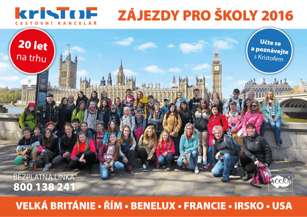 ZÁJEZDY PRO ŠKOLY 2016 20 let na trhu Učte se a poznávej te s Kristofem BEZPLATNÁ LINKA 800 138 241 VELKÁ BRITÁNIE • ŘÍM • BENELUX • FRANCIE • IRSKO • USA rma a d Z e c a t n e z e Pr k a n c e l á ř Nevíte, co se v rámci zájezdu dá navštívit? Chcete studentům přiblížit reálie navštívené země? Nedokážete zodpovědět dotazy o pojištění, o způsobu výběru a hodnocení rodin? Nabízíme Vám možnost návštěvy na Vaší škole s prezentací zájezdu a to buď v rámci vyučovací hodiny nebo v odpoledních hodinách na třídních schůzkách. - promítneme fotky z plánovaného zájezdu - zodpovíme dotazy pedagogů / studentů - přijedeme i na třídní schůzky c e s t o v n í Angličtina, němčina, francouzština PRO PEDAGOGICKÉ PRACOVNÍKY 14-ti denní jazykový kurz ubytování v hostitelské rodině s polopenzí nebo na koleji doprava z ČR až na místo pobytu pojištění NE VÁHE J TE VO LE J TE MAILUJ TE V YUŽIJ TE PŘÍLE ŽITO ST Bezplatná linka: 800 138 241, e-mail: [email protected] přihlášky a nabídky jazykových kurzů budou k dispozici na podzim 2015 dp ro Zavolejte nám na naši bezplatnou linku 800 138 241 a domluvte Vám vyhovující termín návštěvy. Návštěva školy je bezplatná, není zavazující a není vázána na budoucí spolupráci. zy r u k é k c i d o Met h jazyků cizíc k a n c e l á ř jaz g z fo ykov ram nd á vě u E te ER vro v h A psk raze S é u ná M nie US c e s t o v n í c e s t o v n í k a n c e l á ř Moskevská 28, 460 01 Liberec 1, tel.: 800 138 241, fax: 485 102 863, e-mail: [email protected], [email protected] po 2 10 důvodů proč jezdit s námi Obsah je teprve několik týdnů po prázdninách, ale zdá se to jako by to už bylo tak daleko a dávno. Cítíte to stejně? 1) Autobusy - Jezdíme komfortními zahraničními zájezdovými autobusy, vybavenými WC, klimatizací a bezpečnostními pásy. Přitom vůni dálek s přehledem předčí vůně smažených brambůrků a dokřupava osmažené tresky v hospůdce Blue Dolphin v Hastings, nostalgické rozhledy oživí závratný výhled z Eiffelovky nebo Londýnského oka, a tůra po jihoanglických křídových útesech zase protáhne svaly a připomene letní putování. Proto je právě teď ten správný čas vybrat z našeho katalogu a připravit se na zážitky nové. Zasněte se a vyberte si co vás láká. Chceme vás nadchnout pro Británii, Irsko, Francii, Rakousko, Maďarsko – některé z vás poprvé, jiné znovu nebo poněkolikáté. Vaše přízeň nás velmi těší. Více než 60 poznávacích zájezdů a kurzů, které s námi můžete prožít – jako školní výlet za krásami Evropy nebo studijní pobyt u moře s letní atmosférou. Umíme připravit zájezdy i kurzy na míru a na přání, protože s námi cestujete bez starostí. 2) Pojištění - Zájezdy obsahují nadstandardní pojištění studentů i pedagogů (např. neomezené léčebné výlohy v zahraničí a nejnižší spoluúčast při neúmyslně způsobené škodě). Obsah Mapa pobytových míst Kdo se podílí na přípravě Naši průvodci Místa spojená s natáčením filmu Harryho Pottera Doprava na zájezdech I v příští sezoně vás chceme inspirovat nápady, zkušenostmi, ale hlavně radostí, se kterou se cestování věnujeme už 20 let. Těšíme se na viděnou. 3) Informace - Podáváme nejrozsáhlejší informace studentům, jejich rodičům a pedagogům (viz. brožury Informace pro účastníky, Odpovědi na nejčastěji kladené otázky, orientační ceny potravin, slovníček, mapy apod.). 4) Bezplatná infolinka - V pracovní době nás můžete kontaktovat na naší bezplatné lince 800 138 241. Mimo tuto dobu volejte na NONSTOP HELPLINKU 602 530 643. 5) Osobní přístup – Váš zájezd bude vždy vyřizovat specialista, který Vám podá maximum informací. Zaručujeme Vám osobní přístup po celou dobu vyřizování zájezdu a samozřejmě kontakt na naší bezplatné lince. Tým cestovní kanceláře Kristof Speciální poděkování Rádi bychom poděkovali Pavlu Jonešovi, Pavlu Liborovi, Zuzce Jelínkové, Janě Kulhánkové, Janě Mivaltové, Petře Smetanové, Kláře Jones-Newton, Monice Grohové a všem ostatním, kteří nám zaslali fotky a podíleli se na přípravě katalogu a nabídkových listů. 6) Osobní návštěva – Rádi za Vámi přijedeme kamkoliv po České republice a vše osobně vysvětlíme. Naše návštěva je bezplatná a není podmíněna objednávkou či platbou. Pořádáte-li informativní schůzku se studenty či rodiči, neváhejte nás kontaktovat. 7) Slide show – Novinka od roku 2007. Máme tisíce fotek z našich cest, rádi Vám vytvoříme, v rámci výuky, prezentaci Velké Británie či Irska nebo promítneme zájemcům fotografie z plánovaného zájezdu. Tato nabídka platí samozřejmě i pro tzv. třídní schůzky s rodiči. 8) Průvodci – Jsou s Vámi osobně po celou dobu zájezdu. V nočních hodinách pak k zastižení na mobilním telefonu, jehož číslo pedagogové i studenti obdrží na zájezdu. Téměř všichni naši průvodci mají vysokoškolské vzdělání. 9) Program + služby - rádi uzpůsobíme Vašim požadavkům a přáním. Bezplatně Vám sestavíme program na míru. 10) Zkušenosti – Pobyty pro školní skupiny organizujeme již přes 15 let, máme bohaté zkušenosti s přípravou i realizací zájezdů. Jsme ve spojení s ambasádami a cizineckou policií a máme aktuální informace o podmínkách vycestování pro studenty z cizích zemí. Poznávací zájezdy Nejlevnější metropole Itálie Řím Benelux Francie Paříž, Versailles, Zámky na Loiře Francie Provence Francie Normancie Paříž Paříž + Londýn Brusel + Londýn Nejlevnější Londýn To nejlepší z Londýna Krásy jižní Anglie + Londýn var. 1 Krásy jižní Anglie + Londýn var. 2 Krásy jižní Anglie + Londýn var. 3 Londýn + Oxford a rodiště Shak