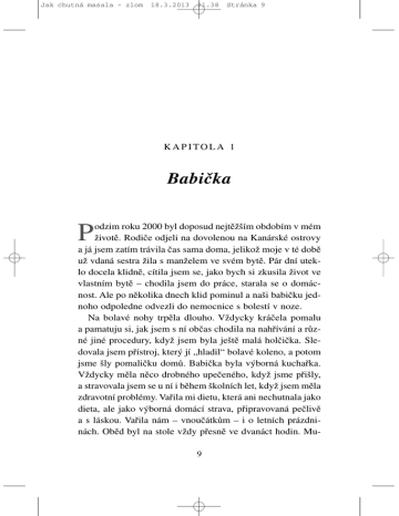 Jak chutná masala - zlom 18.3.2013 21.38 Stránka 9 KAPITOLA 1 Babička odzim roku 2000 byl doposud nejtěžším obdobím v mém životě. Rodiče odjeli na dovolenou na Kanárské ostrovy a já jsem zatím trávila čas sama doma, jelikož moje v té době už vdaná sestra žila s manželem ve svém bytě. Pár dní uteklo docela klidně, cítila jsem se, jako bych si zkusila život ve vlastním bytě – chodila jsem do práce, starala se o domácnost. Ale po několika dnech klid pominul a naši babičku jednoho odpoledne odvezli do nemocnice s bolestí v noze. Na bolavé nohy trpěla dlouho. Vždycky kráčela pomalu a pamatuju si, jak jsem s ní občas chodila na nahřívání a různé jiné procedury, když jsem byla ještě malá holčička. Sledovala jsem přístroj, který jí „hladil“ bolavé koleno, a potom jsme šly pomaličku domů. Babička byla výborná kuchařka. Vždycky měla něco drobného upečeného, když jsme přišly, a stravovala jsem se u ní i během školních let, když jsem měla zdravotní problémy. Vařila mi dietu, která ani nechutnala jako dieta, ale jako výborná domácí strava, připravovaná pečlivě a s láskou. Vařila nám – vnoučátkům – i o letních prázdninách. Oběd byl na stole vždy přesně ve dvanáct hodin. Mu- P 9 Jak chutná masala - zlom 18.3.2013 21.38 Stránka 10 sely jsme si umýt ruce, sednout ke stolu a beze slova pomalu jíst. Ona sama seděla na stoličce vedle sporáku a čekala, než se nacpeme, a až potom dojedla zbytek oběda. Nikdy nic nevyhodila. Když na ni vzpomínám, myslím si, že babičky a matky jsou to nejvzácnější, nejlepší, co jsme do vínku mohli dostat. Moje babička se jmenovala Ľudmila a ta dobrá víla, která tohle jméno pošeptala mojí prababičce, určitě věděla, proč vybrala právě takovéhle jméno. Lidská a milá – taková byla moje babička Ľudmila. Podzim roku 2000 byl smutným zlomem v životě nás všech, kteří jsme babičku tolik milovali. Když letadlo s mými rodiči přistálo na bratislavském letišti, cestou domů jsme jim museli říct, jak to vypadá s babičkou. Nebyly to dobré zprávy. Po příjezdu domů si matka ani nezula boty a v brzkých ranních hodinách běžela do nemocnice. Následujících pár dní to vypadalo, že všechno bude v pořádku a babičku pustí domů. Když jsme jednoho víkendového odpoledne já a moje matka šly babičku navštívit do nemocnice, ležela tam taková maličká, jakási scvrklá pod velkou peřinou. Lékař nám oznámil, že operace proběhla dobře a babičku si budeme moct brzy odvézt. Viděla jsem na matce, jak se jí ulevilo. Nakoukly jsme ještě do pokoje. Babička spala, dotkla jsem se její ruky a šly jsme domů. Nechtěly jsme ji budit, vždyť za pár dní bude zase s námi. V neděli ráno zazvonil telefon. Matka zvedla sluchátko a sestřička z nemocnice se jí zeptala: „Vy jste měli u nás babičku?“ Měli… Měli?… Byla jsem z toho překvapená, smutná, celá tak nějak popletená. Babička odešla. Slzy se nedaly zastavit, když jsem na pohřbu slyšela slova o jejím životě, o tom, jak měla ráda svá vnoučátka. Ten den jsem vůbec neměla pocit, že slzy jsou úlevou a nebolí. Bolelo úplně všechno. Ještě dnes, když na ni při psaní těchto řádků vzpomínám, vyťukávám písmenka na klávesnici a po tvářích mi tečou slzy. 10 Jak chutná masala - zlom 18.3.2013 21.38 Stránka 11 Moje babička byla jedna velká část mého života předtím, než jsem odjela do Indie. Chtěla bych, aby tu byla, poznala naše děti, mého manžela a viděla, jak jsem se naučila vařit. I když je to nemožné, v srdci ji budu navždy nosit s sebou. Jak chutná masala - zlom 18.3.2013 21.38 Stránka 12 KAPITOLA 2 Jak jsem poznala Sunila ednoho smutného dne, byl to právě rok od babiččina odchodu, jsem při prohlížení zbytečností na internetu narazila na Sunila. Upřímný, vtipný člověk, byl tak trochu ještě kluk, ale zároveň měl názory dospělého muže. Překvapilo mě, když jsem zjistila, že je o třináct let starší než já. Ptal se mě, proč zním tak smutně. Vyprávěla jsem mu o babičce – jak nám před rokem odešla a jak moc mi pořád chybí. Byl opravdu milý, utěšil mě, snažil se mě rozveselit. Stali se z nás přátelé a od toho dne jsme si povídali téměř denně. Byl prosinec 2001, dva dny před Štědrým dnem. Chtěla jsem Sunilovi napsat, že se pár dní neozvu, protože chci strávit svátky bez počítače, s rodinou a užít si atmosféru. Jak jsem tak psala e-mail, najednou na mě zablikal vzkaz, jestli jsem on-line. Prohodili jsme pár slov a padla nečekaná otázka, která změnila úplně všechno: „Vezmeš si mě?“ V tom okamžiku jsem věděla, že to není možné – rodiče by mi to nedovolili a já bych v Indii určitě žít nedokázala. Vždyť ani nevím, jak ta země vypadá. Všechno, co jsem o Indii věděla, byla fakta z knih a dokumentárních filmů, a to ne- J 12 Jak chutná masala - zlom 18.3.2013 21.38 Stránka 13 byla vůbec lákavá představa. Špinavé byty nebo domky bez plynových přípojek a mytí nádobí pod kohoutkem někde v boční uličce mě vůbec nepřitahovalo. Netušila jsem, jak je to s oblékáním – moje představa byla žena zahalená od hlavy až k patě. Tyhle představy mě spíš vyděsily, než upoutaly. A tak jsem odpověděla „ne“. Rozloučili jsme se, ale já jsem odcházela domů s divným pocitem a nasazeným broukem v hlavě. Uběhlo několik dní a já začínala mít pocit, že jsem udělala chybu. „Vždyť ho mám ráda, je to můj nejlepší kamarád a máme toho tolik společného. Co když…?“ Nemohla jsem se dočkat našeho „rande“, rychle jsem mu poslala naléhavou zprávu na telefon, že si musíme promluvit, a spěchala jsem do kavárny. Hned jak na mě zasvítilo žluté, usměvavé sluníčko (Sunil byl on-line), napsala jsem