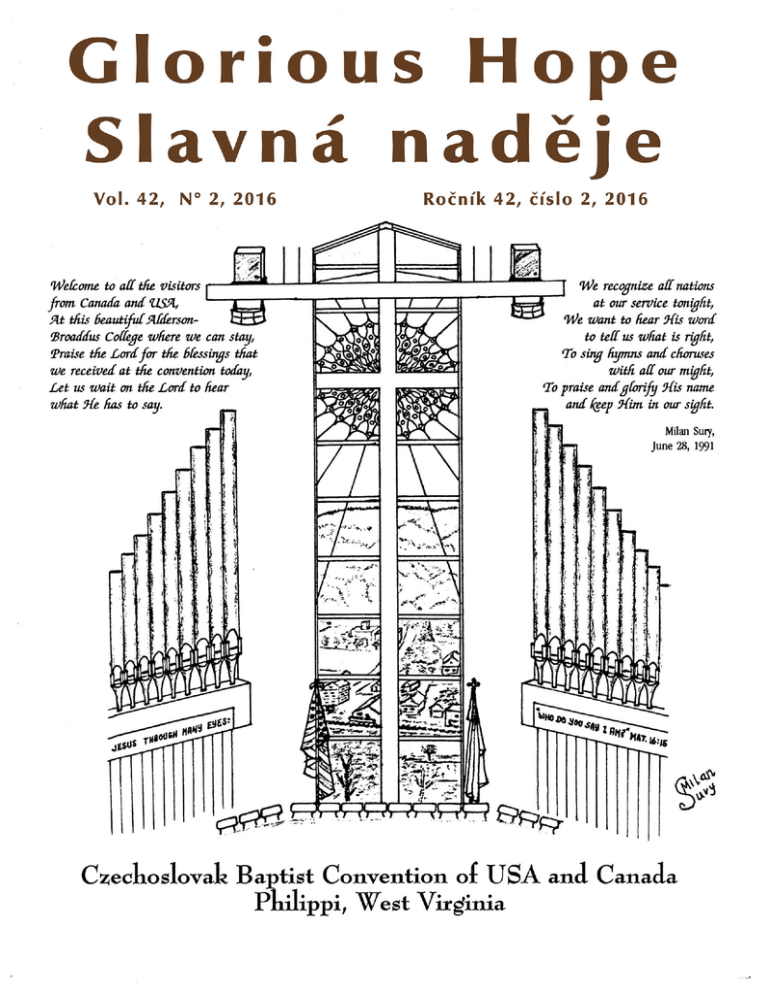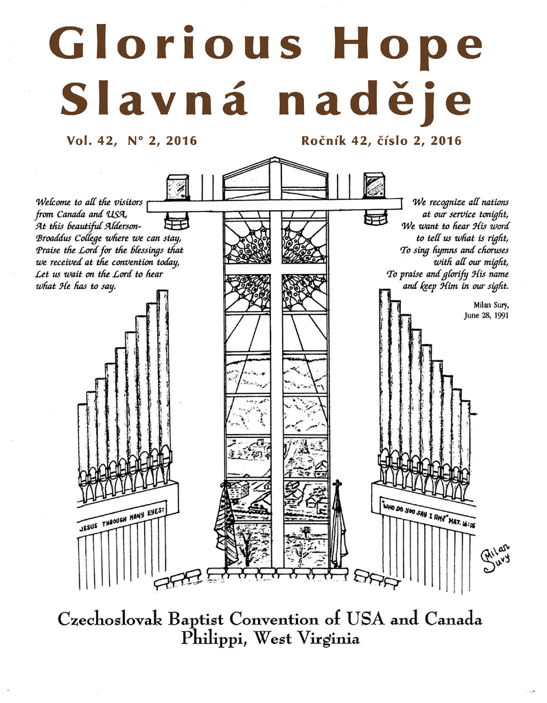 Contents Convention Mission Statement Editorial – Natasha Laurinc........................................................... 3 From the President – Stan Mantle............................................... 4 From the Executive Secretary – Darko Siracki................................ 5 Tentative Program of the 107th Annual Convention........................ 6 Summer 2016 Mission Team............................................................... 7 When Your Life Turns Upside Down – Part one................................. 8 Když se život obrátí na ruby – Část první.................................................. 12 In Memory – Juurd Ype (Jerry) Potma, Emil Dors...........................16 We remember… Milan Sury – Natasha Laurinc..............................17 Pamatujeme… Milan Sury – Nataša Laurincová..............................17 Charles Spurgeon’s Devotion.............................................................18 Ladies’ Page – Deb Mulder..............................................................19 107th Czechoslovak Baptist Convention – July 7—10, 2016.........19 Youth Page — Petar Vlasic...................................................................20 Children’s Corner — Mrs. Pickles........................................... 21 The Potmas.................................................................................. 22 Ruby Mikulencak........................................................................ 23 Front Cover: Milan Sury – reprint from Glorious Hope August 1991 Convention photos: Dusko Pilic Donations All donations should be mailed to our financial secretaries, using enclosed envelope. USA: Czechoslovak Baptist Convention C/O Larry Rucker 2222 Parkers Hill Dr. Maidens VA 23102 CANADA: Czechoslovak Baptist Convention c/o Henry Pojman 1305 Inglehart Dr Burlington, ON, L7M 4X6 Make check payable to Czechoslovak Baptist Convention or CZSKBC. Feel free to make a special designation on the bottom of the check: Convention, Glorious Hope, Scholarship Fund, Bibles for Czechoslovakia, etc. Please do not mail checks to our main address in Detroit, MI. Gifts for Ladies’ work—make check payable to Czechoslovak Baptist Women’s Missionary Union. 2 Printed on recycled paper The Czechoslovak Baptist Convention of USA and Canada exists 1) to assist in extending the gospel of our Lord Jesus Christ in lands of central and eastern Europe, particularly the Czech and Slovak Republics; 2) to support the work of Baptists and other evangelical churches in North America that minister to persons of Czech and Slovak descent, and 3) to provide a Christian context for worship, fellowship, teaching, and appreciation of heritage among those in the United States and Canada who bear interest in the nationalities we represent. Misijní poslání konvence Československá baptistická konvence Spojených států a Kanady byla ustanovena za účelem: 1) napomáhat v šíření evangelia našeho Pána Ježíše Krista v zemích střední a východní Evropy, zvláště v České a Slovenské republice; 2) podporovat práci baptistů a jiných evangelikálních církví v severní Americe, které slouží českým a slovenským potomkům; 3) předkládat formu bohoslužby, obecenství a učení, vážit si dědictví těch, ve Spojených státech a v Kanadě, kterým leží na srdci národy, které reprezentujeme. Glorious Hope/Slavná nadìje Volume 42, No 2, 2016 (USPS 009334), ISSN 0700-5202 Published quarterly by The Czechoslovak Baptist Convention of USA and Canada 114 Pleasantview Dr. Mc Murray PA 15317 Periodical postage paid at McMurray, PA and additional mailing offices Editor-in-Chief: Natasha Laurinc email: [email protected] You may send articles to above address. Desktop publishing and art: Vit Malek Assistant Editors: Janice Cermak, Ondrej Laurinc, Ph.D. POSTMASTER: Send address changes to Glorious Hope / Slavná nadìje P.O. Box 441516 Deitroit, MI, 48244, USA. email: [email protected] WWW.CZSKBC.ORG Moving? Let us know By Mail: CZSKBC P. O. Box 441516 Detroit, MI, 48244 Email: [email protected] Vol 42, No 2, 16 EditoriE a ld i t o r i a l W Jesus said, “I am with you.” hile preparing this editorial, I noticed and was interested in the recent events that involved members of the Baptist Unions in the Czech and Slovak Republics, as well as members of the Czechoslovak Baptist Convention of USA and Canada. After Easter, during which the resurrection of our Lord and Saviour Jesus Christ was celebrated, a conference of sisters of BJB CR and SR in Slovakia in Banská Bystrica took place (6–8 May, 2016). The theme of the conference was Forgiveness (Matthew 6:14–15). Pentecost, a time when a new style of fellowship, predominantly influenced by the Holy Spirit, followed soon thereafter. This fellowship has the mandate to go out into the whole world and spread the news of salvation. A commission that isn’t easy, but the Lord doesn’t forget the importance of rest. Rest (Matt. 11:28) happens to be the theme of this year’s national conference of the BJB churches in the Czech Republic, which runs in Brno from June 3–5. The theme of our Czechoslovak conference that will take place July 7–10 likewise ties into these: Therefore go (Matt. 28:19). It is a very emphatic command from the Lord Jesus, who fulfilled his calling and is passing on the baton. Yes, today and every day we receive forgiveness at the feet of our Lord Jesus, and thanks to the Holy Spirit we can work and function. And at the feet of Jesus we gain strength for our next assignment. That calling is not limited to faraway places and foreign lands. The calling is multifarious. In many cases, we fulfill our calling right where we live. Certainly we fulfill it within our circle of friends and among our families. Most of the time we are pretty sure we can handle our calling. And handle it well. But what if our life turns upside down? We will be printing a true l