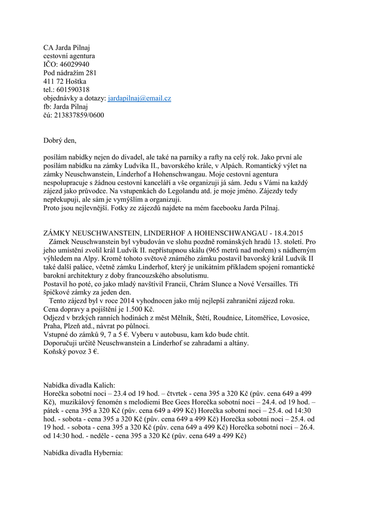 CA Jarda Pilnaj cestovní agentura IČO: 46029940 Pod nádražím 281 411 72 Hoštka tel.: 601590318 objednávky a dotazy: [email protected] fb: Jarda Pilnaj čú: 213837859/0600 Dobrý den, posílám nabídky nejen do divadel, ale také na parníky a rafty na celý rok. Jako první ale posílám nabídku na zámky Ludvíka II., bavorského krále, v Alpách. Romantický výlet na zámky Neuschwanstein, Linderhof a Hohenschwangau. Moje cestovní agentura nespolupracuje s žádnou cestovní kanceláří a vše organizuji já sám. Jedu s Vámi na každý zájezd jako průvodce. Na vstupenkách do Legolandu atd. je moje jméno. Zájezdy tedy nepřekupuji, ale sám je vymýšlím a organizuji. Proto jsou nejlevnější. Fotky ze zájezdů najdete na mém facebooku Jarda Pilnaj. ZÁMKY NEUSCHWANSTEIN, LINDERHOF A HOHENSCHWANGAU - 18.4.2015 Zámek Neuschwanstein byl vybudován ve slohu pozdně románských hradů 13. století. Pro jeho umístění zvolil král Ludvík II. nepřístupnou skálu (965 metrů nad mořem) s nádherným výhledem na Alpy. Kromě tohoto světově známého zámku postavil bavorský král Ludvík II také další paláce, včetně zámku Linderhof, který je unikátním příkladem spojení romantické barokní architektury z doby francouzského absolutismu. Postavil ho poté, co jako mladý navštívil Francii, Chrám Slunce a Nové Versailles. Tři špičkové zámky za jeden den. Tento zájezd byl v roce 2014 vyhodnocen jako můj nejlepší zahraniční zájezd roku. Cena dopravy a pojištění je 1.500 Kč. Odjezd v brzkých ranních hodinách z měst Mělník, Štětí, Roudnice, Litoměřice, Lovosice, Praha, Plzeň atd., návrat po půlnoci. Vstupné do zámků 9, 7 a 5 €. Vyberu v autobusu, kam kdo bude chtít. Doporučuji určitě Neuschwanstein a Linderhof se zahradami a altány. Koňský povoz 3 €. Nabídka divadla Kalich: Horečka sobotní noci – 23.4 od 19 hod. – čtvrtek - cena 395 a 320 Kč (pův. cena 649 a 499 Kč), muzikálový fenomén s melodiemi Bee Gees Horečka sobotní noci – 24.4. od 19 hod. – pátek - cena 395 a 320 Kč (pův. cena 649 a 499 Kč) Horečka sobotní noci – 25.4. od 14:30 hod. - sobota - cena 395 a 320 Kč (pův. cena 649 a 499 Kč) Horečka sobotní noci – 25.4. od 19 hod. - sobota - cena 395 a 320 Kč (pův. cena 649 a 499 Kč) Horečka sobotní noci – 26.4. od 14:30 hod. - neděle - cena 395 a 320 Kč (pův. cena 649 a 499 Kč) Nabídka divadla Hybernia: Přízrak Londýna - 6.6. od 14 hod. - sobota - 1+1 zdarma (vstupenka vyjde na 195,245,295 a 345 Kč) Přízrak Londýna - 6.6. od 18 hod. - sobota - 1+1 zdarma (vstupenka vyjde na 195,245,295 a 345 Kč) Příběh lásky, děsuplných vražd i bujarého veselí odhaluje nikdy neobjasněné řádění sériového vraha za časů viktoriánského Londýna konce 19. století. Na 14 hod. jede autobus z Litoměřic, Roudnice, Štětí a okolí. Nabídka plaveb po Labi: Soukromě i pro skupiny, školy atd. Dětská jízdenka je do 10 let. Odplouváme vždy z Děčína. Děčín - Hřensko. Cena 180/90 Kč. Právčická skála a lodičky v soutěskách. Jízdní řád: Po, ÚT, St, Čt, Pá, So: 8,30 hod. - nástup na loď 9,00 hod. - odplutí z Děčína 15,30 hod. - odplutí z Hřenska 17,00 hod. - připlutí do Děčína Ne: 9,30 hod. - nástup na loď 10,00 hod. - odplutí z Děčína 15,30 hod. - odplutí z Hřenska 17,00 hod. - připlutí do Děčína Děčín - Bad Schandau. Cena 280/140 Kč. Rozhledna, zoo park, botanická zahrádka, historická tramvaj, vodopád nebo lázně a kavárny. Jízdní řád: St, Pá 8,30 hod. - nástup na loď 9,00 hod. - odplutí z Děčína 14,00 hod. - odplutí z Bad Schandau 17,00 hod. - připlutí do Děčína Ne: 9,30 hod. - nástup na loď 10,00 hod. - odplutí z Děčína 14,30 hod. - odplutí z Bad Schandau 17,00 hod. - připlutí do Děčína Děčín - Konigstein. Cena 350/250 Kč. Prodloužená plavba s pauzou 3,5 hod. na prohlídku pevnosti. Oběd na palubě 100 Kč. Vstupné do hradu 8 Euro. Jízdní řád: 23.5.,14.6.,18.7.,26.7.,14.8.,23.8. 8,30 hod. - nástup na loď 9,00 hod. - odplutí z Děčína 17,00 hod. - připlutí do Děčína 23.5. jede autobus z Litoměřic, Roudnice, Štětí a okolí do Děčína. Cena dopravy tam a zpět je 150 Kč. Děčín - Drážďany. Cena 890/450 Kč. (pův. cena 1.980 Kč) v ceně plavby je oběd, průvodce městským okruhem, večeře, hudba na palubě, ochutnávka vín atd. Plavby: duben, květen, červen a září, říjen: čtvrtek, pátek, sobota, neděle, pondělí červenec, srpen: denně 8,30 hod. - nástup na loď 9,00 hod. - odplutí z Děčína 9,50 hod. - zastávka Hřensko 11,00 hod. - oběd na palubě 13,00 hod. - přistání v Drážďanech, prohlídka historického centra města s průvodcem nebo individuální volno 15,00 hod. - odplutí z Drážďan, večeře, živá hudba, tanec atd. 20,30 hod. - zastávka Hřensko 22,00 hod. - připlutí do Děčína Děčín - Míšeň a Moritzburg. Cena 890/650 Kč. (pův. cena 2.080 Kč), plavba do Míšně s programem, oběd, ochutnávka sektů, komentovaný výklad, autobusovou dopravou zpět do Děčína s možností vystoupit v Ústí n/L. Plavby: 25.4. a 17.10. - den otevřených dveří míšeňské porcelánky, prohlídka zdarma, zvýhodněné nákupy, u zámku Moritzburg bude pouze zastávka. 23.5.,13.6.,6.7.,19.7.,27.7.,2.8.,9.8.,23.8.,13.9.,26.9. 8,30 hod. - nástup na loď 8,45 hod. - odplutí z Děčína 14,00 hod. - zakotvení v Míšni, prohlídka města 16,30 hod. - odjezd z Míšně k Popelčinu zámku 17,00 hod. - zastávka Moritzburg 18,30 hod. - odjezd z Moritzburgu 20,00 hod. - příjezd do Ústí 20,30 hod. - příjezd do Děčína Děčín - Pillnitz. Cena 890/450 Kč. (pův. cena 1.650 Kč) plavba s hudbou a průvodcem, tříchodový oběd, večeři + salátový bar a dezertový stůl. Plavby: 17.4.,2.5.,8.5.,30.5.,31.5.,6.6.,19.6.,20.6.,4.7.,10.7.,24.7.,7.8.,21.8.,19.9.,3.10. 8,30 hod. - nástu