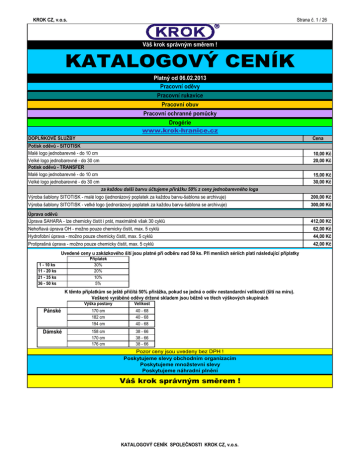KROK CZ, v.o.s. Strana č. 1 / 26 Váš krok správným směrem ! KATALOGOVÝ CENÍK Platný od 06.02.2013 Pracovní oděvy Pracovní rukavice Pracovní obuv Pracovní ochranné pomůcky Drogérie www.krok-hranice.cz DOPLŇKOVÉ SLUŽBY Cena Potisk oděvů - SITOTISK Malé logo jednobarevné - do 10 cm 10,00 Kč 20,00 Kč Velké logo jednobarevné - do 30 cm Potisk oděvů - TRANSFER Malé logo jednobarevné - do 10 cm 15,00 Kč 30,00 Kč Velké logo jednobarevné - do 30 cm za každou další barvu účtujeme přirážku 50% z ceny jednobarevného loga Výroba šablony SITOTISK - malé logo (jednorázový poplatek za každou barvu-šablona se archivuje) 200,00 Kč Výroba šablony SITOTISK - velké logo (jednorázový poplatek za každou barvu-šablona se archivuje) 300,00 Kč Úprava oděvů Úprava SAHARA - lze chemicky čistit i prát, maximálně však 30 cyklů 412,00 Kč Nehořlavá úprava OH - možno pouze chemicky čistit, max. 5 cyklů 62,00 Kč Hydrofobní úprava - možno pouze chemicky čistit, max. 5 cyklů 44,00 Kč Protiprašná úprava - možno pouze chemicky čistit, max. 5 cyklů 42,00 Kč Uvedené ceny u zakázkového šití jsou platné při odběru nad 50 ks. Při menších sériích platí následující příplatky 1 - 10 ks 11 - 20 ks 21 - 35 ks 36 - 50 ks Příplatek 30% 20% 10% 5% K těmto příplatkům se ještě přičítá 50% přirážka, pokud se jedná o oděv nestandardní velikosti (šití na míru). Veškeré vyráběné oděvy držené skladem jsou běžně ve třech výškových skupinách Výška postavy Velikost Pánské 170 cm 182 cm 194 cm 40 - 68 40 - 68 40 - 68 Dámské 158 cm 170 cm 176 cm 38 - 66 38 - 66 38 - 66 Pozor ceny jsou uvedeny bez DPH ! Poskytujeme slevy obchodním organizacím Poskytujeme množstevní slevy Poskytujeme náhradní plnění Váš krok správným směrem ! KATALOGOVÝ CENÍK SPOLEČNOSTI KROK CZ, v.o.s. KROK CZ, v.o.s. Strana č. 2 / 26 ODĚVY Str. 6 6 6 6 6 6 6 6 7 7 7 7 7 7 7 8 8 8 8 8 8 8 9 9 9 9 9 9 9 9 9 9 9 9 9 9 10 10 10 10 10 10 10 10 10 10 11 11 11 11 11 11 11 11 12 12 12 12 12 12 12 Objed. kód 061210 xxx 061207 xxx 061213 xxx 061212 xxx 061917 xxx 061229 xxx 061231 xxx 061266 xxx 061378 xxx 061130 xxx 051153 xxx 064337 xxx 061272 xxx 071112 xxx 061494 xxx 071758 3xx 071752 xxx 071749 3xx 061246 xxx 061121 xxx 074714 3xx 061111 xxx 071112 xxx 071132 xxx 071164 xxx 072112 xxx 072164 xxx 072132 xxx 071122 xxx 071142 xxx 072122 xxx 072142 xxx 071199 2xx 071199 1xx 074193 3xx 074153 3xx 071277 300 071800 300 071271 300 071274 300 071799 300 071242 3xx 071244 3xx 071445 3xx 071243 3xx 071240 3xx 071241 3xx 071263 3xx 071260 3xx 071262 3xx 071261 3xx 072149 3xx 072148 3xx 072150 3xx 074704 3xx 074136 3xx 074222 3xx 074761 3xx 074703 3xx 074150 3xx 074241 3xx Obchodní Název MOFOS MOFOS-Sahara MOFOS-Sahara MOFOS-Sahara OPO OPO OPO FAKÍR ESD PLÁŠŤ CR ESD KOMBINÉZA ESD OBUV ALFA SAHARA-Antistat SAHARA ESD ESD ESD HERBERT ESD ESD ALFA TELECOM KOMODO MOBIKO PÁN.OBLEK pas PÁN.KALHOTY pas PÁN.BLŮZA DÁM.OBLEK pas DÁM.BLŮZA DÁM.KALHOTY PÁN.OBLEK lacl. PÁN.KALHOTY lacl. DÁM.OBLEK lacl. DÁM.KALHOTY lacl. UKARI UKARI EPICEA ERABLE II EMERTON EMERTON EMERTON EMERTON EMERTON DESMAN DESMAN DESMAN DESMAN DESMAN DESMAN DESMAN DESMAN DESMAN DESMAN DESMAN DESMAN DESMAN DESMAN PLUS DESMAN PLUS DESMAN PLUS DESMAN PLUS OLZA OLZA OLZA Info výrobce 2v1 Popis Svářečský oblek Svářečský oblek Svářečské kalhoty Svářečská blůza Kabát kyselinovzdorný - zimní Kyselinovzdorná blůza Kyselinovzdorné kalhoty do pasu (100% polypropylen) Nehořlavý antistatický oblek ESD plášť CR Kombinéza do čistého prostředí, antistatická Obuv do čistého prostředí, antistatická Kombinéza do čistého prostředí, antistatická Nehořlavý antistatický oblek Sahara-Antistat Oblek pas Sahara s nehořlavou úpravou ESD plášť UNI ESD mikina ESD polokošile ESD tričko ESD kalhoty Oblek montérkový pánský - kalhoty s náprsenkou Antistatická, kyselinovzdorná, žáruvzdorná,nepromokavá bunda Oblek montérkový pánský - kalhoty s náprsenkou Pánský oblek pas - pánský dvojdílný Pánské kalhoty montérkové do pasu (230g/m2) Pánská blůza Dámský oblek pas Dámská blůza Dámské kalhoty montérkové do pasu (230g/m2) Pánský oblek montérkový dvoudílný - lacl (230g/m2) Pánské kalhoty montérkové s náprsenkou (230g/m2) Dámský oblek montérkový dvoudílný - lacl (230g/m2) Dámské kalhoty montérkové s náprsenkou (230g/m2) Bunda Kalhoty Bunda protipořezová Kalhoty protipořezové Bunda Vesta Kalhoty pasové Kalhoty lacl Kombinéza Pánská bunda Pánské kahoty do pasu Pánské kahoty s laclem Pánské kalhoty pas 2 v 1 Pánský overal (kombinéza) Pánská vesta Triko s krátkým rukávem Pánské kalhoty krátké Pánská bunda zateplená flanelem Pánské kalhoty s laclem zateplené flanelem Dámské kalhoty do pasu Dámské kalhoty s laclem Dámská bunda Moderní bunda na zip Moderní kalhoty s laclem Moderní pasové kalhoty Moderní kraťasy Bunda Kalhoty pasové Kalhoty s laclem KATALOGOVÝ CENÍK SPOLEČNOSTI KROK CZ, v.o.s. Doplň.info vel. 34 až 46 petrol+žlutá modrá+žlutá modrá+bílá modrý modré modrá modrý modrá modré modrý modré modrý modré Prodejní cena 690,00 Kč 1 019,00 Kč 470,00 Kč 549,00 Kč 1 614,00 Kč 680,00 Kč 610,00 Kč 3 675,00 Kč 726,00 Kč 1 310,00 Kč 700,00 Kč 1 046,00 Kč 1 804,00 Kč 687,00 Kč 472,00 Kč 516,00 Kč 378,00 Kč 296,00 Kč 445,00 Kč 845,00 Kč 5 169,00 Kč 751,00 Kč 299,00 Kč 156,00 Kč 165,00 Kč 299,00 Kč 165,00 Kč 156,00 Kč 390,00 Kč 247,00 Kč 390,00 Kč 247,00 Kč 708,69 Kč 518,90 Kč 3 721,00 Kč 3 118,00 Kč 499,28 Kč 392,19 Kč 434,70 Kč 587,02 Kč 796,12 Kč 395,78 Kč 362,10 Kč 479,60 Kč 422,67 Kč 627,51 Kč 299,11 Kč 95,03 Kč 273,54 Kč 469,02 Kč 623,63 Kč 369,78 Kč 484,08 Kč 407,88 Kč 304,34 Kč 411,02 Kč 304,34 Kč 176,71 Kč 719,90 Kč 779,00 Kč 887,00 Kč KROK CZ, v.o.s. 