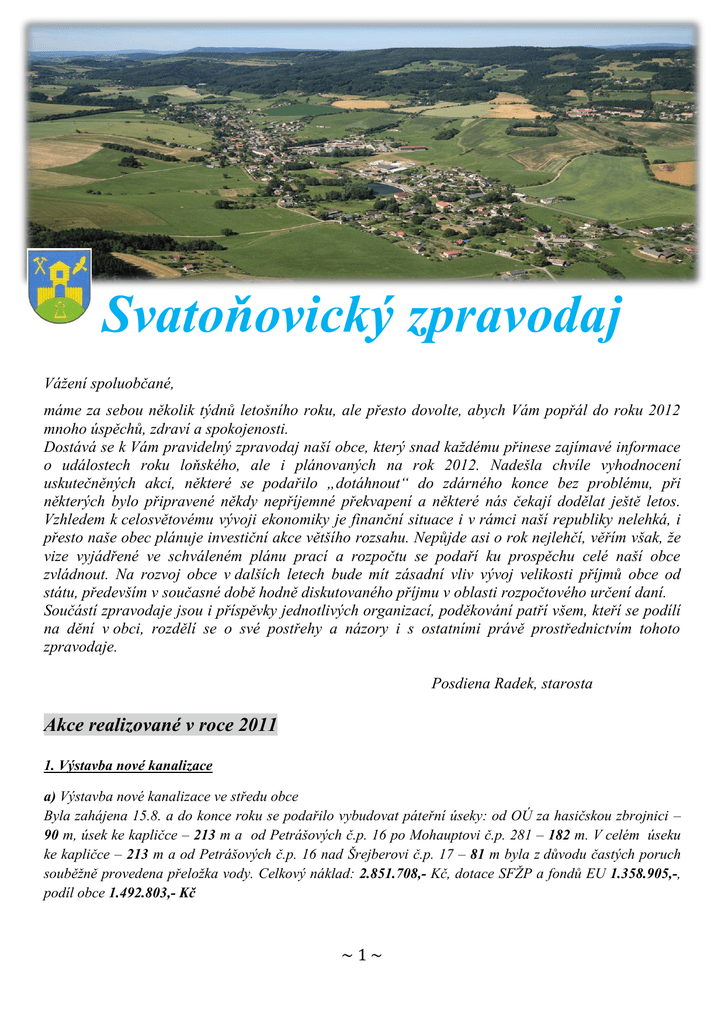 Svatoňovický zpravodaj Vážení spoluobčané, máme za sebou několik týdnů letošního roku, ale přesto dovolte, abych Vám popřál do roku 2012 mnoho úspěchů, zdraví a spokojenosti. Dostává se k Vám pravidelný zpravodaj naší obce, který snad každému přinese zajímavé informace o událostech roku loňského, ale i plánovaných na rok 2012. Nadešla chvíle vyhodnocení uskutečněných akcí, některé se podařilo „dotáhnout“ do zdárného konce bez problému, při některých bylo připravené někdy nepříjemné překvapení a některé nás čekají dodělat ještě letos. Vzhledem k celosvětovému vývoji ekonomiky je finanční situace i v rámci naší republiky nelehká, i přesto naše obec plánuje investiční akce většího rozsahu. Nepůjde asi o rok nejlehčí, věřím však, že vize vyjádřené ve schváleném plánu prací a rozpočtu se podaří ku prospěchu celé naší obce zvládnout. Na rozvoj obce v dalších letech bude mít zásadní vliv vývoj velikosti příjmů obce od státu, především v současné době hodně diskutovaného příjmu v oblasti rozpočtového určení daní. Součástí zpravodaje jsou i příspěvky jednotlivých organizací, poděkování patří všem, kteří se podílí na dění v obci, rozdělí se o své postřehy a názory i s ostatními právě prostřednictvím tohoto zpravodaje. Posdiena Radek, starosta Akce realizované v roce 2011 1. Výstavba nové kanalizace a) Výstavba nové kanalizace ve středu obce Byla zahájena 15.8. a do konce roku se podařilo vybudovat páteřní úseky: od OÚ za hasičskou zbrojnici – 90 m, úsek ke kapličce – 213 m a od Petrášových č.p. 16 po Mohauptovi č.p. 281 – 182 m. V celém úseku ke kapličce – 213 m a od Petrášových č.p. 16 nad Šrejberovi č.p. 17 – 81 m byla z důvodu častých poruch souběžně provedena přeložka vody. Celkový náklad: 2.851.708,- Kč, dotace SFŽP a fondů EU 1.358.905,-, podíl obce 1.492.803,- Kč ~1~ b) Úsek pod dráhou – „ Prodloužení stoky B“ Prodloužení kanalizace v této lokalitě o 56 m bylo provedeno nákladem obce 337.640,- Kč Veškeré práce prováděla firma VAKSTAV Jablonné nad Orlicí 2.Oprava podlahy v tělocvičně v Markoušovicích Po vybourání původní podlahy byl položen podkladový beton, nainstalována technologie určená k odvětrání podlahy a obvodových stěn, jako podlahová krytina byly použity nové parkety, zdi obloženy OSB deskami, ostatní prostory byly nově vymalovány, obnoveny nátěry dveří, nově instalovány ochranné mříže. Nezbývá než popřát hlavně občanům Markoušovic hodně sportovních, ale i kulturních zážitků. Práce prováděla firma Josef Pich Batňovice. Celkový náklad obce: 1.065.821,- Kč Úprava podloží nové podlahy 3.Oprava mostu u Šrytrů ve Velkých Svatoňovicích Most, který byl již v havarijním stavu, byl zbourán včetně opěrných zdí. Na nový základ byly vyzděny opěrné zdi a vybetonována nová mostovka. Při napojování mostu na povrch komunikace byl zároveň opraven úsek komunikace do fládru. Práce prováděla firma LTM Vrchlabí s.r.o. Celkový náklad obce: 471.269,-Kč Nové opěrné zdi mostu 4.Oprava střechy na KK Velké Svatoňovice Na celé části střechy podél hlavní komunikace byla provedena demontáž z části lepenkové a plechové krytiny, nahradila se novými bitumenovými pásy, v nezbytné míře byly vyměněny a zpevněny tesařské konstrukce, opraveny komínové hlavice a opláštění komínů. Po rozkrytí střechy nad jevištěm byl zjištěn havarijní stav dřevěných konstrukcí střechy, ale i stropu(napadení škůdcem - červotočem v takové míře, že se muselo přistoupit ke kompletní výměně všech krovů a prkenného záklopu). Celá konstrukce střechy je nyní vynesena na nově uložené kovové „I“ profily, které poslouží i při následné opravě k zavěšení stropu nad jevištěm. Práce prováděla firma Zdeněk Vít a Josef Pich Batňovice. Celkový náklad obce 554.291,-Kč ~2~ Oprava střechy nad jevištěm 5.Oprava Restaurace Klub Velké Svatoňovice V restauraci byl na vyhovující místo umístěn nový plynový kotel, vymalovány prostory celé restaurace a chodba. Do kuchyně byly pořízeny hygienickým podmínkám vyhovující nerezové stoly a ostatní nerezové vybavení (police, zásuvkový stůl). Práce prováděla firma Bolkovec s.r.o., Jiroušek Zdeněk a Gast-Pro s.r.o. Celkový náklad obce: 162.866,- Kč 6.Oprava komunikací 1. Na vybrané úseky - Ve Vejmole, nad Smrkem a ve Fládru byly nově položeny živičné povrchy. Práce prováděla firma Strabag a.s. Celkový náklad 1.197.171,- Kč 2. V Markoušovicích nad p. Hejnou č.p. 28 byl osazen žlab, u Hájovny byly zhotoveny dva kanály a provedeno zatrubnění pod komunikací. Práce prováděla firma BEZEDOS s.r.o. Celkový náklad obce: 102.000,- Kč 3. Oprava povrchu místní komunikace obalenou drtí přes les v Markoušovicích. Celkový náklad obce 29.904,- Kč 4. Oprava povrchu ostatních komunikací v Markoušovicích a ve Velkých Svatoňovicích obalenou drtí. Celkový náklad obce 27.300,- Kč Opravy povrchů prováděla firma SÚS Trutnov 7.Úprava zeleně u pomníku ve Velkých Svatoňovicích Původní dřeviny byly pokáceny, celá plocha zbavena pařezů a staré výsadby. Podle schváleného návrhu byly vysazeny dřeviny nové, plocha zakryta mulčovací textilií a drobným kamínkem. Práce prováděla firma Silva ČK s.r.o. Celkový náklad obce: 39.730,- Kč Závěrečný účet hospodaření za rok 2011 Schválený rozpočet Rozpočet po změnách příjmy výdaje 12.217.000,15.030.700,14.101.020,- Skutečné příjmy celkem 15.025.995,- Skutečné výdaje celkem 14.082.376,daňové příjmy nedaňové příjmy kapitálové příjmy přijaté dotace 8.955.745,- běžné výdaje 3.833.374,- kapitálové výdaje 3.680,2.233.196,-