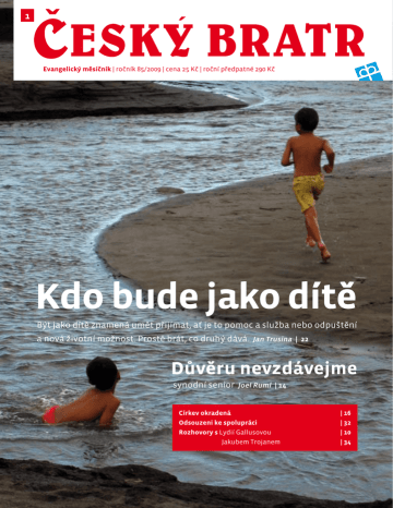 1 Evangelický měsíčník | ročník 85/2009 | cena 25 Kč | roční předpatné 290 Kč Kdo bude jako dítě Být jako dítě znamená umět přijímat, ať je to pomoc a služba nebo odpuštění a nová životní možnost. Prostě brát, co druhý dává. Jan Trusina | 22 Důvěru nevzdávejme synodní senior Joel Ruml | 14 Církev okradená Odsouzeni ke spolupráci Rozhovory s Lydií Gallusovou Jakubem Trojanem | 16 | 32 | 10 | 34 3 ÚVODNÍK Po dvaceti letech – J. Mamula 4 NAŠE KAZATELNY 5 BIBLICKÁ ÚVAHA Kdo bude jako dítě – Ženatý, D. 6 Z CÍRKVE EKUMENA Máme společný duchovní vkus – M. Hübner Noc otevřených kostelů 2009 – O. Chrást ČESKÉ PŘEDSEDNICTVÍ EU 10 CÍRKEVNÍ KANCELÁŘ Aby církevní kancelář nebyla daleko – I. Benešová 13 PO UZÁVĚRCE Vyjádření SR ke zpronevěře na našem ústředí 14 V TĚCHTO DNECH Důvěru nevzdávejme 16 AKTUÁLNĚ Církev okradená – J. Mamula 17 NÁZOR Tato zkušenost církvi prospěje – -pesJUBILEUM Miroslav Rozbořil osmdesátníkem – J. Kostelecký 18 GLOSA Soukromý generační hrdina – top OTÁZKA MĚSÍCE 19 PTÁME SE O. Stehlíka na atmosféru ve Spojených státech 20 KOMENTÁŘ Zapomenuté výročí – M. Hübner Spousta věcí zadarmo – T. Pavelka 21 CÍRKEVNÍ ROK Třicet let krásy a síly – top 22 TÉMA Další povinnost, nebo ulehčení? – J. Trusina J. A. Komenský: Dítě a učitel své doby – J. Kašper 26 CO SI MYSLÍ Kolik dítěte ve vás zůstalo? POSTŘEH Jedli je ne samou láskou – J. Hoblík 28 DIAKONIE A CÍRKEV Odsouzeni ke spolupráci – jam Když oběti násilí trpí, trpí i Bůh – EG 32 ZPÍVEJTE HOSPODINU PÍSEŇ NOVOU Chvalte! Oslavujte! Plesejte! – L. Moravetz 34 OBECENSTVÍ SVATÝCH Rozhovor s J. S. Trojanem Jan Palach nás učinil svými přáteli – P. Veber 36 RECENZE K České synoptické Bibli... – J. Dušek 37 SLOUPEK 38 NEJEN DĚTEM ÚVODNÍK Po dvaceti letech S polečenská scéna má sklon se měnit po dvaceti letech, nechal se slyšet nedávno exprezident Václav Havel. Na začátku roku symbolické dvacítky od listopadového sametového převratu máme příležitost k zamyšlení. Například Diakonie a církev. Nebo církev a Diakonie? Ať z té či oné strany, ještě před pár lety narážela jejich spolupráce na bariéry. „Víra“ versus „Profesionalita“. Něco je dnes jinak a máme tu společný program „Můj soused“. Kdo se diví, nechť si uvnitř najde strany, které budou nyní patřit naší Diakonii. Prý je to jen kvůli penězům, ale co když i ony mohou napomoci dějinným změnám či posunům. Proč by se nešlo podívat na jakékoliv rozložení sil „jako dítě“? I naše ústředí má nakročeno k zajímavé restrukturalizaci. Připadáme si stále menší, ale vedoucí tajemnice Lydie Gallusová rozhodla zvětšit pyramidu řízení o jedno patro. Rozdělila ÚCK na čtyři úseky a o vedení se podělí s třemi náměstky, ze stávajících zaměstnanců. Zmiňovat rutinní delegování pravomocí se může zdát málem „dětinské“, ale symbolická hodnota takového manažerského postupu je důležitá a velkorysá. Její význam ovšem bledne pod vahou čerstvých událostí. Prozíravé kroky nestačily předejít důsledkům jednoho špatného rozhodnutí. V míře pro nás dosud neznámé a nepředstavitelné jsme byli okradeni vlastním zaměstnancem. Přesto máme za to, že podpořit naše vedení v nastoupeném rozmachu je jediná možná cesta. Stejné přeskupování zračí i změny ve formátu našeho časopisu. Přesněji řečeno chtěly zračit, když jsme byli ještě na přelomu roku rozhodnuti pro dynamičtější velký formát na tři sloupce. Jeden chybný výpočet se pak stal důvodem nejen ostudného zdržení, ale i malého prozření. Omlouváme se. Nakonec jsme přešli jen kvůli větší volnosti na klasický formát B5 a doufáme, že takto bude sazba lépe odpovídat m.j. pestrému životu na internetu. Na něj brzy vstoupí náš nový portál. Blogy, diskuze, fóra a online chaty s kompetentními lidmi, rozproudit tento druh komunikace i v církvi nás nemine. Inu, po dvaceti letech chceme vyzkoušet, kolik je místa na evangelickém informačním trhu. Detaily příště,myslete na nás. Jan Mamula „Zdravé děti pomáhaly svým handicapovaným kamarádům v jednom družstvu, byla radost pozorovat, jak se navazují nová přátelství,“ řekla v rámci mezinárodní akce „Nesedávej panenko v koutě aneb týden pro inkluzi“ Mgr. Ivana Kováčová, ředitelka Základní školy speciální Diakonie ČCE Merklín (www.specialniskolamerklin.cz). Stránky Diakonie ČCE hledejte uvnitř listu, foto Jan Šilar NAŠE KAZATELNY Zdánlivě neefektivní Jan 2:1-11 N a svatbě nastal průšvih. Snad že hostů bylo moc, snad že mezi nimi byli všelijací vyžírkové, měchy s vínem jsou najednou prázdné. Rozejdou se zklamaní hosté předčasně? Rozhádají se rodiny a skupiny příbuzných místo kýženého sblížení otázkou, kdo za to může? To asi víří hlavou Marii. Obrátí se na svého syna: „Nemají vína...“ Jak to může vypadat? Ježíš řekl služebníkům: „Naplňte ty nádoby vodou! I naplnili je až po okraj.“ (v.7). My si to představujeme snadno, ale ve skutečnosti je za tím dost práce. Znamenalo to dojít ke studni nebo k cisterně – a ta byla někdy i za vesnicí, vytáhnout okov, naplnit džbán, donést ho zase zpátky a to opakovat, až jsou všechny nádoby po okraj plné. Pro jednoho člověka je to jistě práce na několik hodin. Služebníci pracují, i když to v situaci hrozícího konce svatby vypadá jako nesmyslná dřina. A tak jsou tihle služebníci obrazem života víry, života v církvi. Spousta toho, co děláme, je zdánlivě neefektivní až nesmyslné. Jenže věříme, že se ta voda, kterou pracně taháme ve svých všedních službách, promění Ježíšovou láskou na víno. Že se ob