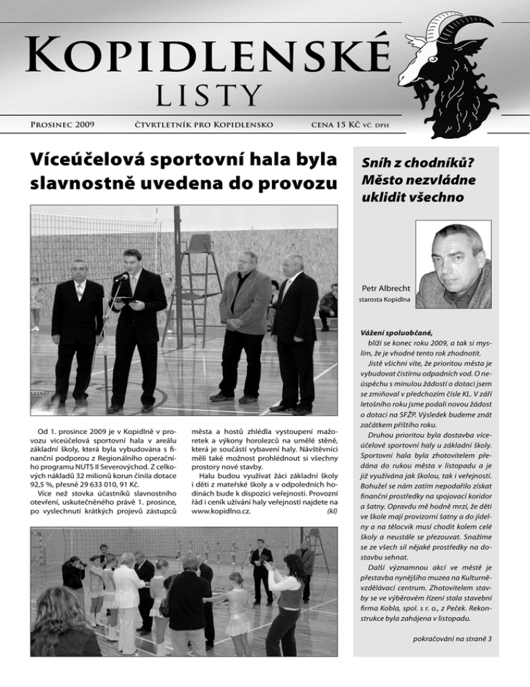 Kopidlenské list y Prosinec 2009 čtvrtletník pro Kopidlensko cena 15 Kč Víceúčelová sportovní hala byla slavnostně uvedena do provozu vč. dph Sníh z chodníků? Město nezvládne uklidit všechno Petr Albrecht starosta Kopidlna Od 1. prosince 2009 je v Kopidlně v provozu víceúčelová sportovní hala v areálu základní školy, která byla vybudována s finanční podporou z Regionálního operačního programu NUTS II Severovýchod. Z celkových nákladů 32 milionů korun činila dotace 92,5 %, přesně 29 633 010, 91 Kč. Více než stovka účastníků slavnostního otevření, uskutečněného právě 1. prosince, po vyslechnutí krátkých projevů zástupců města a hostů zhlédla vystoupení mažoretek a výkony horolezců na umělé stěně, která je součástí vybavení haly. Návštěvníci měli také možnost prohlédnout si všechny prostory nové stavby. Halu budou využívat žáci základní školy i děti z mateřské školy a v odpoledních hodinách bude k dispozici veřejnosti. Provozní řád i ceník užívání haly veřejností najdete na www.kopidlno.cz. (kl) Vážení spoluobčané, blíží se konec roku 2009, a tak si myslím, že je vhodné tento rok zhodnotit. Jistě všichni víte, že prioritou města je vybudovat čistírnu odpadních vod. O neúspěchu s minulou žádostí o dotaci jsem se zmiňoval v předchozím čísle KL. V září letošního roku jsme podali novou žádost o dotaci na SFŽP. Výsledek budeme znát začátkem příštího roku. Druhou prioritou byla dostavba víceúčelové sportovní haly u základní školy. Sportovní hala byla zhotovitelem předána do rukou města v listopadu a je již využívána jak školou, tak i veřejností. Bohužel se nám zatím nepodařilo získat finanční prostředky na spojovací koridor a šatny. Opravdu mě hodně mrzí, že děti ve škole mají provizorní šatny a do jídelny a na tělocvik musí chodit kolem celé školy a neustále se přezouvat. Snažíme se ze všech sil nějaké prostředky na dostavbu sehnat. Další významnou akcí ve městě je přestavba nynějšího muzea na Kulturněvzdělávací centrum. Zhotovitelem stavby se ve výběrovém řízení stala stavební firma Kobla, spol. s r. o., z Peček. Rekonstrukce byla zahájena v listopadu. pokračování na straně 3 strana 2 Kopidlenské prosinec 2009 list y Nevěsta i ženich ze základní školy? V Kopidlně je to možné K ŘÍJNOVÉMU VÝROČÍ Podobně jako v minulých letech se Kopidlno i tentokrát připojilo k uctění výročí konce první světové války. Starosta města Petr Albrecht v předvečer výročí vzniku samostatného československého státu položil vzpomínkové věnce k pomníku T. G. Masaryka u základní školy a k pomníku padlým na náměstí. V rámci projektového dne „Naše město“ se žáci 3. třídy ZŠ Kopidlno zúčastnili fiktivního svatebního obřadu, kde hlavními aktéry byli oni sami. Ženichem byl David Petr, nevěstou Aneta Cikánková. Svědky pak Roman Pažout a Kristýna Hloušková. Všichni se svých rolí zhostili na výbornou. Atmosféra se velmi podobala té při skutečném svatebním obřadu. Všichni zúčastnění byli společensky oblečeni, nechyběla saka, krásné šaty, prstýnky ani svatební kytice. Svatební hosté se chovali opravdu obřadně. Poděkování za přípravu celé akce jistě patří paní učitelce Kaskové, rodičům dětí, kteří s přípravou dětem pomohli, a určitě i dětem, s kterými jsme si to s panem starostou, coby oddávajícím, skvěle užili. R. Horynová, matrikářka Mikuláš rozdával dětem dárky RYBÁŘSKÉ ŽNĚ NA ZRCADLE Poslední říjnový víkend bylo na hrázi rybníka Zrcadlo ve Mlýnci nezvykle rušno. V chladném podzimním počasí tu postávalo mnoho lidí a silnice byla téměř zarovnaná nákladními auty postupně odvážejícími úrodu největšího rybníka Jičínska. Probíhal tu další díl podívané, která se opakuje jednou do roka. Rybáři organizovali své velké žně. Vedle kaprů vylovili rybáři vedení vedoucím rybářského střediska Kopidlno také amury, tolstolobiky, candáty, a dokonce i štiky. Výsledek letošního výlovu označil vedoucí Rybářského střediska Kopidlno pan Milan Vrba z pohledu minulých let jako průměrný. Zúčastněné rybáře, diváky, ale i hasiče, kteří pomáhali s občerstvením, hřál pocit, že se i letos na rybníce urodilo a na vánočním stole určitě mlýnecký kapr ani letos chybět nebude. (osu) Poslední kulturní akcí letošního roku v našem městě byla Mikulášská nadílka. Ve čtvrtek 3. prosince od 17 hodin na náměstí mohly děti i se svými rodiči odpočítat rozsvícení našeho krásného vánočního stromku a zhlédnout připravené vystoupení. Stínem na pěkném večeru byla jen technická závada, která omezila část programu. Moc nás mrzí, že se moderátorovi nepodařilo opravit a zprovoznit ozvučení, a nemohli jsme si tak společně zazpívat připravené vánoční písničky a koledy. Na závěr přišel Mikuláš a společně s čertem procházel mezi dětmi a za básničky a písničky rozdával připravené sladké odměny. (LN) prosinec 2009 Kopidlenské strana 3 list y Sníh z chodníků? Město nezvládne uklidit všechno Odstartovala rekonstrukce muzea v kulturní a vzdělávací centrum pokračování ze strany 1 Další problém nastal s přijetím nového zákona o pozemních komunikacích. Zde je třeba zareagovat na změnu povinností vlastníků komunikací a chodníků. Z toho vyplývá, že téměř veškerá údržba chodníků připadla městu. I přes doplnění a nákup nové techniky nebudeme schopni v zimním období včas zajistit údržbu všech chodníků a komunikací ve městě a našich obcích. Proto Rada města schválila Plán zimní údržby, kde jsou jednotlivé ulice udržovány podle důležitosti. A proto se na vás, vážení spoluob