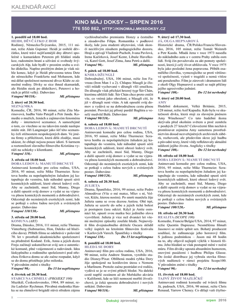 KALENDÁŘ AKCÍ KINO MÁJ DOKSY – srpen 2016 776 550 862, http://kinomaj.mksdoksy.cz 1. pondělí od 18.00 hod. Heidi, děvčátko z hor Rodinný, Německo/Švýcarsko, 2015, 111 minut, režie Alain Gsponer. Heidi je osiřelé děvčátko, které tráví nejšťastnější dny dětství společně s kamarádem Peterem při hlídání stáda koz, radostném hraní a užívání si svobody švýcarských Alp, kde bydlí v prostém srubu u svého dědečka. Naplno prožitým dnům je však náhle konec, když je Heidi převezena tetou Dete do německého Frankfurtu nad Mohanem, kde má dělat společnost nemocné dívce Kláře ze zámožné rodiny. Dívky se sice ihned skamarádí, ale Heidin stesk po dědečkovi, Peterovi a horách je příliš velký. Dabováno Vstupné 90/110,- Ml. přístupno 2. úterý od 20.30 hod. Sezn@mka Komedie, ČR, 2016, 90 minut, režie Zita Marinovová, hudba Vašo Patejdl a Petr Janda. Komedie o mužích, ženách a zajímavém fenoménu doby – internetové seznamce. A samozřejmě o tom, co všechno se na takovém rande naslepo může stát. Jiří Langmajer jako šéf této seznamky čelí stížnostem nespokojených dam. Ve jménu firmy a příležitosti, která dělá zloděje, musí ukázat, že chlapi nejsou pouze idioti. S šarmem a roztomilostí slavného filmového Kristiána vyráží na schůzky s klientkami. Vstupné 110,- Ml. přístupno 3. středa od 18.00 hod. Doba ledová: Mamutí drcnutí Animovaná komedie pro celou rodinu, USA, 2016, 95 minut, režie Mike Thurmeier. Scratova honba za nepolapitelným žaludem jej katapultuje do vesmíru, kde náhodně spustí sérii kosmických událostí, které ohrozí ledový svět. Aby se zachránili, musí Sid, Manny, Diego a další opustit svůj domov a vydat se na výpravu plnou komických momentů a dobrodružství. Odcestují do neznámých exotických zemí, kde se potkají s celou řadou nových a svérázných postav. Dabováno Vstupné 110/130,- Ml. přístupno 3. středa od 20.00 hod. Komuna (ART) Drama, Dánsko, 2016, 111 minut, režie Thomas Vinterberg (Submarino, Hon, Daleko od hlučícího davu). Příběh filmu se odehrává v polovině 70. let v prostředí akademického společenství na předměstí Kodaně. Erik, Anna a jejich dcera Freja začínají uskutečňovat svůj sen o autentické komuně, plné vzájemnosti a radovánek. Idea láskyplného a rodinného společenství pod střechou Erikova domu se ale začne rozpadat, když se do domu přistěhuje jeho milenka. V původním znění s titulky Vstupné 90,- Do 15 let nepřístupno 4. čtvrtek od 20.30 hod. Starci na chmelu (PROJEKT 100) Muzikál, Československo, 1964, 89 minut, režie Ladislav Rychman. Půvabná studentka Hanka se na chmelové brigádě stává středem zájmu 8 vychloubačného premianta Honzy a čestného a zásadového Filipa. Romantika v podkroví školy, kde jsou studenti ubytováni, však skončí necitlivým zásahem pedagogického dozoru. Hrají a zpívají Vladimír Pucholt, Ivana Pavlová, Irena Kačírková, Josef Kemr, Libuše Havelková, Karel Gott, Josef Zíma, Jana Petrů a další. Vstupné 90,- Ml. přístupno 5. pátek od 18.00 hod. Kniha džunglí Dobrodružný, USA, 106 minut, režie Jon Favreau (Iron Man 1 a 2). Chlapec Mauglí je člověčí mládě vychované v džungli vlčí smečkou. Do džungle však přichází hrozný tygr Šér Chán, kterému ublížili lidé. Šér Chán chce proto zničit vše, co vnímá jako ohrožení, a Mauglí cítí, že již v džungli není vítán. A tak opouští svůj domov a vydává se na dobrodružnou cestu plnou poznání. Provází jej přísný pardál Baghíra a veselý medvěd Balú. Dabováno Vstupné 90/110,- Ml. přístupno 6. sobota od 18.00 hod. Doba ledová: Mamutí drcnutí Animovaná komedie pro celou rodinu, USA, 2016, 95 minut, režie Mike Thurmeier. Scratova honba za nepolapitelným žaludem jej katapultuje do vesmíru, kde náhodně spustí sérii kosmických událostí, které ohrozí ledový svět. Aby se zachránili, musí Sid, Manny, Diego a další opustit svůj domov a vydat se na výpravu plnou komických momentů a dobrodružství. Odcestují do neznámých exotických zemí, kde se potkají s celou řadou nových a svérázných postav. Dabováno Vstupné 100/120,- Ml. přístupno 6. sobota od 20.30 hod. Julieta Drama, Španělsko, 2016, 99 minut, režie Pedro Almodóvar (Vše o mé matce, Mluv s ní, Volver, Kůže, kterou nosím). Po smrti manžela žije Julieta sama se svou dcerou Antíou. Obě trpí, Julieta se uzavře do sebe a jejich tichá bolest je postupem času odcizí. Když je Antíe osmnáct let, opustí svou matku bez jediného slova vysvětlení. Julieta ji více než dvanáct let všemi možnými způsoby zoufale hledá. Nejnovější film dvojnásobného držitele Oscara sklidil velký úspěch na letošním filmovém festivalu v Karlových Varech. Španělsky s titulky Vstupné 110,- Do 15 let nepřístupno 8. pondělí od 18.00 hod. Hledá se Dory Animovaný film pro celou rodinu, USA, 2016, 90 minut, režie Andrew Stanton, vyrobilo studio Disney/Pixar. Oblíbená modrá rybka Dory žije spokojeně na korálovém útesu s Nemem a Marlinem. Protože začne postrádat své rodiče, vydává se je se svými přáteli hledat. Na daleké cestě napříč oceánem až do Mořského akvária v Kalifornii, kde se léčí nemocní mořští živočichové, je čeká spousta dobrodružství i nových setkání. Dabováno Vstupné 90/110,- Ml. přístupno Dokský zpravodaj 9. úterý od 17.30 hod. Já, Olga Hepnarová Historické drama, ČR/Polsko/Francie/Slovensko, 2016, 105 minut, režie Tomáš Weinreb a Petr Kazda. Mladá žena v roce 1973 nasedla do nákladního auta a v centru Prahy zabila osm lidí. Svůj čin považovala za akt pomsty společnosti, která jí celý život ubližovala. V roce 1975 byla jako poslední žena popravena. Příběh osamělého člověka, vymezujícího se proti většinové