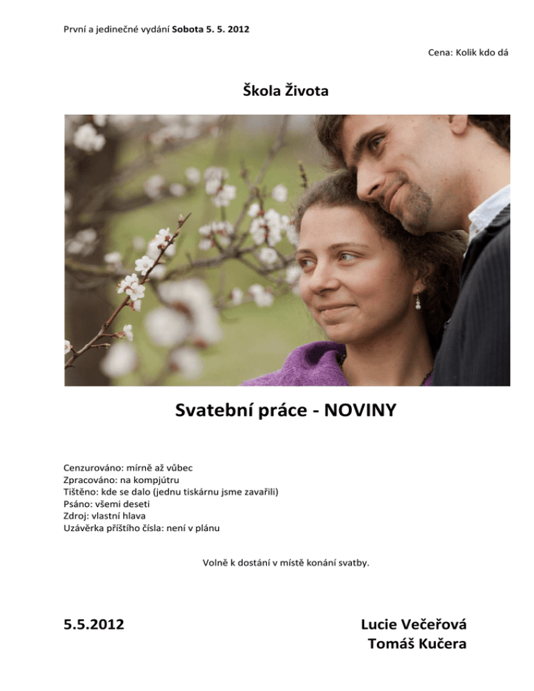 První a jedinečné vydání Sobota 5. 5. 2012 Cena: Kolik kdo dá Škola Života Svatební práce - NOVINY Cenzurováno: mírně až vůbec Zpracováno: na kompjútru Tištěno: kde se dalo (jednu tiskárnu jsme zavařili) Psáno: všemi deseti Zdroj: vlastní hlava Uzávěrka příštího čísla: není v plánu Volně k dostání v místě konání svatby. 5.5.2012 Lucie Večeřová Tomáš Kučera ÚVODNÍK Vážení svatebčané, dovolte, abychom Vás přivítali na svatební hostině a veselce zároveň. To, co se Vám právě dostává do rukou, je první a jedinečné vydání Svatebních novin vydaných ku příležitosti svatebního dne Lucky a Toma. Oba věříme, že poslední vydání…víte, kolik nám to dalo práce? Smyslem této tiskoviny je informovat o všem důležitém, vyplnit volné chvilky. A hlavně… pobavit Vás… Pokud budete mít pocit, že si tu z Vás někdy střílíme, máte pravdu;)! Přijměte také tyto noviny jako dárek od nás pro Vás na památku, klidně si je můžete odnést domů. Doufáme, že se Vám budou svatební noviny líbit. Pokud ne, napište do redakce, ale odpovědi se stejně asi nedočkáte ;+p… Přejeme Vám příjemné počteníčko. Lucka a Tom (šéfredaktoři) PODĚKOVÁNÍ Milí rodiče, děkujeme za vše, co trpělivostí jste pro nás kdy udělali a to nejen dnes, i že za námi s láskou a vždy stojíte a určitě vždy stát budete. Milí příbuzní, přátelé, kamarádi a kolegové, dovolte, abychom Vám všem touto cestou poděkovali za milou přítomnost na naší svatbě. Jsme rádi, že jste s námi prožili pro nás oba tak důležitý okamžik. Doufáme, že se dobře pobavíte a budete na náš den rádi vzpomínat. ZPRÁVA MÍSTNÍHO VÝZNAMU Na vědomost se dává, že na dnešní oslavě v orlovně v Jiříkovicích se musí dodržovat pořádek. Proto každý přijímá následující pravidla! 1) Oslava začne, když je zahájena, a skončí, až je ukončena. Přestřiženy dvě 2) Oslava se koná za každého počasí. Svatba bude v každém případě. občanky za bílého dne! 3) Vstupuje se dveřmi, je zakázáno vcházet oknem. 4) Vypadá to, že se každý umyl a učesal, plešky vyleštil. 5) Zasmušilé tváře, mrzouti, karty a náčiní na pletení zapomeňte doma! 6) Je zakázáno, cokoli chápat osobně či zle. Pokud to přesto někdo učiní, bude zastřelen…salvami smíchu. 7) Je zakázáno použít tyto noviny k jiným než určeným účelům. Jinak by byl vydavatel donucen příště tisknout na smirkovém papíře! 8) Ohnivými pohledy se smí kvůli nebezpečí požáru házet jen velmi opatrně. 9) Při společném zpěvu musí zpívat skutečně všichni! Kdo chraptí, zpívá o přestávkách. 10) Smát se smí i bez vyzvání. K tanci a poslechu nám zahraje kapela RIO, která přijede z nedalekých Křenovic. Novomanžele fotí talentovaní fotografové: Jiří Dukát, který přijel z blízkého Brna a Ivetka Koutná z Pošukova. Hostinu uvařila paní Buchtová z Jiříkovic a práci na baru zastávají schopní pomocníci: Alča Daňková, Ondra Divácký, Radek Chudiak, Mira Šupina a Verča Šupová. Po domluvě s restaurací Vás prosíme, abyste dary, které se nevejdou dovnitř, zaparkovali či odložili venku. Děkujeme Oznámení Tímto obrázkem vás moc nepřekvapíme, ale k dnešnímu dni neodmyslitelně patří. Jsme na něj patřičně hrdi, protože prošel dlouhou vývojovou fází, spoustou nezdařených pokusů a úprav a musíme přiznat, že jsme naší vlastní tvorbou překvapili sami sebe. Musíme říct, že jsme si na n něm nacvičili nejen své matematické dovednosti, tj. výpočet umístění ohýbacích hran a dírek pro umístění mašličky, ale také počítačových, kdy z hrubého powerpointového návrhu se stalo dílo. Otočit pozadí zrcadlově byl vyšší level manažerské informatiky. Nejdůležitější část textu vznikla uprostřed noci spolu s prvotním návrhem a kupodivu v ní stačilo změnit jedno slovo a byla hotová. S citátky to bylo horší. Biblický citátek nebo nějaký ze života? Nejlépe asi oba. „Nikdy tě neopustím a nikdy se tě nezřeknu“. nezřekn Lucce se líbilo, Tom měl pocit, že tomu ještě něco chybí. A tak jsme za dlouhého zimního večera prošli sbírku starých svatebních oznámení, při nichž jsme se výborně pobavili. V jakém směru se zábava šinula docela pěkně shrnuje úryvek z naší debaty: Tom:: „Zůstalo nám tu 6 hezkých návrhů na citát na oznámení.“ Lucka: „No, jeden horší než druhý.“ Text byl hotov. Příběh rukou vymyslel Tom už před dvěma lety. Po focení nás bolely ruce jak po pořádné posilovně, ale stálo to za to. Na co to natisknout? Prolezli Prolezl jsme internet křížem krážem ážem a nenašli žádné papíry z jedné strany ozdobné a z druhé strany hladké vhodné pro tisk. Po několika měsících hledání Tom našel obchůdek na okraji Brna s papírovou galerií. To je naše poslední šance. Vyrážíme tam. V budově jsou pouze kanceláře a výroba nábytku, paní se na nás dívá velmi pobaveně. Neúspěšně odcházíme. Cestou zahlídneme miniobchůdek s papíry, máme málo času, oni mají polední přestávku a zvažujeme, jestli čekat nebo ne. Když už jsme tady, čekáme. Paní nám nabízí velký ký výběr nádherných papírů přesně podle našich představ. Tom dokoupil mašličky, jedno odpoledne jsme udělali manufakturu, řezali, děrovali a vázali a bylo skoro hotovo. TADY JSME UŽ DNESKA BYLI Poutní místo Lutršték Na kopci "Vinohrady" "Hojdě" (Heide) severozápadně od Němčan nalézá se studánka s velmi zdravou, ba snad i zázračnou vodou pode jménem "Luterštek". Název tohoto poutního místa "Lutršték" vznikl údajně z německého "lauter Steg". Nad samou studánkou vystavěná jest malá kaplička z let 1867-1877 z milodarů poutníků, kteří přicházeli k nedaleké stu
