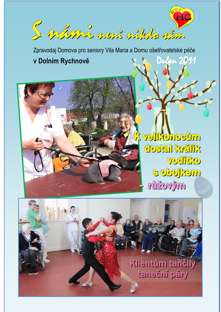 S námi není nikdo sám Zpravodaj Domova pro seniory Vila Maria a Domu ošetřovatelské péče v Dolním Rychnově Duben 2011 K velikonocům dostal králík vodítko s obojkem - růžovým K Klliieennttůům m ttaannččiillyy ttaanneeččnníí ppáárryy nnaarroozzeenniinnáám m Slavila s rodinou, s pacienty i ředitelkou Paní Balážová v Domu ošetřovatelské péče oslavila své 83. narozeniny. Chtěla je oslavit nejen v kruhu rodiny, která za ní přijela odpoledne, ale i se svými spolupacienty. Domluvili jsme se, jakým způsobem si oslavu představuje, a vše jsme 7. dubna ke spokojenosti paní Balážové připravili. Sešli jsme se všichni z 1. stanice léčebny v jídelně a oslavenkyni jsme popřáli. Poslouchala se hudba, povídalo se a hlavně vzpomínalo. Ten den byla v práci i paní ředitelka M. Radošová Scholzová, která se ke gratulaci přidala. jch Dárek pro pana faráře Klientka paní Valerie Burianová předala při bohoslužbě, které se konají ve společenském sále léčebny, dárek panu faráři Petru Bauchnerovi. Předtím věnovala Domu ošetřovatelské péče požehnání v podobě obrázku při prvním otevření nové socioterapie a rozhodla se věnovat římskokatolické faře v Sokolově sádrovou Madonku. Klientům zatančily taneční páry V závěru března se poprvé realizoval slib vedení Městského domu kultury v Sokolově, že v Domě ošetřovatelské péče v Dolním Rychnově letos vystoupí různá uskupení, která mají svůj „domovský přístav“ právě v sokolovském kulturáku. Vystoupení tanečníků z Tanečního klubu MDK přiblížil tanečník Jan Onder, který pořad v DOP moderoval: 23. března jsme Vám a Vašim klientům představili TK MDK Sokolov (taneční klub městského domu kultury), který funguje více než 50 let. K vidění byly tance latinsko-americké (samba, chacha, rumba a jive) a tance standardní (waltz, tango, quickstep). Krátkým programem prováděl Jan Onder, tanečník nejvyšší mezinárodní třídy M, trenér párů a také vedoucí klubu. Jednotlivé tance předvedly tři nadějné páry kategorie "junior 2 hobby" a sice Miloslav Čermák a Kristýna Forejtková, Petr Smíšek a Markéta Mullerová, Alexandr Reichmann a Hanka Kreitlová. Pro všechny z nás byl čas u Vás strávený velmi příjemný, myslím, že jsme snad přispěli k lepší náladě Vašich seniorů přesto, že podmínky byly pro nás obtížnější, především kvůli malému prostoru a poměrně tichému CDpřehrávači. Těšíme se na příště, s pozdravem Jan Onder Vaření dvou obědů je náročnější hlavně v přípravě jídelníčku Dva měsíce kuchyň Domu ošetřovatelské péče vaří k obědu dvě jídla, která mají strávníci na výběr. Provoz je zkušební - výběr ze dvou jídel má zatím jen personál. Dvě jídla i pro pacienty léčebny a klienty DPS Vily Maria začne v létě. Nyní se dva obědy vaří pro asi sedmdesát strávníků. "Je to náročné organizačně, museli jsme nakoupit více gastronádob, zřejmě ještě pořídíme elektrickou profi pánev, což je ale otázka financí. Také jsme museli v kuchyni posílit ranní směnu. Možná si kuchyňský personál zatím ještě zvyká, ale strávníci jsou snad spokojenější," uvedla Sabina Hajná z vedení DOP HC. "Je to hodně náročné na sestavování jídelníčku," říká vedoucí kuchyně Eva Volfová, "abychom to zvládli časově, musím připravit jídelníček tak, aby v každém dni bylo vedle náročnějšího jídla i jídlo, jehož příprava zabere méně času." S vařením dvou jídel přišla nutnost pro strávníky objednávat vybrané jídlo předem. To určité komplikace přináší, připouští vedoucí jídelny. Při samotném vaření však problémy nejsou. "Nevidím v tom žádný problém, vaří se mi stejně dobře, jako když jsme vařili jedno jídlo," říká kuchařka Jaruška Runkasová. Příprava na vaření dvou obědů i pro klienty je náročnější i ve stolování - někteří pacienti léčebny se stravují v jídelně, někteří na svých pokojích. Jim obědy rozvážejí ošetřovatelé a právě s tím je spojena komplikace. "Řešíme otázku rozvozu obědů na stanice v mobilních gastronádobách, ve kterých ale není dostatečně místa na dva obědy," říká Sabina Hajná s tím, že jedním z možných řešení budou menší nádoby. ak Školení přímo v provozu Ve dnech 15. a 16. března proběhlo v Domě ošetřovatelské péče dvoudenní školení personálu v aplikaci inkontinenčních pomůcek. Školení prováděla slečna Štěpánka Šmídová z firmy SCA HYGIENE PRODUCTS, s.r.o. Štěpánka pracovala s ošetřovatelským personálem přímo v provozu, kde kontrolovala, zda je správně zvolena pomůcka a zda je správně aplikována a prováděna potřeba výměny. Velký důraz byl kladen hlavně na vysazování pacientů na WC, kdy dochází k tzv. nácviku kontinence. V odpoledních hodinách proběhla krátká schůzka s "TENA sestřičkami" (ošetřovatelky, odpovídající na stanicích za spotřebu ink. pomůcek), které se Štěpánkou probíraly problémy související s plánováním a samotnou spotřebou těchto pomůcek. Ze školení si všechen personál odnesl spoustu nových poznatků a určitě jej v budoucnu zopakujeme. Ilona Budínová, vrchní sestra Country s Rangers a Barborkou Již dlouho jsme se těšili na živou country hudbu a 29. března mezi nás přišla kapela The Rangers group ve složení manželé Miloslav a Miluše Zadákovi, pan Milan Bakura a pan Štefan Jurčík, ti hráli na kytary a zpěv obstarával pan Josef Pleir. Kapela, hrající bluegrass a trampský žánr, vystupuje pod záštitou Sjednocené organizace nevidomých a slabozrakých. Celé vystoupení zahájila recitací žákyně Barborka Hendrychová ze 4. A na 6. ZŠ v Sokolově, a to básničkou od Zdeňka Svěráka Byl rodič a měl
