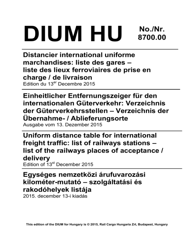 DIUM HU No./Nr. 8700.00 Distancier international uniforme marchandises: liste des gares – liste des lieux ferroviaires de prise en charge / de livraison Edition du 13er Decembre 2015 Einheitlicher Entfernungszeiger für den internationalen Güterverkehr: Verzeichnis der Güterverkehrsstellen – Verzeichnis der Übernahme- / Ablieferungsorte Ausgabe vom 13. Dezember 2015 Uniform distance table for international freight traffic: list of railways stations – list of the railways places of acceptance / delivery Edition of 13st December 2015 Egységes nemzetközi árufuvarozási kilométer-mutató – szolgáltatási és rakodóhelyek listája 2015. december 13-i kiadás This edition of the DIUM for Hungary is © 2015, Rail Cargo Hungaria Zrt, Budapest, Hungary HU (55) TABLE DES MATIÈRES Pages Dates et informations importantes Avant-Propos Carte schématique des points frontières Tableaux des distances Distances de transit UTI-terminals Liste des EF avec leurs codes RICS qui sont représentées dans cette édition INHALTSVERZEICHNIS 3 5 13 15 97 103 105 Seiten Datum und wichtige Informationen Vorwort Schematische Karte der Grenzübergangspunkte Entfernungszeiger Transitentfernungen UTI-Terminals Auflistung der EVU mit ihrem RICS-Code dieser Ausgabe CONTENTS 3 7 13 15 97 103 105 Pages Data and significant information’s Foreword Schematic Map: Frontier points Distance Table Transit distances UTI-terminals List of the RUs and their RICS codes that are presented in this edition 3 9 13 15 97 103 105 TARTALOMJEGYZÉK Oldal Dátum és fontos információk Előszó Határátmeneti pontok sematikus térképe Kilométer-mutató Tranzit távolságok UTI - terminálok E kiadásban szereplő vasútvállalatok és RICS–kódjuk 3 11 13 15 97 103 105 The International Union of Railways (UIC) Paris holds the rights to distribute by electronic media. 2 2015-12-13 HU (55) Dates et informations importantes – Datum und wichtige Informationen Data and significant informations – Dátum és fontos információk I. Date d’édition – Ausgabedatum – Date of the edition – Kiadás dátuma: 2015-12-13 Date de rédaction – Erstellungsdatum – Date of elaborate – Készítés dátuma: 2015-11-15 II. Informations importantes Cette édition reprend les modifications ci-après intervenues jusqu’à la date d’édition. Les informations relatives aux gares ont été préparées par l’entreprise ferroviaire responsable de l’édition des données DIUM pour la pays concené. Pour toute question relative à la présente édition, veuillez contacter la personne de contact pour la pays concerne. Tous les renseignements figurant dans le DIUM sont seulement destinés à faciliter l'information de la clientèle. Il s'agit d'une énumération des particularités les plus importantes. La liste complète de toutes les particularités ayant un caractère obligatoire est présentée dans les tarifs intérieurs des différents réseaux. En conséquence, les indications du DIUM n'engagent pas la responsabilité des chemins de fer. L’entreprise ferroviaire responsable conserve toutefois tous les droits de propriété intellectuelle sur les informations publiées. Wichtige Informationen Diese Ausgabe nimmt die nachfolgenden Änderungen bis zum Ausgabedatum auf. Die Informationen über die Bahnhöfe sind durch das federführende EVU eines Landes ausgearbeitet worden. Für weitere Fragen zur vorliegenden Ausgabe kontaktieren Sie bitte die Ansprechpartner des zuständigen Landes. Sämtliche im DIUM enthaltenen Hinweise sind als Behelf im kundendienstlichen Sinne zu verstehen. Es handelt sich um eine Aufzählung der wichtigsten Besonderheiten. Die vollständige und vor allem rechtlich verbindliche Darstellung aller Besonderheiten ist in den Binnentarifen enthalten. Die Angaben des DIUM begründen daher keine eisenbahnrechtliche Haftung. Das verantwortliche EVU behält sich alle Rechte geistigen Eigentums auf die veröffentlichten Informationen vor. Significant information This edition takes again the modifications hereafter which have taken place until the date of Edition of date of the edition. Information relating to the stations was prepared by the railway undertaking responsible for the edition of data DIUM for the concerned country. For any question relative to the present edition, please contact the person whose co-ordinates are taken again. All information shown in the DIUM is intended solely to guide customers, and is a list of the most important special provisions. The full list of all special provisions of an obligatory nature is set out in the internal tariffs of the various railways. In consequence, the railways are not liable for inaccuracies in the information contained in the DIUM. Fontos információk Ez a kiadás a készítés dátumáig történt módosításokat tartalmazza. Az állomásokra vonatkozó adatokat az ország ügyvezető vasútvállalata dolgozta ki. A jelen kiadásra vonatkozó további kérdéseivel forduljon az adott ország kapcsolattartójához. A DIUM-ban lévő minden utalást (adatot) ügyfélszolgálati értelemben segédletnek kell tekinteni. A DIUM-ban csak a legfontosabb lábjegyzetek találhatók. Minden lábjegyzet teljes és mindenekelőtt jogilag kötelező szövegét a belföldi díjszabások tartalmazzák. A DIUM adatai tehát nem szolgálnak semmiféle vasútjogi felelősség alapjául A felelős vasútvállalat fenntartja magának a szellemi termékre vonatkozó jogát a közzétett információk vonatkozásában. 3 2015-12-13 HU (55) Personne de contact - Ansprechpartner - Contact details – Kapcsolattartó: ÉDES László nom de l’Entreprise Ferroviaire / Name des EVU / name of the railway / vasútvállalat: Rail Cargo Hungaria Zrt. (RCH) division et/ou bureau / Abteilung / division / ügyosztály: Produktionslogistik adresse complète / Adresse / address / cím: Váci út 92. H-1133 Budapest (H-1392 Budapest PF 358) Tel./phone: +36 (1) 512 7424 GSM: +36 (30) 