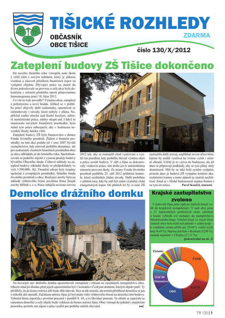 číslo 130/X/2012 Zateplení budovy ZŠ Tišice dokončeno Do nového školního roku vstoupila naše škola z větší části s novým kabátem, který je pěknou vizitkou a zároveň příslibem finančních úspor za vytápění objektu. Zbývající práce na straně do dvora pokračovaly za provozu a celá akce byla dokončena v mírném předstihu oproti plánovanému harmonogramu prací 18. října 2012. Co vše se tedy povedlo? Výměna oken, zateplení z polystyrenu a nová fasáda. Jelikož se v průběhu prací objevily další nedostatky, operativně se odstraňovaly i závady, které nebyly v plánu. Například vadná střecha nad školní kuchyní, některé instalatérské práce, nátěry okapů atd. I když to znamenalo navýšení finančních prostředků, bylo nutné tyto práce zabezpečit, aby v budoucnu nevznikly škody daleko větší. Zateplení budovy ZŠ bylo financováno z dotace Fondu životního prostředí. Žádost o finanční prostředky na tuto akci podalo již v roce 2007 bývalé zastupitelstvo, kdy zároveň proběhla akceptace, ale pro nedostatek vlastních finančních prostředků obce se akce odkládala až do letošního roku. Spolufinancování se podařilo zajistit z výnosu prodeje budovy bývalého Obecního úřadu. Celkové náklady na zateplení budovy základní školy se předpokládaly ve výši 3.590.000,- Kč. Finanční zdroje byly čerpány společně z evropských prostředků, Státního fondu životního prostředí a obce. Realizací stavby byla na základě výběrového řízení pověřena firma Šnajdr stavby Mělník s. r. o. Práce zahájila na konci června 2012 tak, aby se nenarušil chod vyučování a využil čas prázdnin, kdy proběhla hlavně výměna oken a práce uvnitř budovy. V září a říjnu se dokončovaly venkovní práce, tím došlo jen k minimálnímu omezení provozu školy. Ze strany Fondu životního prostředí proběhla 25. září 2012 průběžná kontrola, která neshledala žádné závady. Další proběhne v příštím roce, kdy by měl být znám výsledný efekt energetických úspor. Do příštích let by si naše ZŠ Demolice drážního domku zasloužila další rozvoj, například novou tělocvičnu, kterou by mohli využívat ke svému vyžití i ostatní občané. Určitě je to výzva do budoucna, ale již dnes se připravují podklady, aby se tyto plány staly skutečností. Měl by se také řešit systém vytápění, protože dnes je budova ZŠ vytápěna letitými akumulačními kamny a tento způsob je značně neefektivní. Snad se v blízké budoucnosti najdou finance i na tyto investice. Pavel Končel, starosta Krajské zastupitelstvo zvoleno V polovině října jsme opět po čtyřech letech volili do krajských zastupitelstev. V naší obci jsme z 21 nejrůznějších politických stran, sdružení a koalic vybírali své zástupce do zastupitelstva Středočeského kraje. Volební účast ve všech třech částech obce byla nižší než průměr v celém kraji – k volebním urnám přišlo jen 29,68 % voličů (celý kraj 36,45 %). Nejvíce jich bylo v Kozlech (32,99 %), naopak nejméně v Chrástu (27,31 %). (pokračování na str. 2) Ostatní ČSSD Na havarijní stav drážního domku upozorňovali zastupitele i občané na zasedáních zastupitelstva obce. Obecní úřad již dlouho před jejich upozorněním byl v kontaktu s Českými drahami, kterým objekt patří. Ty přislíbily, že do konce měsíce září bude zlikvidován. Sice se tak nestalo, ale termín přislíbené demolice se jen o několik dní opozdil. Začátkem měsíce října již byl znám vítěz výběrového řízení na demolici této budovy. Vybraná firma započala s prvními pracemi v pondělí 8. 10., a to likvidací porostu. Ve středu se započalo se samotnou demolicí a celý objekt bude vyklizen do konce měsíce října. Obec vstoupí do jednání s majitelem pozemku, protože má zájem o jeho využití pro potřeby našich obyvatel. nač TOP 09 Starostové KSČM ODS TR 130 1 ZPRÁVY Z OZ 9. října 2012 OZ souhlasí s převzetím pozemku p. č. 237/2 v k.ú. Chrást u Tišic dle nově vypracovaného geometrického plánu do majetku obce a zároveň i budovy restaurace, která byla na tomto pozemku postavena OZ schválilo Rozpočtové opatření č. 2 Krajské zastupitelstvo zvoleno dokončení ze str. 1 Oproti minulým volbám byl poměrně vysoký počet neplatných hlasů – celkem 16, nejvíce pak v Kozlech, kde jich bylo osm A jak to dopadlo? Celkově ve třech našich volebních okrscích zvítězila ČSSD s 29,27 %, druhé místo obsadila KSČM s 19,36 % a třetí příčka patří ODS s 17,34 %. Potřebných pět procent ještě překročily TOP 09 a Starostové pro STČ (9 %), ostatní politické strany, hnutí a koalice nezískaly potřebný počet hlasů (0,22 až 3,37 %). Pokud jde o jednotlivé volební okrsky v naší obci, v Chrástu a v Tišicích vyhrála ČSSD (35,71 a 25,58 %), v Kozlech KSČM (24,36 %). Druhé místo získala v Chrástu ODS (17,34 %), v Tišicích KSČM (20,15 %) a v Kozlech ČSSD (22,68 %). Třetí příčka pak patří ODS v Kozlech (20,16 %) a Tišicích (14,72 %) a KSČM v Chrástu (15,81 %). Výsledky ostatních se držely ve všech volebních okrscích obce na stejné úrovni, alespoň jeden volební hlas získaly všichni z 21 kandidujících subjektů. oja Příprava na zimu Paní Zima už nenápadně poslala řidičům první pozdrav a ti mohli trénovat škrábání namrzlých skel. Je to upozornění jednak na výměnu letních pneumatik za zimní, což je nutné učinit nejpozději k 1. listopadu, jednak na parkování na obecních komunikacích. Vzhledem k blížící se zimě s ohledem na údržbu komunikací a náročnější svoz domovního odpadu bude v příštích dnech odpovědnými pracovníky OÚ spolu s členy zastupitelstva provedena kontrola místních komunikací. Již v roce 2011 byli občané upozorněni na