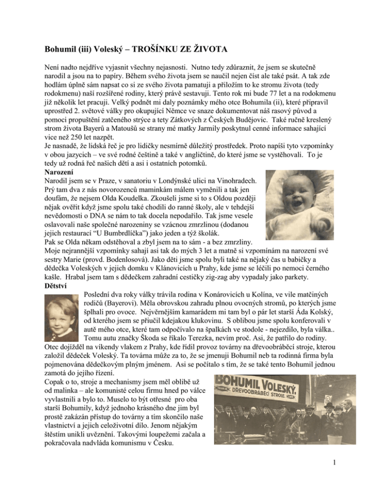 Bohumil (iii) Voleský – TROŠÍNKU ZE ŽIVOTA Není nadto nejdříve vyjasnit všechny nejasnosti. Nutno tedy zdůraznit, že jsem se skutečně narodil a jsou na to papíry. Během svého života jsem se naučil nejen číst ale také psát. A tak zde hodlám úplně sám napsat co si ze svého života pamatuji a přiložím to ke stromu života (tedy rodokmenu) naší rozšířené rodiny, který právě sestavuji. Tento rok mi bude 77 let a na rodokmenu již několik let pracuji. Velký podnět mi daly poznámky mého otce Bohumila (ii), které připravil uprostřed 2. světové války pro okupující Němce ve snaze dokumentovat náš rasový původ a pomoci propuštění zatčeného strýce a tety Zátkových z Českých Budějovic. Také ručně kreslený strom života Bayerů a Matoušů se strany mé matky Jarmily poskytnul cenné informace sahající vice než 250 let nazpět. Je nasnadě, že lidská řeč je pro lidičky nesmírně důležitý prostředek. Proto napíši tyto vzpomínky v obou jazycich – ve své rodné češtině a také v angličtině, do které jsme se vystěhovali. To je tedy už rodná řeč našich dětí a asi i ostatních potomků. Narození Narodil jsem se v Praze, v sanatoriu v Londýnské ulici na Vinohradech. Prý tam dva z nás novorozenců maminkám málem vyměnili a tak jen doufám, že nejsem Olda Koudelka. Zkoušeli jsme si to s Oldou později nějak ověřit když jsme spolu také chodili do ranné školy, ale v tehdejší nevědomosti o DNA se nám to tak docela nepodařilo. Tak jsme vesele oslavovali naše společné narozeniny se vzácnou zmrzlinou (dodanou jejich restaurací “U Bumbrdlíčka”) jako jeden a týž školák. Pak se Olda někam odstěhoval a zbyl jsem na to sám - a bez zmrzliny. Moje nejrannější vzpomínky sahají asi tak do mých 3 let a matně si vzpomínám na narození své sestry Marie (provd. Bodenlosová). Jako děti jsme spolu byli také na nějaký čas u babičky a dědečka Voleských v jejich domku v Klánovicích u Prahy, kde jsme se léčili po nemoci černého kašle. Hrabal jsem tam s dědečkem zahradní cestičky zig-zag aby vypadaly jako parkety. Dětství Poslední dva roky války trávila rodina v Konárovicích u Kolína, ve vile matčiných rodičů (Bayerovi). Měla obrovskou zahradu plnou ovocných stromů, po kterých jsme šplhali pro ovoce. Nejvěrnějším kamarádem mi tam byl o pár let starší Áda Kolský, od kterého jsem se přiučil kdejakou klukovinu. S oblibou jsme spolu konferovali v autě mého otce, které tam odpočívalo na špalkách ve stodole - nejezdilo, byla válka.. Tomu autu značky Škoda se říkalo Terezka, nevím proč. Asi, že patřilo do rodiny. Otec dojížděl na víkendy vlakem z Prahy, kde řídil provoz továrny na dřevoobráběcí stroje, kterou založil dědeček Voleský. Ta továrna může za to, že se jmenuji Bohumil neb ta rodinná firma byla pojmenována dědečkovým plným jménem. Asi se počítalo s tím, že se také tento Bohumil jednou zamotá do jejího řízení. Copak o to, stroje a mechanismy jsem měl oblibě už od malinka – ale komunisté celou firmu hned po válce vyvlastnili a bylo to. Muselo to být otřesné pro oba starší Bohumily, když jednoho krásného dne jim byl prostě zakázán přístup do továrny a tím skončilo naše vlastnictví a jejich celoživotní dílo. Jenom nějakým štěstím unikli uvěznění. Takovými loupežemi začala a pokračovala nadvláda komunismu v Česku. 1 Školy Do školy jsem začal chodit v Konárovicích, ale s koncem války jsme se vrátili do Prahy, kde se oteci podařilo najmout veliký byt v Myslíkově ulici č.4, za rohem od Vltavy. Pamatuji se, že my děti jsme tím bytem projížděli na nových kolech. Pak se do základní chlapecké školy ve Vladislavově ulici nahrnuly holky jak začala škola být smíšenou. Po osmi letech jsem šel na “střední průmyslovou školu strojní”(1953-1957), která byla v Preslově ulici na Smíchově, přes most od nás. Co jsme tam vyváděli, můžete se částečně dozvědět na web-stránkách naší třídy L4, tady: http://www.spoluzaci.cz/876513 To divné označení “L” jsme dostali jak “loďaři” neb jsme se měli specializovat na stavbu lodí. To se take stalo a nemělo to ale nic společného s mojí vlastní zálibou ve vodních sportech kde jsem se jakousi náhodou dostal mezi tehdy zakázané vodní skauty. Tato skupinka fungovala pod záštitou pražského yachtklubu a tak přes pádlování na pramičkách a letní táboření jsem se dostal i k závodnímu plachtění na plachetnicích třídy “Pirát” do juniorského mistrovství republiky. Té skautské skupince vděčím za překrásný teen-age a celoživotní kamarády. Ještě s jedním z nich jsme asi měli moc velký přebytek energie, který se asi nestačil vyčerpat plachtěnim a leštěním den závodních plachetnic a tak jsme se dali do zdolávání divokých řek a závodění ve vodním slalomu – na double kanoi. To byla ta správná dřina a těch kanoí jsme přitom mnoho rozbili - a museli jich tudíž mnoho postavit. Dobrá manuelní praxe ! Asi také díky intensivnímu pádlařskému treningu jsem jeden z mála, který si teď k stáru nestěžuje na bolesti zad. Byli jsme s kamarádem, přezdívaným “Kušna”, po hezkých pár let jako vodní dvojčata. Nakonec jsme se museli jaksi rozhodnout, jestli tedy budeme pádlíři - anebo inženýři. To už jsme byli oba na vysoké škole (universita, ČVUT – 1957-1962). Studentská leta byla báječná a na škole to nějak dobře šlo a tak jsem odpromoval jako strojní inženýr - se specializací na chemické a potravinářské stroje a s ambicema. To podotýkám, protože mě to nasměrovalo do dalšího života. Finta č.1 S komunisty to prostě nešlo vyjít a hodně mě vadili. Už od mlada a po celou dobu studií jsem chtěl poznat svět, cestovat, učit se něco novéh