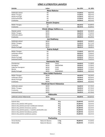 VÍNO V LITROVÝCH LAHVÍCH Odrůda Lahev Bez DPH Vč. DPH 57,00 Kč 57,00 Kč 57,00 Kč 57,00 Kč 55,00 Kč 68,97 Kč 68,97 Kč 68,97 Kč 68,97 Kč 66,55 Kč 68,50 Kč 68,50 Kč 82,89 Kč 82,89 Kč 68,00 Kč 64,00 Kč 61,00 Kč 69,00 Kč 82,28 Kč 77,44 Kč 73,81 Kč 83,49 Kč 48,00 Kč 51,00 Kč 48,00 Kč 48,00 Kč 58,08 Kč 61,71 Kč 58,08 Kč 58,08 Kč 57,00 Kč 60,00 Kč 62,00 Kč 65,00 Kč 62,00 Kč 68,97 Kč 72,60 Kč 75,02 Kč 78,65 Kč 75,02 Kč 59,00 Kč 59,00 Kč 59,00 Kč 59,00 Kč 55,00 Kč 71,39 Kč 71,39 Kč 71,39 Kč 71,39 Kč 66,55 Kč 49,00 Kč 50,00 Kč 50,00 Kč 50,00 Kč 59,29 Kč 60,50 Kč 60,50 Kč 60,50 Kč 56,00 Kč 56,00 Kč 56,00 Kč 56,00 Kč 67,76 Kč 67,76 Kč 67,76 Kč 67,76 Kč 85,00 Kč 102,85 Kč 85g 85g 85g 85g 85g 85g 85g 23,00 Kč 23,00 Kč 23,00 Kč 23,00 Kč 23,00 Kč 23,00 Kč 23,00 Kč 26,45 Kč 26,45 Kč 26,45 Kč 26,45 Kč 26,45 Kč 26,45 Kč 26,45 Kč 110g 110g 50,00 Kč 50,00 Kč 57,50 Kč 57,50 Kč Réva Rakvice Veltlínské zelené Müller Thurgau Modrý Portugal Svatovavřinecké Frankovka VR VR VR VR VR Znovín Znojmo Müller Thurgau Frankovka VR VR Vinné sklepy Valtice a.s. Vlašský ryzlink Müller Thurgau Veltlínské zelené Frankovka NEVR NEVR NEVR NEVR Veltlínské zelené Müller Thurgau Frankovka Modrý Portugal NEVR NEVR NEVR NEVR Müller Thurgau Veltlínské zelené Frankovka Modrý Portugal Svatovavřinecké VR VR VR VR VR Livi Dubňany Patria Kobylí Harmonia Vini Chardonnay Sauvignon Cabernet Sauvignon Merlot Modrý Portugal NEVR NEVR NEVR NEVR NEVR CHILE ARGENTINA CHILE CHILE MADARSKO Víno Velké Pavlovice Müller Thurgau Veltlínské zelené Modrý Portugal Frankovka NEVR NEVR NEVR NEVR Vinohrad Horní Věstonice Veltlínské zelené Müller Thurgau Frankovka Svatovavřinecké NEVR NEVR NEVR NEVR veltlínské zelené Hebenstrait NEVR Rakousko Olivy Sušené olivy Zelené olivy plněné chilli pastou Zelené olivy plněné jemným tuňákovým krémem Zelené olivy plněné citronovou pastou Zelené olivy plněné pastou z modrého plísňového sýra Zelené olivy plněné česnekovou pastou Zelené olivy plněné sardelovou pastou Pochutiny Vinná Horčice Vinné želé Naturvini Bavory Naturvini Bavory Strana 1 ROZLÉVANÁ VÍNA, SUDOVÉ, BAG IN BOX, MALÉ LAHVE Objem Bez DPH Vč. DPH 2,00 1,50 1,50 1,50 1,50 1,50 1,50 2,00 106,00 Kč 105,00 Kč 125,00 Kč 132,00 Kč 130,00 Kč 105,00 Kč 120,00 Kč 115,00 Kč 128,26 Kč 127,05 Kč 151,25 Kč 159,72 Kč 157,30 Kč 127,05 Kč 145,20 Kč 139,15 Kč Velkobílovická vína Velkobílovická vína Velkobílovická vína Chile Velkobílovická vína á 1l á 1l á 1l á 1l á 1l 39,00 Kč 42,00 Kč 56,00 Kč 42,00 Kč 42,00 Kč 47,19 Kč 50,82 Kč 67,76 Kč 50,82 Kč 50,82 Kč 0,00 Kč Chile Chile Velkobílovická vína Velkobílovická vína á 1l á 1l á 1l á 1l 39,00 Kč 47,00 Kč 42,00 Kč 39,00 Kč 47,19 Kč 56,87 Kč 50,82 Kč 47,19 Kč Bunža Bzenec Bunža Bzenec Bunža Bzenec Bunža Bzenec Bunža Bzenec Bunža Bzenec Itálie á 5l á 5l á 5l á 5l á 5l á 5l á 3l 280,00 Kč 280,00 Kč 280,00 Kč 280,00 Kč 280,00 Kč 280,00 Kč 173,00 Kč 338,80 Kč 338,80 Kč 338,80 Kč 338,80 Kč 338,80 Kč 338,80 Kč 209,33 Kč Maďarsko á 3l 150,00 Kč 181,50 Kč á 5l 220,00 Kč 266,20 Kč Itálie á 5l 300,00 Kč 363,00 Kč Itálie á 10l 560,00 Kč 677,60 Kč á 5l 310,00 Kč 375,10 Kč 590,00 Kč Itálie Itálie Itálie Itálie Chile Chile á 10l á 5l á 5l á 5l á 5l á 5l á 5l 310,00 Kč 330,00 Kč 365,00 Kč 250,00 Kč 250,00 Kč 250,00 Kč 713,90 Kč 375,10 Kč 399,30 Kč 441,65 Kč 302,50 Kč 302,50 Kč 302,50 Kč 0,00 Kč Bag in box 5l Itálie á 5l 330,00 Kč 399,30 Kč Vino Rosso Tavernello Merlot IGT Bag in box 5l Bag in box 3l Itálie á 5l á 3l 220,00 Kč 165,00 Kč 266,20 Kč Itálie Merlot IGT Villa Teresa Bag in box 5l Itálie á 5l 305,00 Kč 369,05 Kč Merlot IGT Villa Teresa Bag in box 10l Itálie á 10l 550,00 Kč 665,50 Kč Cabernet IGT Villa Teresa Bag in box 10l á 10l 590,00 Kč 713,90 Kč Merlot (polosladké) Merlot IGT La Cantina di Bertiolo Cabernet Sauvignon IGT La Cantina di B. Sangiovese IGT Marche Montelpuciano Cantalupo IGT Marche Cabernet Sauvignon Merlot Veltlínské zelené Frankovka Odrůda Bag in box 3l Bag in box 5l Bag in box 5l Bag in box 5l Bag in box 5l Bag in box 5l Bag in box 5l Bag in box 5l Bag in box 5l Vinařství Itálie Maďarsko á 3l á 5l á 5l á 5l á 5l á 5l á 5l á 5l á 5l Obsah 150,00 Kč 330,00 Kč 330,00 Kč 300,00 Kč 300,00 Kč 250,00 Kč 250,00 Kč 294,00 Kč 294,00 Kč Bez DPH 181,50 Kč 399,30 Kč 399,30 Kč 363,00 Kč 363,00 Kč 302,50 Kč 302,50 Kč 355,74 Kč 355,74 Kč Vč. DPH Chardonnay Cabernet Sauvignon Svatovavřinecké Veltlínské zelené Velkobílovická vína Velkobílovická vína Znovín Znovín 0,200 0,200 0,187 0,187 33,00 Kč 33,00 Kč 21,00 Kč 21,00 Kč 39,93 Kč 39,93 Kč 25,41 Kč 25,41 Kč 1,50 890,00 Kč 1 076,90 Kč Odrůda Lahev Trebbiano Frizzantino Chardonnay IGT Cornaro Pinot Grigio Cabert Cabernet Sauvignon IGT Tonon Lambrusco Merlot IGT Cornaro Merlot Veneto NEVR NEVR NEVR NEVR NEVR NEVR NEVR NEVR Veltlínské zelené Rulandské šedé Pálava Sauvignon Rulandské modré rosé SUD 50l vratný SUD 50l vratný SUD 50l vratný SUD 50l vratný SUD 50l vratný Merlot Cabernet Sauvignon Dornfelder Frankovka SUD 50l vratný SUD 50l vratný SUD 50l vratný SUD 50l vratný Müller Thurgau Veltlínské zelené Tramín Chardonnay Rosato Modrý portugal Chardonnay IGT Bag in box 5l Bag in box 5l Bag in box 5l Bag in box 5l Bag in box 5l Bag in box 5l Bag in box 3l Muscatel (polosladké) Bag in box 3l Vino bianco Tavernello Bag in box 5l Chardonnay IGT Villa Teresa Bag in box 5l Chardonnay IGT Villa Teresa Bag in box 10l Pinot Grigio IGT Villa Teresa Bag in box 5l Pinot Grigio IGT Villa Teresa Bag in box 10l Itálie Itálie Chardonnay IGT Marche Chardonnay IGT La Cantina di Bertiolo Pinot Grigio IGT Cantina di Bertiolo Margherita (Trebbiano) IGT Marche Chardonnay Sauvignon Bag in box 5l