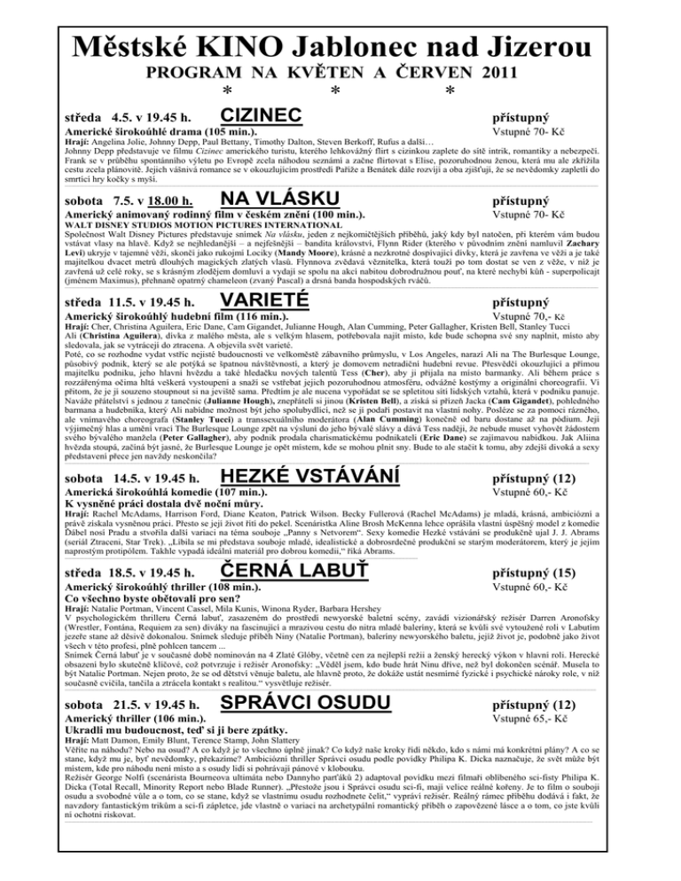 Městské KINO Jablonec nad Jizerou PROGRAM NA KVĚTEN A ČERVEN 2011 * středa 4.5. v 19.45 h. CIZINEC * Americké širokoúhlé drama (105 min.). * přístupný Vstupné 70- Kč Hrají: Angelina Jolie, Johnny Depp, Paul Bettany, Timothy Dalton, Steven Berkoff, Rufus a další… Johnny Depp představuje ve filmu Cizinec amerického turistu, kterého lehkovážný flirt s cizinkou zaplete do sítě intrik, romantiky a nebezpečí. Frank se v průběhu spontánního výletu po Evropě zcela náhodou seznámí a začne flirtovat s Elise, pozoruhodnou ženou, která mu ale zkřížila cestu zcela plánovitě. Jejich vášnivá romance se v okouzlujícím prostředí Paříže a Benátek dále rozvíjí a oba zjišťují, že se nevědomky zapletli do smrtící hry kočky s myší. ----------------------------------------------------------------------------------------------------------------------------------------------------------------------------------------------------------------------------------------------------------------------------------------------------------------------------------------------------------------------------------------------------------------------------------------------------------------------------------- sobota 7.5. v 18.00 h. NA VLÁSKU Americký animovaný rodinný film v českém znění (100 min.). přístupný Vstupné 70- Kč WALT DISNEY STUDIOS MOTION PICTURES INTERNATIONAL Společnost Walt Disney Pictures představuje snímek Na vlásku, jeden z nejkomičtějších příběhů, jaký kdy byl natočen, při kterém vám budou vstávat vlasy na hlavě. Když se nejhledanější – a nejfešnější – bandita království, Flynn Rider (kterého v původním znění namluvil Zachary Levi) ukryje v tajemné věži, skončí jako rukojmí Lociky (Mandy Moore), krásné a nezkrotné dospívající dívky, která je zavřena ve věži a je také majitelkou dvacet metrů dlouhých magických zlatých vlasů. Flynnova zvědavá věznitelka, která touží po tom dostat se ven z věže, v níž je zavřená už celé roky, se s krásným zlodějem domluví a vydají se spolu na akcí nabitou dobrodružnou pouť, na které nechybí kůň - superpolicajt (jménem Maximus), přehnaně opatrný chameleon (zvaný Pascal) a drsná banda hospodských rváčů. ----------------------------------------------------------------------------------------------------------------------------------------------------------------------------------------------------------------------------------------------------------------------------------------------------------------------------------------------------------------------------------------------------------------------------------------------------------------------------------- středa 11.5. v 19.45 h. VARIETÉ přístupný Americký širokoúhlý hudební film (116 min.). Vstupné 70,- Kč Hrají: Cher, Christina Aguilera, Eric Dane, Cam Gigandet, Julianne Hough, Alan Cumming, Peter Gallagher, Kristen Bell, Stanley Tucci Ali (Christina Aguilera), dívka z malého města, ale s velkým hlasem, potřebovala najít místo, kde bude schopna své sny naplnit, místo aby sledovala, jak se vytrácejí do ztracena. A objevila svět varieté. Poté, co se rozhodne vydat vstříc nejisté budoucnosti ve velkoměstě zábavního průmyslu, v Los Angeles, narazí Ali na The Burlesque Lounge, působivý podnik, který se ale potýká se špatnou návštěvností, a který je domovem netradiční hudební revue. Přesvědčí okouzlující a přímou majitelku podniku, jeho hlavní hvězdu a také hledačku nových talentů Tess (Cher), aby ji přijala na místo barmanky. Ali během práce s rozzářenýma očima hltá veškerá vystoupení a snaží se vstřebat jejich pozoruhodnou atmosféru, odvážné kostýmy a originální choreografii. Ví přitom, že je jí souzeno stoupnout si na jeviště sama. Předtím je ale nucena vypořádat se se spletitou sítí lidských vztahů, která v podniku panuje. Naváže přátelství s jednou z tanečnic (Julianne Hough), znepřátelí si jinou (Kristen Bell), a získá si přízeň Jacka (Cam Gigandet), pohledného barmana a hudebníka, který Ali nabídne možnost být jeho spolubydlící, než se jí podaří postavit na vlastní nohy. Posléze se za pomoci rázného, ale vnímavého choreografa (Stanley Tucci) a transsexuálního moderátora (Alan Cumming) konečně od baru dostane až na pódium. Její výjimečný hlas a umění vrací The Burlesque Lounge zpět na výsluní do jeho bývalé slávy a dává Tess naději, že nebude muset vyhovět žádostem svého bývalého manžela (Peter Gallagher), aby podnik prodala charismatickému podnikateli (Eric Dane) se zajímavou nabídkou. Jak Aliina hvězda stoupá, začíná být jasné, že Burlesque Lounge je opět místem, kde se mohou plnit sny. Bude to ale stačit k tomu, aby zdejší divoká a sexy představení přece jen navždy neskončila? --------------------------------------------------------------------------------------------------------------------------------------------------------------------------------------------------------------------------------------------------------------------------------------------------------------------------------------------------------------------------------------------------------------------------------------------------------------------------- sobota 14.5. v 19.45 h. HEZKÉ VSTÁVÁNÍ Americká širokoúhlá komedie (107 min.). K vysněné práci dostala dvě noční můry. přístupný (12) Vstupné 60,- Kč Hrají: Rachel McAdams, Harrison Ford, Diane Keaton, Patrick Wilson. Becky Fullerová (Rachel McAdams) je mladá, krásná, ambiciózní a právě získala vysněnou práci. Přesto se její život řítí do pekel. Scenáristka Aline Brosh McKenna lehce oprášila vlastní úspěšný model z komedie Ďábel nosí Pradu a stvořila další variaci na téma souboje „Pa