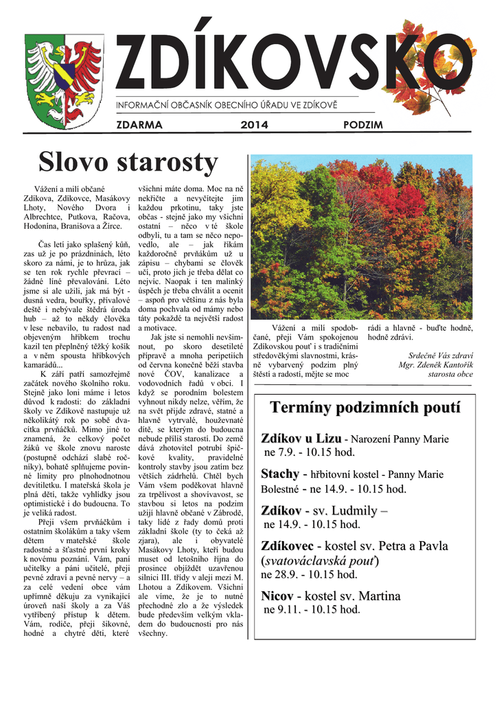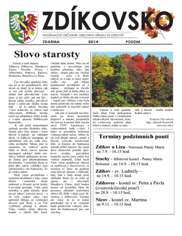 Vážení a milí občané Zdíkova, Zdíkovce, Masákovy Lhoty, Nového Dvora i Albrechtce, Putkova, Račova, Hodonína, Branišova a Žírce. Čas letí jako splašený kůň, zas už je po prázdninách, léto skoro za námi, je to hrůza, jak se ten rok rychle převrací – žádné líné převalování. Léto jsme si ale užili, jak má být dusná vedra, bouřky, přívalové deště i nebývale štědrá úroda hub – až to někdy člověka v lese nebavilo, tu radost nad objeveným hříbkem trochu kazil ten přeplněný těžký košík a v něm spousta hříbkových kamarádů... K září patří samozřejmě začátek nového školního roku. Stejně jako loni máme i letos důvod k radosti: do základní školy ve Zdíkově nastupuje už několikátý rok po sobě dvacítka prvňáčků. Mimo jiné to znamená, že celkový počet žáků ve škole znovu naroste (postupně odchází slabé ročníky), bohatě splňujeme povinné limity pro plnohodnotnou devítiletku. I mateřská škola je plná dětí, takže vyhlídky jsou optimistické i do budoucna. To je veliká radost. Přeji všem prvňáčkům i ostatním školákům a taky všem dětem v mateřské škole radostné a šťastné první kroky k novému poznání. Vám, paní učitelky a páni učitelé, přeji pevné zdraví a pevné nervy – a za celé vedení obce vám upřímně děkuju za vynikající úroveň naší školy a za Váš vytříbený přístup k dětem. Vám, rodiče, přeji šikovné, hodné a chytré děti, které všichni máte doma. Moc na ně nekřičte a nevyčítejte jim každou prkotinu, taky jste občas - stejně jako my všichni ostatní – něco v té škole odbyli, tu a tam se něco nepovedlo, ale – jak říkám každoročně prvňákům už u zápisu – chybami se člověk učí, proto jich je třeba dělat co nejvíc. Naopak i ten malinký úspěch je třeba chválit a ocenit – aspoň pro většinu z nás byla doma pochvala od mámy nebo táty pokaždé ta největší radost a motivace. Jak jste si nemohli nevšimnout, po skoro desetileté přípravě a mnoha peripetiích od června konečně běží stavba nové ČOV, kanalizace a vodovodních řadů v obci. I když se porodním bolestem vyhnout nikdy nelze, věřím, že na svět přijde zdravé, statné a hlavně vytrvalé, houževnaté dítě, se kterým do budoucna nebude příliš starostí. Do země dává zhotovitel potrubí špičkové kvality, pravidelné kontroly stavby jsou zatím bez větších zádrhelů. Chtěl bych Vám všem poděkovat hlavně za trpělivost a shovívavost, se stavbou si letos na podzim užijí hlavně občané v Zábrodě, taky lidé z řady domů proti základní škole (ty to čeká až zjara), ale i obyvatelé Masákovy Lhoty, kteří budou muset od letošního října do prosince objíždět uzavřenou silnici III. třídy v aleji mezi M. Lhotou a Zdíkovem. Všichni ale víme, že je to nutné přechodné zlo a že výsledek bude především velkým vkladem do budoucnosti pro nás všechny. Vážení a milí spodobčané, přeji Vám spokojenou Zdíkovskou pouť i s tradičními středověkými slavnostmi, krásně vybarvený podzim plný štěstí a radostí, mějte se moc rádi a hlavně - buďte hodně, hodně zdrávi. Srdečně Vás zdraví Mgr. Zdeněk Kantořík starosta obce Termíny podzimních poutí Zdíkov u Lizu - Narození Panny Marie ne 7.9. - 10.15 hod. Stachy - hřbitovní kostel - Panny Marie Bolestné - ne 14.9. - 10.15 hod. Zdíkov - sv. Ludmily – ne 14.9. - 10.15 hod. Zdíkovec - kostel sv. Petra a Pavla (svatováclavská pouť) ne 28.9. - 10.15 hod. Nicov - kostel sv. Martina ne 9.11. - 10.15 hod. Blahopřejeme k životním jubileím červenec - říjen 2014 Existuje recept na štěstí? Možná že ne, ale papež František zkusil shrnout desatero principů, které s jistotou mohou lidem pomoci k lepšímu životu. Zde je 10 bodů, které papež vyjmenoval ve svém prvním rozhovoru pro argentinský tisk. 1. Žij a nechej žít "V Římě je jedno přísloví a mohli bychom si je vzít jako řídící princip. Běž vpřed a ostatní nechej dělat to stejné". 2. Rozdávej se druhým "Lidé potřebují být otevření a velkorysí vůči jiným. Jak se totiž uzavřou do sebe, je tu nebezpečí, že se stanou egocentriky. A stojaté vody se rychle promění na hnijící". 3. Postupuj v životě pokojně Pro vysvětlení tohoto bodu papež používá obraz z argentinského románu Ricarda Guiraldese, ve kterém se hlavní postava Don Segundo ohlíží zpět a rekapituluje svůj život. "Říká, že v mládí byl potokem plným kamenů, který vše vláčel s sebou, jako dospělý byl prudkou řekou a v pokročilém věku plynul pomalu jako voda v jezírku." Papež řekl, že se mu tento poslední obraz klidné vodní plochy líbí, protože představuje "schopnost postupovat s přívětivostí a pokorou, životní pokoj. Staří lidí mají tuto moudrost, jsou pamětí lidu." 4. Zdravý smysl pro volný čas "Umění radosti z uměleckého díla, literatury anebo hry s dětmi se vytratilo. Konzumní způsob života nám přinesl neklid a stres, čímž lidé přišli o zdravou kulturu volného času," poznamenal František. Proto také vyzývá rodiče, aby si našli čas na svoje děti navzdory tvrdé práci, kterou musí dennodenně odvádět. Stejně tak by se měly rodiny naučit vypínat televizi, když spolu jedí. Ta nám totiž někdy zabraňuje ve vzájemné komunikaci. 5. Neděle má být vašimi prázdninami – svátkem Zaměstnanci by měli mít v neděli volno, protože "neděle je pro rodinu", vzkazuje papež. 6. Najdi novátorské způsoby na vytvoření důstojných pracovních míst pro mladé lidi "Jak nebudou mít dostatek příležitosti, skončí na drogách a budou tak náchylnější ke zločinu." "Nestačí dát jim jídlo. Je třeba nabídnout jednoroční kurzy na instalatéry, elektrikáře, krejčí. Důstojnost spočívá v tom, že 