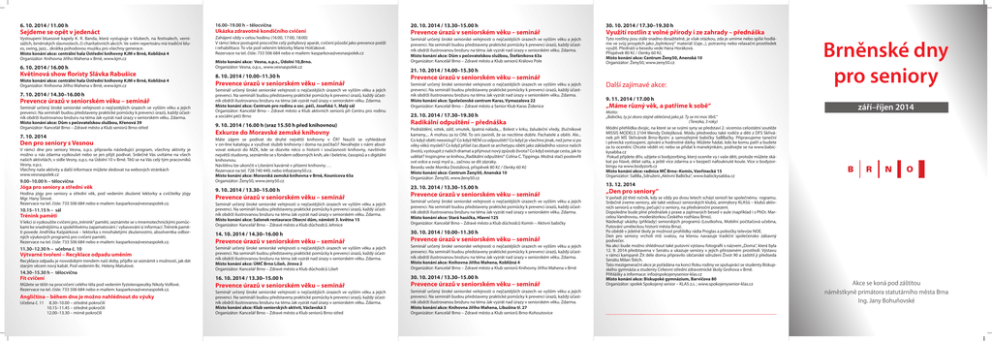 6. 10. 2014 / 11.00 h 16.00–19.00 h – tělocvična 20. 10. 2014 / 13.30–15.00 h 30. 10. 2014 / 17.30–19.30 h Vystoupení bluesové kapely K. R. Banda, která vystupuje v klubech, na festivalech, vernisážích, brněnských slavnostech, či charitativních akcích. Ve svém repertoáru má tradiční blues, swing, jazz... zkrátka pohodovou muziku pro všechny generace. Místo konání akce: centrální hala Ústřední knihovny KJM v Brně, Kobližná 4 Organizátor: Knihovna Jiřího Mahena v Brně, www.kjm.cz Zahájení vždy v celou hodinu (16:00, 17:00, 18:00) V rámci lekce postupně procvičíte celý pohybový aparát, cvičení působí jako prevence potíží i rehabilitace. To vše pod velením lektorky Marie Holčákové. Rezervace na tel. čísle: 733 506 684 nebo e-mailem: [email protected] Seminář určený široké seniorské veřejnosti o nejčastějších úrazech ve vyšším věku a jejich prevenci. Na semináři budou představeny praktické pomůcky k prevenci úrazů, každý účastník obdrží ilustrovanou brožuru na téma Jak vyzrát nad úrazy v seniorském věku. Zdarma. Místo konání akce: Dům s pečovatelskou službou, Štefánikova 63a Organizátor: Kancelář Brno – Zdravé město a Klub seniorů Královo Pole Tyto rostliny jsou stále snadno dosažitelné, je však otázkou, zda je umíme nebo spíše hodláme ve svůj prospěch jako „bylinkový“ materiál (čaje...), potraviny nebo relaxační prostředek využít. Přednáší a besedu vede Hana Horáková. Příspěvek 80 Kč / členky 60 Kč. Místo konání akce: Centrum Ženy50, Anenská 10 Organizátor: Ženy50, www.zeny50.cz Sejdeme se opět v jedenáct 6. 10. 2014 / 16.00 h Květinová show floristy Slávka Rabušice Místo konání akce: centrální hala Ústřední knihovny KJM v Brně, Kobližná 4 Organizátor: Knihovna Jiřího Mahena v Brně, www.kjm.cz 7. 10. 2014 / 14.30–16.00 h Prevence úrazů v seniorském věku – seminář Seminář určený široké seniorské veřejnosti o nejčastějších úrazech ve vyšším věku a jejich prevenci. Na semináři budou představeny praktické pomůcky k prevenci úrazů, každý účastník obdrží ilustrovanou brožuru na téma Jak vyzrát nad úrazy v seniorském věku. Zdarma. Místo konání akce: Dům s pečovatelskou službou, Křenová 39 Organizátor: Kancelář Brno – Zdravé město a Klub seniorů Brno-střed 7. 10. 2014 Den pro seniory s Vesnou V rámci dne pro seniory Vesna, o.p.s. připravila následující program, všechny aktivity je možno u nás zdarma vyzkoušet nebo se jen přijít podívat. Srdečně Vás uvítáme na všech našich aktivitách, v sídle Vesny, o.p.s. na Údolní 10 v Brně. Těší se na Vás celý tým pracovníků Vesny, o.p.s. Všechny naše aktivity a další informace můžete sledovat na webových stránkách www.vesnaspolek.cz 9.00–10.00 h – tělocvična Jóga pro seniory a střední věk Hodina jógy pro seniory a střední věk, pod vedením zkušené lektorky a cvičitelky jógy Mgr. Hany Šírové. Rezervace na tel. čísle: 733 506 684 nebo e-mailem: [email protected]. 10.15–11.15 h – sál Trénink paměti V lekci si vyzkoušíte cvičení pro „trénink“ paměti, seznámíte se s mnemotechnickými pomůckami ke snadnějšímu a spolehlivému zapamatování / vybavování si informací. Trénink paměti povede Jindřiška Kašpárková – lektorka s mnohaletými zkušenostmi, absolventka odborných výukových programů pro cvičení paměti. Rezervace na tel. čísle: 733 506 684 nebo e-mailem: [email protected]. 11.30–12.30 h – učebna č. 10 Výtvarné tvoření – Recyklace odpadu uměním Recyklace odpadu je novodobým trendem naší doby, přijďte se seznámit s možností, jak dát starým věcem nový kabát. Pod vedením Bc. Heleny Matulové. 14.30–15.30 h – tělocvična Fit cvičení Můžete se těšit na procvičení celého těla pod vedením fyzioterapeutky Nikoly Volfové. Rezervace na tel. čísle: 733 506 684 nebo e-mailem: [email protected]. Angličtina – během dne je možno nahlédnout do výuky Učebna č. 11 8.30–10.00 – středně pokročilí 10.15–11.45 – středně pokročilí 12.00–13.30 – mírně pokročilí Ukázka zdravotně kondičního cvičení Místo konání akce: Vesna, o.p.s., Údolní 10,Brno. Organizátor: Vesna, o.p.s., www.vesnaspolek.cz 8. 10. 2014 / 10.00–11.30 h Prevence úrazů v seniorském věku – seminář Seminář určený široké seniorské veřejnosti o nejčastějších úrazech ve vyšším věku a jejich prevenci. Na semináři budou představeny praktické pomůcky k prevenci úrazů, každý účastník obdrží ilustrovanou brožuru na téma Jak vyzrát nad úrazy v seniorském věku. Zdarma. Místo konání akce: Centrum pro rodinu a soc. péči, Josefská 1, Malý sál Organizátor: Kancelář Brno – Zdravé město a Klub aktivních seniorů při Centru pro rodinu a sociální péči Brno 9. 10. 2014 / 16.00 h (sraz 15.50 h před knihovnou) Exkurze do Moravské zemské knihovny Máte zájem se podívat do druhé největší knihovny v ČR? Naučit se vyhledávat v on-line katalogu a využívat služeb knihovny i doma na počítači? Neváhejte s námi absolvovat exkurzi do MZK, kde se dozvíte něco o historii i současnosti knihovny, navštívíte největší studovny, seznámíte se s fondem odborných knih, ale i beletrie, časopisů a s digitální knihovnou. Návštěvu lze ukončit v Literární kavárně v přízemí knihovny . . . Rezervace na tel. 728 740 449, nebo [email protected]. Místo konání akce: Moravská zemská knihovna v Brně, Kounicova 65a Organizátor: Ženy50, www.zeny50.cz 9. 10. 2014 / 13.30–15.00 h Prevence úrazů v seniorském věku – seminář Prevence úrazů v seniorském věku – seminář 21. 10. 2014 / 14.00–15.30 h Prevence úrazů v seniorském věku – seminář Seminář určený široké seniorské veřejnosti o nejčast