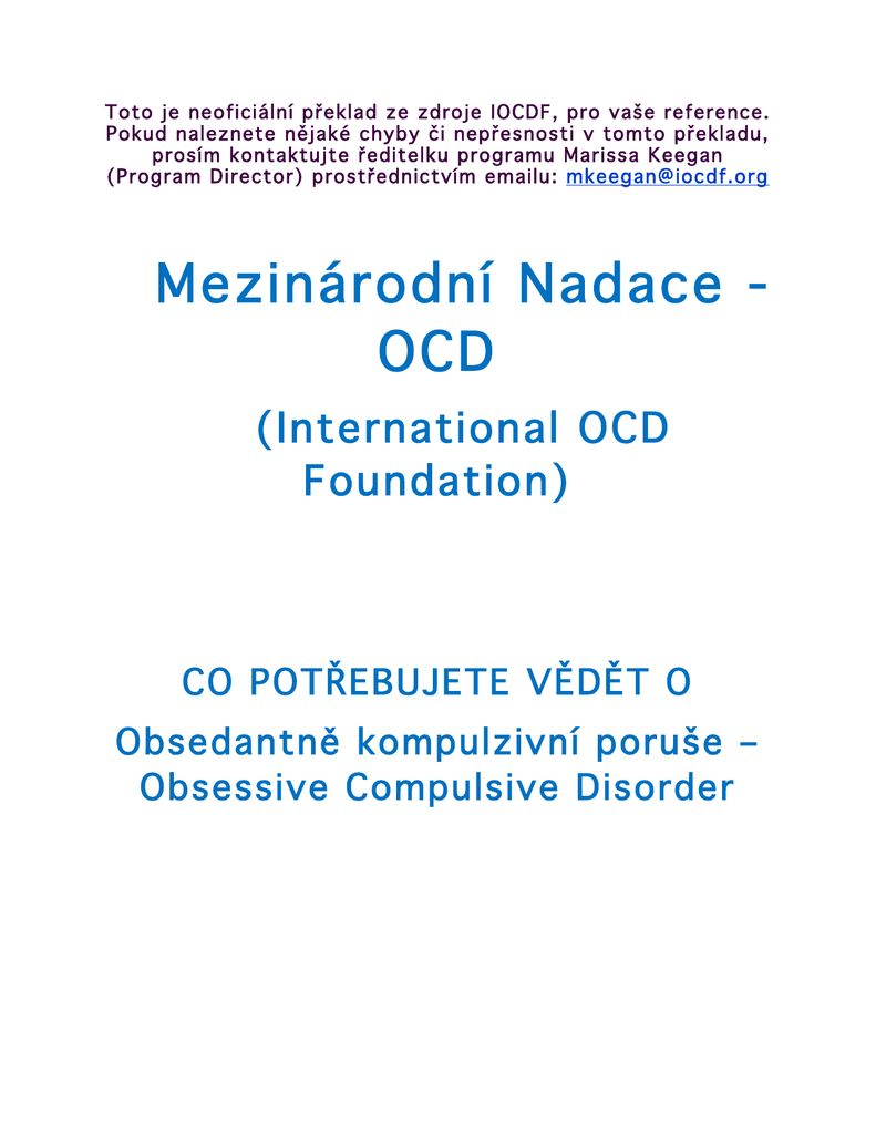 Toto je neoficiální překlad ze zdroje IOCDF, pro vaše reference. Pokud naleznete nějaké chyby či nepřesnosti v tomto překladu, prosím kontaktujte ředitelku programu Marissa Keegan (Program Director) prostřednictvím emailu: [email protected] Mezinárodní Nadace OCD (International OCD Foundation) CO POTŘEBUJETE VĚDĚT O Obsedantně kompulzivní poruše – Obsessive Compulsive Disorder Překlad z AJ: Lucie Gřešáková, Dominik Gřešák Co je Obsedantně kompulzivní porucha (OCD)? Představte si, že se vaše mysl zasekla na určité myšlence nebo představě či obraze či záblesku… Potom se tato myšlenka nebo obraz, záblesk atd. neustále přehrává ve vaší mysli znova a znova dokola bez ohledu na to, co děláte… Nechcete tyto myšlenky – je to jako když se na vás hrne lavina… Společně s těmito myšlenkami přijde prudká a intenzivní úzkost… Úzkost je varovný systém vašeho mozku. Když jste v úzkosti, je to jako, když byste byli v nebezpečí. Úzkost je emoce, která vás nabádá k reakci, k odpovědi, k tomu abyste se chránili, AŤ PROSTĚ NĚCO UDĚLÁTE… Na jedné straně, možná nějak poznáte, že ten strach je neopodstatněný, nedává smysl, přesto je ale velice silný, přijde vám skutečný a pravdivý. Proč by váš mozek lhal? Proč byste prožívali pocity, či něco, pokud by to vše nebylo pravdivé? Takové “pocity či prožitky“ nelžou… Bohužel, když máte OCD, tak tyto “pocity a prožitky“ lžou. Když máte OCD, ten varovný systém ve vašem mozku nefunguje správně. Mozek vám říká, že jste v nebezpečí, i když v nebezpečí nejste. Když vědci srovnali obrázky mozku skupiny lidi s OCD a skupiny bez OCD, bylo zřejmé, že některé části mozku jsou odlišné. Lidé mučeni touto poruchou se zoufale snaží utéct před tou ochromující, nekonečnou úzkostí Jak poznám, že mám OCD? Pouze kvalifikovaný odborník může správně stanovit diagnózu OCD. Zaměří se na 3 skutečnosti: • Přítomnost obsesí • Vykonávání kompulzí, kompulzivní jednání • Obsese a kompulze zabírají mnoho času a často až zabraňují ve výkonu různých aktivit či koníčků (práce, škola atd.) či ovlivňují každodenní život, pracovní a sociální aktivity Obsese: • Myšlenky, představy, nutkavé jevy, popudy k jednání, které jsou vtíravé, automatické, nekontrolovatelné a ovládají mysl pacienta. • Pacient se snaží na ně nemyslet, zbavit se jich či nějak vyřešit. • Pacient je shledává jako zneklidňující a nechtěné, může také sám cítit, že nějak nedávají smysl. • Tyto jevy přichází s nepříjemnými pocity jako je strach, odpor, ošklivost, nejistota, pochyby, nedůvěra nebo pocity, že např. každodenní běžné aktivity musí být udělány způsobem, který je „správný“. • Zabírají několik hodin denně a negativně ovlivňují každodenní život pacienta, jeho pracovní a sociální aktivity. Co nejsou obsese… Je běžné mít občasné myšlenky a strachy ohledně nemocí nebo bezpečnosti své, svých blízkých. Kompulze: • Je jednání či myšlení, které pacient obvykle opakovaně vykonává, aby se zbavil obsesí a úzkostí či je zneutralizoval, vyvrátil či vyřešil. Nutkavé jednání. • Pacienti si mohou uvědomovat, že toto je pouze krátkodobé řešení, ale bez jiného a lepšího řešení si s úzkostí a obsesemi poradit nedokáží, spoléhají na kompulze. • Kompulze může také znamenat vyhýbání se situacím, které vyvolávají či by mohly vyvolat obsese. • Jsou časově náročné a zaberou i několik hodin denně, negativně ovlivňují každodenní život pacienta (sociální aktivity, pracovní život, docházku do školy atd.) Co nejsou kompulze… • Ne všechno opakované jednaní či „rituály“ jsou kompulze. Večerní rutina, náboženské praktiky, učení se novým věcem, což většinou vyžaduje neustálé opakování atd., jsou běžné aktivity každodenního života. • Chování a jednání vyplývající ze souvislosti: neustálé upravování a organizování DVD 8 hodin denně není kompulze, pokud pracujete v DVD prodejně. Běžné OCD Obsese* Nakažení / kontaminace • Tělesné tekutiny (např. moč, výkaly) • Bakterie, viry / onemocnění a choroby (např. opary, HIV) • Znečištění životního prostředí (např. azbest, radiace) • Chemikálie v domácnosti (např. čističe, rozpouštědla) • Špína Poškození / ublížení • Strach a obavy, že způsobím a budu zodpovědný za něco velice špatného. Že se něco zlého stane a bude to má vina (např. požár, vykradení) • Strach, že nějak, např. svou neopatrností, ublížím ostatním (např. upustím něco na zem, někdo půjde, uklouzne a ublíží si) Ztráta kontroly • Strach a obavy, že ublížím sobě díky svému impulzivnímu (či zkratkovitému) jednání • Strach a obavy, že ublížím ostatním díky svému impulzivnímu (či zkratkovitému) jednání • Strach a obavy z násilných a hrůzných představ v mysli • Strach a obavy z nadávání, křiku, urážek, že něco špatného řeknu • Strach a obavy, že něco ukradnu Nechtěné sexuální myšlenky • Zakázané nebo perverzní myšlenky či představy • Zakázané či perverzní sexuální nutkavé myšlenky ohledně ostatních lidí • Obsese ohledně homosexuality • Sexuální obsese ohledně dětí či incestu • Obsese ohledně agresivního sexuálního chování vůči druhým Perfekcionismus • Starostlivost ohledně vyrovnanosti a přesnosti • Starostlivost či obavy ohledně potřeby vědět a pamatovat si • Strach ze ztráty něčeho nebo zapomenutí něčeho důležitého, např. při vyhození něčeho do odpadu • Neschopnost rozhodnutí zda něco vyhodit nebo si to ponechat • Strach ze ztráty věcí Náboženské obsese • Starostlivost a obavy ohledn