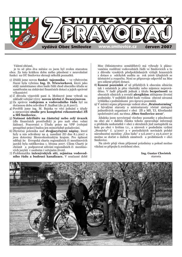 vydává Obec Smilovice Vážení obèané, je to už pøes dva mìsíce co jsem byl zvolen starostou obce. Za tuto krátkou dobu mého pùsobení v neuvolnìné funkci na OÚ Smilovice shrnuji nìkolik poznatkù. 1) Zøídili jsme novou funkci tajemníka – ve výbìrovém øízení byla vybrána Ing. D. Wiewiorková, která jako stálý zamìstnanec obce bude øídit chod obecního úøadu se zamìøením na získávání finanèních dotací a jejich správné výkaznictví 2) Z dùvodu výpovìdi paní A. Molinové jsme vybrali na základì veøejné výzvy novou úèetní J. Swaczynovou. 3) Za správce vodojemu a vodovodního øádu byl na doèasnou dobu schválen P. Szalbut (do 31.8.2007). 4) Povìøili jsme ing. M. Bujoka ve vìci jednání s úøady a zpracování studie pro kompletní rekonstrukci ZŠ a MŠ Smilovice. 5) Nutnost údržbáøe na èásteèný nebo celý úvazek (dle finanèních prostøedkù) je pro naši obec velmi žádoucí. Pracovníci s Úøadu práce na VPP (veøejnì prospìšné práce) budou jen mimoøádnì požadováni. 6) Zbyteèná polemika nad dvojjazyènými nápisy, které byly u nás schváleny na 4. zasedání ZO dne 8.1.2007 a jsou dotovány Moravskoslezským krajem. Pro úplnost sdìluji že: Evropská charta regionálních èi menšinových jazykù byla ratifikována 1. bøezna 2007. Cílem Charty je chránit a podporovat užívání regionálních èi menšinových jazykù v osobním i veøejném životì. 7) Problematika inženýrských sítí, zejména vodovodního øádu a budoucí kanalizace. V souèasné dobì www.smilovice.cz červen 2007 Mze (Ministerstvo zemìdìlství) má výhrady k plánovanému rozšíøení vodovodních øádù ve Smilovicích a to z dùvodu vysokých pøedpokládaných výdajù hrazených z dotace a odchylek auditu za rok 2006 týkajících se úèetnictví a rozpoètu. Nyní se pøipravuje odpovìï na Mze pro zdárné pøijetí dotace. 8) Kosení pozemkù a už pøilehlých k obecním silnicím tak i ostatních je pøes vlastníky nebo nájemce neprovádìno. V øadì pøípadù jednak z titulu bezpeènosti na obecních silnicích a rovnìž alergikùm ztìžujeme životní podmínky. V nejbližší dobì bude vydána obecnì závazná vyhláška s podmínkami pro úpravu pozemkù. 9) V mìsíci srpnu pøipravuje vedení obce „Brainstorming“ s bývalými starosty a místostarosty vèetnì zástupcù jednotlivých organizací v obci ZŠ a MŠ, TJ, Køesanské spoleèenství atd. na téma „Obec Smilovice 2010“. Zdaleka jsem nevyèerpal všechny poznatky z pùsobnosti na obci ale v dalším èlánku tohoto zpravodaje informuji o pøehledu nedostatkù v obci z okružních jízd zastupitelù na kole po obci v kvìtnu t.r., a zároveò v posledním vydání „Stonávky“ è. 3/2007 a v periodických novinách polské národnostní menšiny „Glos ludu“ z 9.6.2007 a 23.6.2007 je možno se doèíst o dalších zámìrech a problémech v obci Smilovice. Na závìr pøeji všem pøíjemné prázdniny a pokud možno všichni se pøipojte k zvelebení obce. Ing. Gustav Chwistek starosta 2 Zpravodaj obce SMILOVICE Každý z nás je nìèí soused Za sousedy jsou ve smyslu zákona považování nejen obèané mající spoleèný plot, ale jsou i jimi obyvatelé v širší okolí. V této souvislosti je tøeba pøipomenout èím vším by se sousedé zejména vzájemnì nemìli obtìžovat: hlukem, prachem, popílkem kouøe, plyny, parami, pachy, pevnými a tekutými odpady, svìtlem, stínìním, vibracemi a rovnìž nesmí nechat chovná zvíøata vnikat na sousedùv pozemek. Obecnì platí, že vlastník vìci se musí zdržet všeho, èím by nad míru pøimìøenou pomìrùm obtìžoval jiného. Vegetace Z právního hlediska stromy a vegetace jako taková náleží k pozemku, ze kterého vyrùstá a úroda náleží vlastníkovi vegetace. Na její sbìr musí soused sousedovi umožnit pøístup na svùj pozemek, ale vlastník má také zároveò povinnost odstranìní shnilého ovoce. Pøesahují-li vìtve stromù na sousedùv pozemek zpùsobem, že to vlastníkovi pozemku vadí, mùže je odstranit, ale musí tak uèinit v dobì vegetaèního klidu a zásahem nesmí dojít ke znièení samotné rostliny. Jestli-že vegetace zasahuje do døevìného plotu, následkem toho plot hnije, je zpùsobována škoda a pokud by soused na tuto situaci nereagoval, mohou se obèané obrátit na obec. Kdyby nepomohla domluva obce, pak na soud, který mùže naøídit preventivní opatøení, nápravu a úhradu vzniklé škody. Obtìžování hlukem Jiným problémem mùže být hlasitì hrající rádio, vrèení motorù sekaèek a køovinoøezù èi bouølivé veèírky. Každý z nás má jistì na pamìti dobu noèního klidu tj. od 22-6 hodin, ale samozøejmì ani pøes den nemùžeme pùsobit hluk nad míru pøimìøenou místním pomìrùm tj. v dobì kdy ostatní odpoèívají (sobotní odpoledne nebo nedìle). Normy o povolené úrovni hluku jsou souèástí správních pøedpisù a norem. Pachy a kouø Také pálení odpadu a spadané listí i vypalování trávy je èastým zdrojem problémù. Obèanský zákoník øíká, že sousedé nesmí být obtìžováni plyny, pachy a kouøem. U pálení trávy dochází rovnìž k porušování ekologických pøedpisù. Neudržované a zaplevelené pozemky Stav takovýchto pozemkù, kde není provádìna pravidelná údržba – kosení, je dalším dùvodem k obavám obèanù, protože neudržovaný zaplevelený pozemek je zdrojem alergenù, které negativnì pùsobí na zdravotní stav. Dle ust. § 3 odst. 1 písm. a) zák. è. 326/2004 Sb., o rostlinolékaøské péèi, v platném znìní, vlastník pozemku nebo objektu nebo osoba, která je užívá z jiného právního dùvodu, je povinen zajišovat a omezovat výskyt a šíøení škodlivých organismù vèetnì plevelù tak, aby nevznikla škoda jiným osobám nebo nedošlo k poškození životního prostøed
