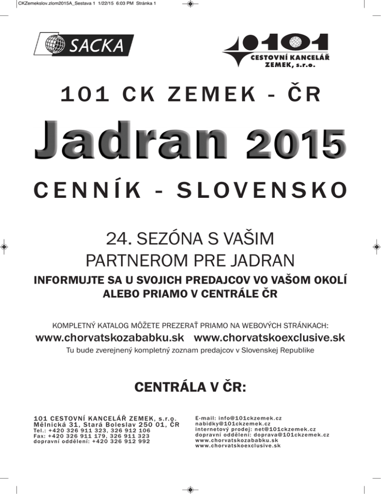 CKZemekslov.zlom2015A_Sestava 1 1/22/15 6:03 PM Stránka 1 101 CK ZEMEK - ČR CENNÍK - SLOVENSKO 24. SEZÓNA S VAŠIM PARTNEROM PRE JADRAN INFORMUJTE SA U SVOJICH PREDAJCOV VO VAŠOM OKOLÍ ALEBO PRIAMO V CENTRÁLE ČR KOMPLETNÝ KATALOG MÔŽETE PREZERAŤ PRIAMO NA WEBOVÝCH STRÁNKACH: www.chorvatskozababku.sk www.chorvatskoexclusive.sk Tu bude zverejnený kompletný zoznam predajcov v Slovenskej Republike CENTRÁLA V ČR: 101 CES TOVNÍ KANCE LÁŘ ZE ME K, s.r.o . Mě ln ic ká 31 , St ará Boleslav 250 01 , ČR Tel.: +420 326 911 323, 326 91 2 10 6 Fax : +420 326 911 179, 326 911 3 23 dopr avn í oddělení: +420 326 91 2 992 E-mail: info@101c kze mek .cz nabidky@101c kzemek .cz internetový prode j: net@101c kzemek .cz dopr avní odděle ní: dopr ava@101c kzeme k .cz www.c hor vatskozababku .sk www.c hor vatskoexclu sive .sk CKZemekslov.zlom2015A_Sestava 1 1/22/15 6:03 PM Stránka 2 ZĽAVY ZA SKORÝ NÁKUP - AŽ 35%!!! Zľava platí pri zakúpení zájazdu k uvedenému dátumu Pre zákazníkov, ktorí nečakajú s rezerváciou svojho zájazdu na poslednú chvíľu, sme pripravili odmenu v podobe mimoriadne výhodného nákupu z tohto katalógu s výraznou zľavou. Preto neváhajte a rezervujte včas vybrané hotely a apartmány so zľavou. Uvedené zľavy môžete uplatniť u všetkých našich predajcov. Nárok na zľavu vzniká už pri zaplatení zálohy vo výške 50% z celkovej ceny zájazdu, okrem výnimiek. TIETO ZĽAVY NEPLATÍ PRE SKUPINY (majú individuálne ceny). POZOR !! V termínoch, kde je v cenníkovej tabuľke zvýraznená zľavová akcia (napr. 7=5, 7=6, zľava 5%, zľava 10%) nie je možné použiť zľavu za skorý nákup (až na výnimky uvedené v katalógu). POBYTOVÁ TAXA U niektorých kapacít sa jedná o povinný príplatok k zakúpenému pobytovému zájazdu do Chorvátska. Pri zakúpení zájazdu Vám predajca k cene pripočíta "pobytovú taxu" v nasledujúcej výške: - dieťa do 12 rokov - bez poplatku, dieťa od 12 do 18 rokov - 5 EUR / týždeň (7 nocí), osoby nad 18 rokov 9 EUR / týždeň (7 nocí). Tieto poplatky sú vzhľadom k novému daňovému systému platnému v Chorvátsku od 1.7.2013 v rade miest už započítané v cene. Je potrebné starostlivo preštudovať text pod cenníkom, čo je v cene skutočne zahrnuté. POISTENIE 101 CK Zemek má uzavreté kompletné poistenie záruky v dôsledku úpadku cestovnej kancelárie podľa zákona č. 159/1999 Zb. a jeho dodatkov. Toto poistenie je uzavreté od 1.1.2014 s Union poisťovňou a.s. pod č. zmluvy 1162660. Ďalej zabezpečujeme kompletné cestovné poistenie po dohode so zákazníkom. DOPRAVA AUTOBUSOM ISTRIA - Umag, Novigrad, Lanterna, Poreč, Funtana, Vrsar, Rovinj ,Pula, Medulin Nástupné miesta : Nitra, Trnava = 93 EUR, nástupné miesto Bratislava = 88 EUR Dopravné oddelenie 101 CK Zemek: tel./fax: +420 326 912 992, e-mail: [email protected], dispečink: +420 774 000 424 Certifikovaní predajcovia v SR: 2 BRATISLAVA EDEN TRAVEL, s.r.o., Vazavova 1 e-mail: [email protected], www.eden-travel.sk tel.: 0903 590 576 KOŠICE SUNNY TOUR, Hlavná 21 [email protected], www.sunnytour.sk tel.: 05 5623 0772 BRATISLAVA S.V.S.PARTNERS,s.r.o.-CK AUTOTOUR, Obchodná 37 e-mail: [email protected], www.autotour.sk tel.: 02 5292 7151 SENICA CA HELLAS TRAVEL, s.r.o., J. Krá'la 739 e-mail: [email protected], www.dovolenky.net tel.: 03 4654 6454 KROMPACHY PLEJSY TOUR C.A. , Slovenského národného povstania e-mail: [email protected], www.plejsy-tour.sk tel.: 0915 946 381 DUBNICA NAD VÁHOM INVIA - SICA agentúra, Námestie Matice slovenskej 1298 tel.: 04 2442 0979, e-mail: [email protected] CKZemekslov.zlom2015A_Sestava 1 1/22/15 6:03 PM Stránka 3 ZMLUVNÉ VZŤAHY 101 CK ZEMEK s.r.o. I. VZNIK ZMLUVNÉHO VZŤAHU 1) Účastníkmi zmluvného vzťahu sú: a) Cestovná kancelária 101 CK ZEMEK so sídlom Mělnická 31, ČR, ktorá do zmluvného vzťahu vstupuje prostredníctvom externých autorizovaných predajcov (ďalej iba CK) b) objednávateľ (zákazník), ktorým môže byť fyzická alebo právnická osoba spôsobilá k právnym úkonom a/alebo osoba, v prospech ktorej sa zmluva uzatvorila, resp. na ktorú sa zájazd previedol . 2) Zmluvný vzťah medzi CK a objednávateľom sa riadi ustanoveniami zák. č. 281/2001 Z.z. v znení zákona č. 186/2006 Z.z. a Občianskeho zákonníka č. 40/1964 Zb. v znení neskorších predpisov. Vzniká uzatvorením zmluvy o obstaraní zájazdu (ďalej len Zmluva), čim objednávateľ vyslovuje súhlas s uzatvorením Zmluvy a so zmluvnými vzťahmi. Za plnenie zmluvných záväzkov osôb uvedených v Zmluve ručí objednávateľ ako za plnenie svojich vlastných záväzkov. 3) Obsah Zmluvy vyplýva z ponuky tohto katalógu, dodatočnej ponuky CK (napr. akcie, dotlač), zákazníkom potvrdených objednávok (napr. forfaitové zájazdy) a je v súlade s týmito Zmluvnými vzťahmi. 4) Zmluvou sa CK objednávateľovi zaväzuje, že objednávateľovi obstará zájazd a objednávateľ sa zaväzuje, že zaplatí dohodnutú cenu. 5) Objednávateľ podpísaním Zmluvy súhlasí, aby CK vo svojich informačných systémoch spracovávala jeho osobné údaje v súlade s platnou legislatívou (zák. č. 428/2002 Z.z. o ochrane osobných údajov v znení zákona č. 363/2005 Z.z.) a to na dobu potrebnú na zabezpečenie práv a povinností vyplývajúcich zo zmluvných vzťahov medzi objednávateľom a CK. Tento súhlas udeľuje až do doby jeho písomného odvolania, ktoré je možné po predchádzajúcom dohovore s CK. Poskytnuté údaje môžu byť sprístupnené len zamestnancom CK a osobám, ktoré sú oprávnené ponúkať a poskytovať služby CK, ako aj osobám, ktoré dodávajú služby pre CK (vrátane cezhraničného toku), a to za účelom ponuky alebo poskytovania služieb pre CK. Tento súhlas so spracovaním údajov sa tiež vzťahuje na všetkých spracovateľov týchto údajov. Súhlas objednávateľ udeľuje aj v mene ostatných účastníkov zájazdu a to 