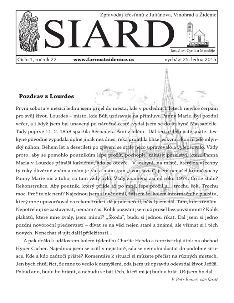 SIARD Zpravodaj křesťanů z Juliánova, Vinohrad a Židenic kostel sv. Cyrila a Metoděje Číslo 1, ročník 22 www.farnostzidenice.cz vychází 25. ledna 2015 Pozdrav z Lourdes První sobotu v měsíci lednu jsem přijel do města, kde v posledních letech nejvíce čerpám pro svůj život. Lourdes – místo, kde Bůh uzdravuje na přímluvu Panny Marie. Byl pozdní večer, a i když jsem byl unavený po náročné cestě, vydal jsem se do jeskyně Massabielle. Tady poprvé 11. 2. 1858 spatřila Bernadeta Paní v bílém. Dál ten příběh jistě znáte. Jeskyně původně vypadala úplně jinak než dnes, řeka proudila blíže jeskyni a končil zde mlýnský náhon. Během let a desetiletí po zjevení se stále něco upravovalo a vylepšovalo. Vždy proto, aby se pomohlo poutníkům lépe prožít, pochopit, zakusit poselství, které Panna Maria v Lourdes přináší každému, kdo se otevře. V jeskyni, na místě, které za všechny ty roky důvěrně znám a mám je rád a mám tam „svou lavici“, jsem nenašel kromě sochy Panny Marie nic z toho, co tam vždy bylo. Vždy znamená asi od roku 1974. Co se stalo? Rekonstrukce. Aby poutník, který přijde až po mně, lépe prožil a… trochu šok. Trochu moc. Proč tu nic není? Najednou jsem si uvědomil, že jsem šel kolem informačního plakátu, který mne upozorňoval na rekonstrukci. Já jej ale nečetl, běžel jsem dál. Tam, kde to znám. Nepotřebuji se zastavovat, nemám čas. Kolik pozvání jsem už prošel bez povšimnutí? Kolik plakátů, které mne zvaly, jsem minul? „Škoda“, budu si jednou říkat. Dal jsem si jedno pozdní novoroční předsevzetí – dívat se na věci nejen staré a známé, ale všímat si i těch nových. Nenechat si ujít další příležitosti… A pak došlo k událostem kolem týdeníku Charlie Hebdo a teroristický útok na obchod Hyper Cacher. Najednou jsem se ocitl v nejistotě, zda se nemohu dostat do podobné situace. Kde a kdo zaútočí příště? Komentáře k situaci si můžete přečíst na různých místech. Jen bych chtěl říct, že mne to vedlo k zamyšlení, zda jsem už opravdu odevzdal život Ježíši. Pokud ano, budu ho bránit, a nebudu se bát těch, kteří mi jej budou brát. Už jsem ho dal. P. Petr Beneš, váš farář • Pá 26. 6.–Ne 28. 6. 2015 – Dolní Kou- Přehled významných akcí v roce 2015 v brněnské diecézi • So 31. 1. 2015 – Brněnský dóm – od 09.30 oslava Dne zasvěceného života • Ne 22. 2. 2015 – Brněnský dóm – nice – festival Kéfasfest 2015 • So 27. 6. 2015 – Brněnský dóm – od 09.00 kněžské svěcení • Ne 5. 7. 2015 – Mikulčice – od 16.30 pouť ke sv. Cyrilu a Metoději • St 8. 7.–Ne 12. 7. 2015 2015 Brno – od 10.30 obřad zařazení katechumenů XXVI. konference Charismatické mezi čekatele křtu duchovní obnovy • So 28. 3. 2015 – Brněnský dóm – diecézní slavení Světového dne mládeže s otcem biskupem • Ne 12. 4. 2015 – Vranov u Brna – rodinná pouť (brněnské církevní školy) • Po 27. 4. 2015 – Brno, Petrov – přijímací pohovory do kněžského semináře • Pá 8. 4.–Ne 10. 5. 2015 – Brno – Tři dny křesťanské spirituality • So 23. 5. 2015 – Vranov u Brna – diecézní pouť ministrantů • So 15. 8.–Ne 16. 8. 2015 Brno – Den Brna • So 29. 8. 2015 Žďár nad Sázavou-II – XII. diecézní pouť rodin • Čt 15. 10.–So 17. 10. 2015 Brno – Národní eucharistický kongres (NEK2015) • Čt 15. 10.–Pá 16. 10. 2015 Brno, Biskupské gymnázium – Konference o eucharistii v rámci NEK2015 • So 17. 10. 2015 Brno – Národní pouť v rámci NEK2015 • Pá 29. 5. 2015 – Noc kostelů • So 6. 6. 2015 – Slavonice – od 10.30 diecézní pouť v rámci Národního eucharistického kongresu • So 13. 6. 2015 – Vranov nad Dyjí – Zprávy převzaté z biskupství Výročí Dne 16. 1. 2015 Sté výročí narození paní 13. celostátní misijní pouť a 10. misijní Cyrilly Svobodové, kdysi katechetky a učitelky den dětí na různých školách v Židenicích, dlouholeté • So 20. 6. 2015 – Brněnský dóm – od 10.30 jáhenské svěcení členky našeho farního společenství. Její manžel, vystudovaný právník, býval kostelním SIARD – Zpravodaj křesťanů z Juliánova, Vinohrad a Židenic Vydává Římskokatolická farnost u chrámu sv. Cyrila a Metoděje, Nopova 84, 615 00, Brno 15, tel. 548 530 034. Připravuje redakční rada, za obsah článku odpovídá autor. ZPRAVODAJ JE NEPRODEJNÝ. URČENO PRO VNITŘNÍ POTŘEBU. Finanční příspěvky pro farnost můžete zasílat na účet č. 42 00 14 30 12/6800 nebo na účet určený na opravy kostela – účet č. 22 00 03 27 19/6800 Variabilní symbol: Vaše IČO nebo rodné číslo, konstantní symbol: 558 2 hospodářem a patřil k zakládajícím židenic- nezorganizovala nějaká výprava mladých kým lektorům. V sedmdesátých letech vedl z naší farnosti. I když jsem dlouho váhal, náboženství pro mládež. Oba byli pro svůj jestli jet nebo ne, nakonec jsem 29. 12. ještě pevný postoj k víře pronásledováni, nemohli se 3 kamarády do Prahy vyrazil. pracovat ve své původní profesi a dlouhou Byli jsme plni očekávání, úplně jsme nevě- dobu se živili těžkou dělnickou prací. R.I.P. ! děli, do čeho se to pouštíme. Ale hned od redakce začátku nás toto setkání mile překvapilo. Po organizační stránce to nemělo chybu. Setkání Taizé v Praze – Pouť důvěry na zemi A to není žádná legrace sehnat jídlo a ubytování pro tolik lidí. Poté co jsme se zaregistrovali, dostali jsme průvodce setkáním, Zprvu jsem úplně nevěděl, o co přesně jde. mapu, abychom se neztratili, a také speci- Komunitu Taizé jsem neznal, maximálně ální kartičku, díky níž jsme mohli jezdit po jsem se párkrát zaposlouchal do zpěvů celou dobu setkání zadarmo metrem. Naše Taizé, které se jedno