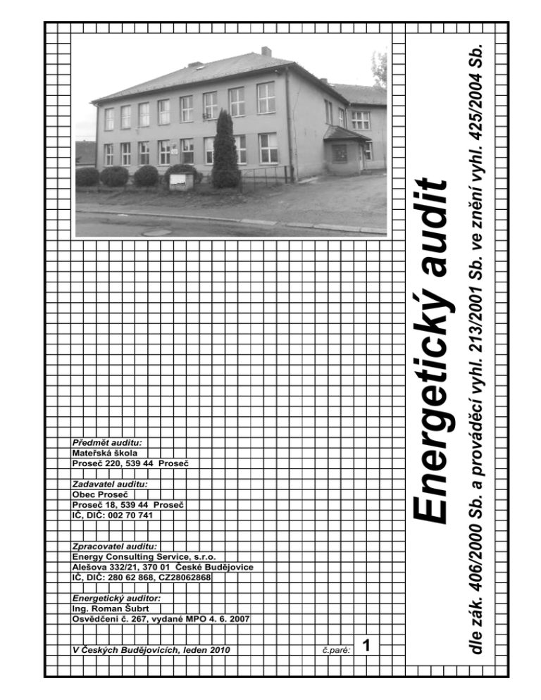 Zadavatel auditu: Obec Proseč Proseč 18, 539 44 Proseč IČ, DIČ: 002 70 741 Zpracovatel auditu: Energy Consulting Service, s.r.o. Alešova 332/21, 370 01 České Budějovice IČ, DIČ: 280 62 868, CZ28062868 Energetický auditor: Ing. Roman Šubrt Osvědčení č. 267, vydané MPO 4. 6. 2007 V Českých Budějovicích, leden 2010 č.paré: 1 dle zák. 406/2000 Sb. a prováděcí vyhl. 213/2001 Sb. ve znění vyhl. 425/2004 Sb. Energetický audit Předmět auditu: Mateřská škola Proseč 220, 539 44 Proseč Energetický audit Proseč – Proseč 220 OBSAH 1 ÚVOD ............................................................................................................................... 3 2 SOUČASNÝ STAV ENERGETICKÉHO HOSPODÁŘSTVÍ OBJEKTU ......................... 4 2.1 IDENTIFIKAČNÍ ÚDAJE..................................................................................................................... 4 2.1.1 Identifikace zadavatele auditu................................................................................................................ 4 2.1.2 Identifikace zpracovatele energetického auditu ...................................................................................... 4 2.1.3 Identifikace objektu ............................................................................................................................... 5 2.2 PODKLADY PRO ZPRACOVÁNÍ ENERGETICKÉHO AUDITU........................................................ 5 2.2.1 Podklady k řešenému objektu................................................................................................................. 5 2.2.2 Literatura............................................................................................................................................... 5 2.2.3 Vyhlášky, předpisy, normy..................................................................................................................... 5 2.3 VÝCHOZÍ STAV OBJEKTU ................................................................................................................ 6 2.3.1 2.3.2 2.3.3 2.3.4 2.3.5 Základní popis předmětu energetického auditu ...................................................................................... 6 Prostorové řešení objektu ....................................................................................................................... 6 Stavebně konstrukční řešení................................................................................................................... 8 Technická zařízení budovy .................................................................................................................... 8 Skutečná spotřeba energie objektu.......................................................................................................... 8 2.4 ZHODNOCENÍ VÝCHOZÍHO STAVU ...............................................................................................11 2.4.1 Energetická bilance ..............................................................................................................................11 2.4.2 Legislativní požadavky a skutečnost......................................................................................................13 2.4.3 Hodnocení spotřeby energie ..................................................................................................................14 3 ZPŮSOB NÁVRHU A POSOUZENÍ ÚSPORNÝCH OPATŘENÍ.................................. 15 3.1 POTENCIÁL ÚSPOR ENERGIE .........................................................................................................15 3.2 NÁVRH A POSOUZENÍ ÚSPORNÝCH OPATŘENÍ...........................................................................15 3.3 ENERGETICKÉ POSOUZENÍ.............................................................................................................16 3.3.1 Potřeba tepla na vytápění objektu..........................................................................................................16 3.3.2 Potřeba tepla na přípravu TV................................................................................................................18 3.3.3 Potřeba elektrické energie .....................................................................................................................18 3.4 EKONOMICKÉ POSOUZENÍ .............................................................................................................18 3.5 PŘÍNOS PRO ŽIVOTNÍ PROSTŘEDÍ .................................................................................................20 4 NÁVRH ENERGETICKY ÚSPORNÝCH OPATŘENÍ .................................................. 21 4.1 STAVEBNÍ ČÁST ...............................................................................................................................21 4.2 OBVODOVÉ STĚNY ..........................................................................................................................21 4.2.1 Technologie zateplení obvodových stěn.................................................................................................21 4.2.2 Hodnocení zateplení obvodových stěn ...................................................................................................22 4.3 STŘECHA............................................................................................................................................22 4.3.1 Technologie zateplení střechy...............................................................................................................22 4.4 VÝPLNĚ OTVORŮ .............................................................................................................................23 4.4.1 Úpravy výplní otvorů ............................................................................................................................23 4.4.2 H