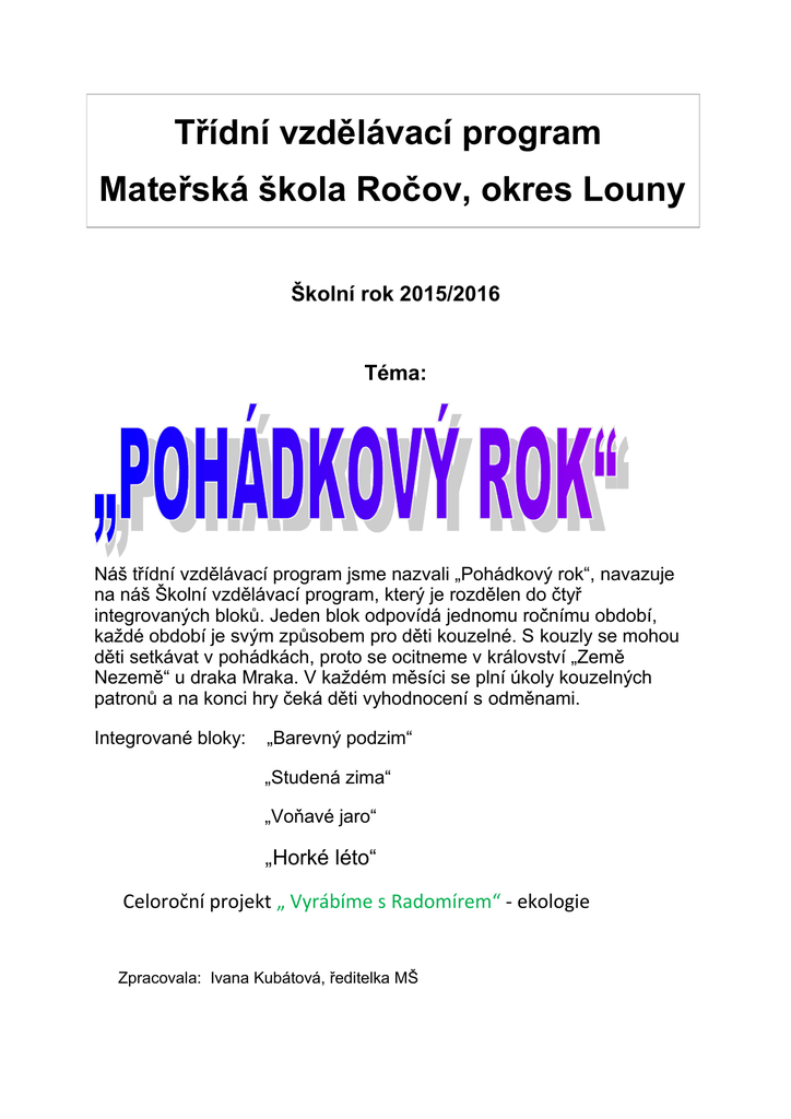 Třídní vzdělávací program Mateřská škola Ročov, okres Louny Školní rok 2015/2016 Téma: Náš třídní vzdělávací program jsme nazvali „Pohádkový rok“, navazuje na náš Školní vzdělávací program, který je rozdělen do čtyř integrovaných bloků. Jeden blok odpovídá jednomu ročnímu období, každé období je svým způsobem pro děti kouzelné. S kouzly se mohou děti setkávat v pohádkách, proto se ocitneme v království „Země Nezemě“ u draka Mraka. V každém měsíci se plní úkoly kouzelných patronů a na konci hry čeká děti vyhodnocení s odměnami. Integrované bloky: „Barevný podzim“ „Studená zima“ „Voňavé jaro“ „Horké léto“ Celoroční projekt „ Vyrábíme s Radomírem“ - ekologie Zpracovala: Ivana Kubátová, ředitelka MŠ „Barevný podzim“ Září – patron Myšák Modrovous · Naše mateřská škola – „Mámo, táto, pojď si hrát“ · Moji noví kamarádi · Kam se schovala zvířátka? · Život na vesnici a ve městě Říjen - patron Princ Adalbert III. · S radostí jde všechno lépe · Šel zahradník do zahrady · Měla babka · Vlaštovičko, leť Listopad - patron Bubák Strašidelný, Bambulák Ušatý · Malíř podzim · Co je to doma? · Jak rostu? · Co už umím? ZÁŘÍ I. blok: Naše mateřská škola seznámení s prostředím mateřské školy, názvy jednotlivých místností, správná orientace v budově školy i v jednotlivých místnostech, procvičování předložek – na, pod, před, za, mezi, vedle…, rozvoj slovní zásoby formou popisu viděného seznámení s prostorem školní zahrady, prostředím a okolím MŠ, dodržování bezpečnosti během her, předcházení úrazům, stavění prostorových staveb z písku kresba na téma „Naše školka“ (stříhání, skládání, pastelky…), vytvoření výstavky a zhodnocení dětských výtvorů praktické nacvičování úklidu hraček i dalších pomůcek, hry typu „Vezmi autíčko a polož ho … (patro Myšák Modrovous) II. blok: Moji noví kamarádi vstřícná a citlivá komunikace, hra „Na jména“, zapamatování si svojí značky; znát jména jednotlivých zaměstnanců začlenit se do třídy, navazování kontaktů s dospělým – pohybové hry „ Na zajíčka“, „ Na zahradníka“ nácvik a procvičování oblékání a svlékání (starší děti samy, mladší s pomocí učitelky i starších dětí); procvičování chůze ve dvojicích ve třídě i během vycházky zavedení ranního cvičení – nástup, pozdrav, chůze, pochod, běh v zástupu; učit se okamžitě reagovat na pokyn učitelky – napodobování zvířátek (písně, říkanky) naučit se nazpaměť krátké texty, cvičení paměti - umět pojmenovat části těla – „Můj kamarád“ – sestavování částí těla, kresba voskovým pastelem, odhalovat podstatné znaky, hra “Na tělo“ III.blok: Kam se schovala zvířátka? zvládnout dějovou posloupnost, vyprávění pohádky „ Boudo, budko“, popsat situaci, slovní projev, dramatizace pohádky zvládnout prostorovou orientaci, zvládat překážky – „Opičí dráha“, jednoduché úkoly s náčiním a nářadím hledat obrázky, které k sobě patří – názvy zvířat, třídění – domácí, lesní, v ZOO rozvoj sluchového vnímání – sluchová hra „Ptáčku, jak zpíváš?“, nácvik písní se zvířecí tématikou ( Starý medvěd vzdychá,..) procvičování jemné motoriky – práce s modelovací hmotou – „Moje zvířátko“ – představivost, koordinace pohybů, čistota při práci IV. blok: Život na vesnici a ve městě popis obrázku – rozdíly vesnice, město, hledat předměty, které k sobě patří, chápat prostorové pojmy ( nahoře, dole, vedle, uprostřed) procvičování základních i vedlejších barev – dida hra „Barvy kolem nás“, omalovánky,vyhledávání barev podle pokynů učitelky a následné vybarvování nácvik jednoduchého tanečku – „ Mazurka“( vlevo, vpravo), rytmizace, nácvik zapamatování textu zdolávání překážek v přírodě – chůze, běh, lezení, orientace v okolí, prožít radost ze zvládnutého úkolu, pohyb. hra „ Na schovávanou“ experimentování s materiály – využití tříděného odpadu – výroba projekt „Uspávání berušek a broučků“ – loučení s létem, akce pro děti a rodiče ŘÍJEN I. blok: S radostí jde všechno lépe kooperativní činnosti ve skupinách – cvičení družstev, tolerance při hrách, fair play– cvičení na žebřinách, trampolíně, švédské lavičce, umět správně napodobit cvik i krátkou sestavu, dodržovat bezpečné chování při cvičení, okamžitě reagovat na pokyny učitelky, umět vyčkat, až kamarád docvičí sestavování obrázků, drobná motorika – puzzle, prožít radost z dovednosti, soustředit se na činnost, vzájemná pomoc dětí rozvoj hudebního sluchu – rozlišovat pomocí smyslů zvuky a tóny - nácvik nové písně „ muzikant“; hra na jednoduché hudební nástroje, opakování známých hudebně pohybových her grafické napodobování symbolů – geometrické tvary – sestavování panáčka, panenky – podnítit představivost a paměť práce s barvou, experimentování – tisk barvy a následné hledání „Co vidím?“, zapojení všech dětí do hádání představ, rozvíjení fantazie Projektový den – „Nechci kazy“ – preventivní program II. blok: Šel zahradník do zahrady dopravní výchova – pojmy dopravní prostředek, křižovatka, semafor, přechod, dopravní značky; námětová hra Na dopravu, omalovánky s dopravní tématikou výtvarné ztvárnění duhy na obloze – práce s temperovými barvami tématická vycházka – postupovat a učit se podle instrukcí – chůze ve dvojici, ve skupině, přecházení, běh na určitou vzdálenost a k danému cíli soustředěný poslech příběhu s lesní tématikou, v