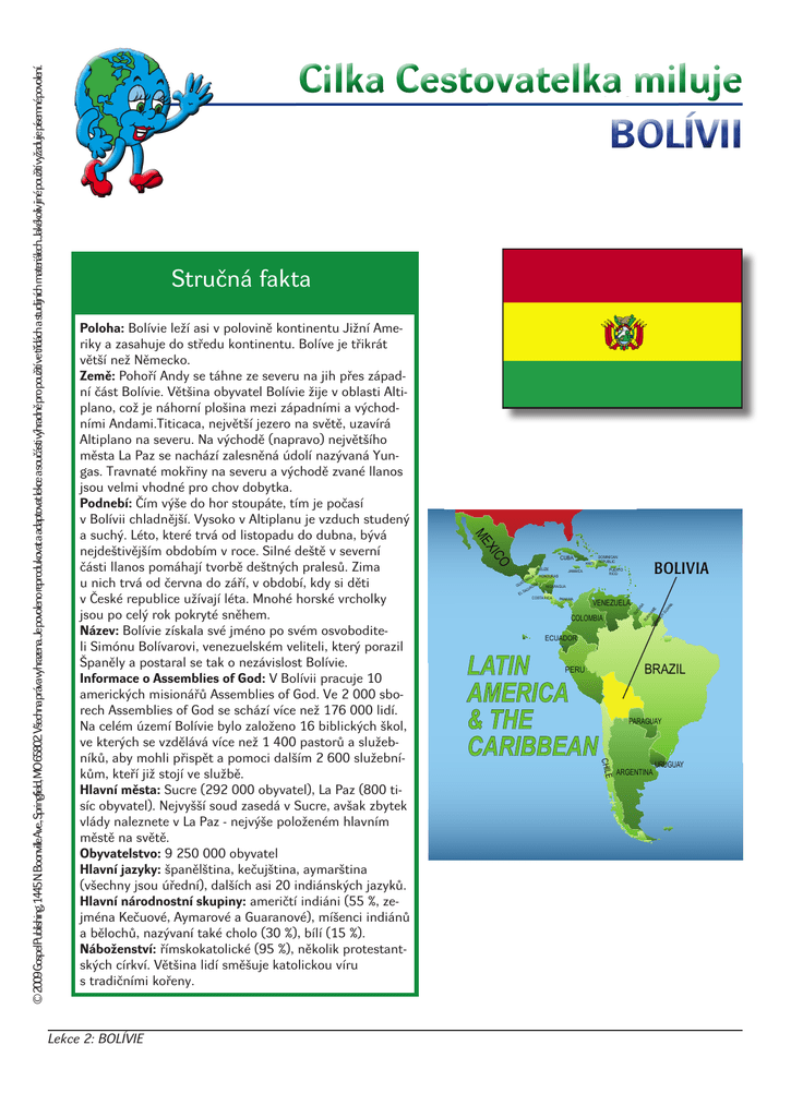 Bolivia Stručná fakta Bolivia CUBA HAITI O BELIZE MA E AT GU DOMINICAN REPUBLIC R O AD ALV BOLIVIA PUERTO RICO JAMAICA HONDURAS LA NICARAGUA IA A E YA N CH GU AM EN FR VENEZUELA COLOMBIA GU PANAMA RIN COSTA RICA SU E NA LS ECUADOR LATIN AMERICA & THE CARIBBEAN BRAZIL PERU PARAGUAY CHILE Lekce 2: BOLÍVIE © 2009 by Gospel Publishing House, 1445 N. Boonville Ave., Springfield, Missouri 65802. All rights reserved. Permission to replicate for church use only. XIC Poloha: Bolívie leží asi v polovině kontinentu Jižní Ameriky a zasahuje do středu kontinentu. Bolíve je třikrát větší než Německo. Země: Pohoří Andy se táhne ze severu na jih přes západní část Bolívie. Většina obyvatel Bolívie žije v oblasti Altiplano, což je náhorní plošina mezi západními a východními Andami.Titicaca, největší jezero na světě, uzavírá Altiplano na severu. Na východě (napravo) největšího města La Paz se nachází zalesněná údolí nazývaná Yungas. Travnaté mokřiny na severu a východě zvané llanos jsou velmi vhodné pro chov dobytka. Podnebí: Čím výše do hor stoupáte, tím je počasí v Bolívii chladnější. Vysoko v Altiplanu je vzduch studený a suchý. Léto, které trvá od listopadu do dubna, bývá nejdeštivějším obdobím v roce. Silné deště v severní části llanos pomáhají tvorbě deštných pralesů. Zima u nich trvá od června do září, v období, kdy si děti v České republice užívají léta. Mnohé horské vrcholky jsou po celý rok pokryté sněhem. Název: Bolívie získala své jméno po svém osvoboditeli Simónu Bolívarovi, venezuelském veliteli, který porazil Španěly a postaral se tak o nezávislost Bolívie. Informace o Assemblies of God: V Bolívii pracuje 10 amerických misionářů Assemblies of God. Ve 2 000 sborech Assemblies of God se schází více než 176 000 lidí. Na celém území Bolívie bylo založeno 16 biblických škol, ve kterých se vzdělává více než 1 400 pastorů a služebníků, aby mohli přispět a pomoci dalším 2 600 služebníkům, kteří již stojí ve službě. Hlavní města: Sucre (292 000 obyvatel), La Paz (800 tisíc obyvatel). Nejvyšší soud zasedá v Sucre, avšak zbytek vlády naleznete v La Paz - nejvýše položeném hlavním městě na světě. Obyvatelstvo: 9 250 000 obyvatel Hlavní jazyky: španělština, kečujština, aymarština (všechny jsou úřední), dalších asi 20 indiánských jazyků. Hlavní národnostní skupiny: američtí indiáni (55 %, zejména Kečuové, Aymarové a Guaranové), míšenci indiánů a bělochů, nazývaní také cholo (30 %), bílí (15 %). Náboženství: římskokatolické (95 %), několik protestantských církví. Většina lidí směšuje katolickou víru s tradičními kořeny. ME ©2009GospelPublishing,1445N.BoonvilleAve.,Springfield,MO65802.Všechnaprávavyhrazena.Jepovolenoreprodukovataadaptovatlekceasoučástivýhradněpropoužitívetřídáchastudijníchmateriálech.Jakékolivjinépoužitívyžadujepísemnépovolení. Cilka Cestovatelka miluje BOLÍVII ARGENTINA URUGUAY © 2009 by Gospel Publishing House, 1445 N. Boonville Ave., Springfield, Missouri 65802. All rights reserved. Permission to replicate for church use only. Co už BGMC dokázalo! BOLÍVIE POZNÁMKA: Protože většina zemí Latinské Ameriky a oblasti Karibiku mluví španělsky, velká část prostředků BGMC je vynaložena na různé velké projekty a služby, které využívají misionáři ve všech zemích Latinské Ameriky. Mezi takové projekty patří: • Španělská televize a rádio (Radio Advance Ministry) • Křesťanské vzdělávání (Christian Training Network) • Tvorba dětských materiálů • Služba - Resource and Development Ministries (RDM). (Tato služba vytváří španělské materiály pro děti, mládež a dospělé, včetně materiálů pro pastory, sbory a biblické školy.) • • • • • • • • • • • • • • • • • • • • • • • • • • • • Dětská videa pro službu ženám ve věznicích Dětské knihy pro službu ženám ve věznicích Materiály pro biblickou soutěž Knihy určené do knihoven biblických škol Materiály ve španělštině pro nedělní besídky Materiály pro vězeňské školy Finanční prostředky na výdaje spojené s konferencí pro světovou misii Finanční prostředky na sadu “Faith in Action” („Víra v akci“) Finanční prostředky na tvorbu vzdělávacích materiálů o HIV/AIDS Finanční prostředky na poštovní a přepravní poplatky Finanční prostředky na další tisk knih Finanční prostředky na výrobu videí pro organizaci Latin America ChildCare (Péče o děti Latinské Ameriky) Finanční prostředky na latinskoamerické rádio Finanční prostředky určené na službu mezi dětmi Finanční prostředky na materiály Royal Rangers Finanční prostředky na nákup evangelizačních materiálů Vybavení a materiály pro školu Ebenezer Colegio Luz y Verdad Finanční prostředky na dostavbu školy LACC Finanční prostředky na dostavbu sboru AoG Finanční prostředky na stavbu bolivijského Centra naděje (Hope Center) Finanční prostředky na vybavení a materiál pro bolivijské Centrum naděje Finanční prostředky na potraviny pro děti v bolivijském Centru naděje Finanční prostředky na zajištění a přepravu (lodní dopravou) dětského vybavení do boli- vijského Centra naděje Provozní náklady bolivijského Centra naděje Finanční prostředky na materiál, zásoby a knihy do Ebenezer Colegio v Bolívii Finanční prostředky na stavbu modlitebny v Bolívii Knihy pro biblickou školu Materiál a vybavení pro biblickou školu Zpravodaj Cilky Cestovatelky Zpravodaj si mohou děti vzít domů. Indiánský život Alvaro a jeho rodina jsou Kečuové, kteří tvoří největší indiánskou skupinu. Žijí v malém domku z nepálených cihel s doškovou střechou. Alvarova maminka si splétá s