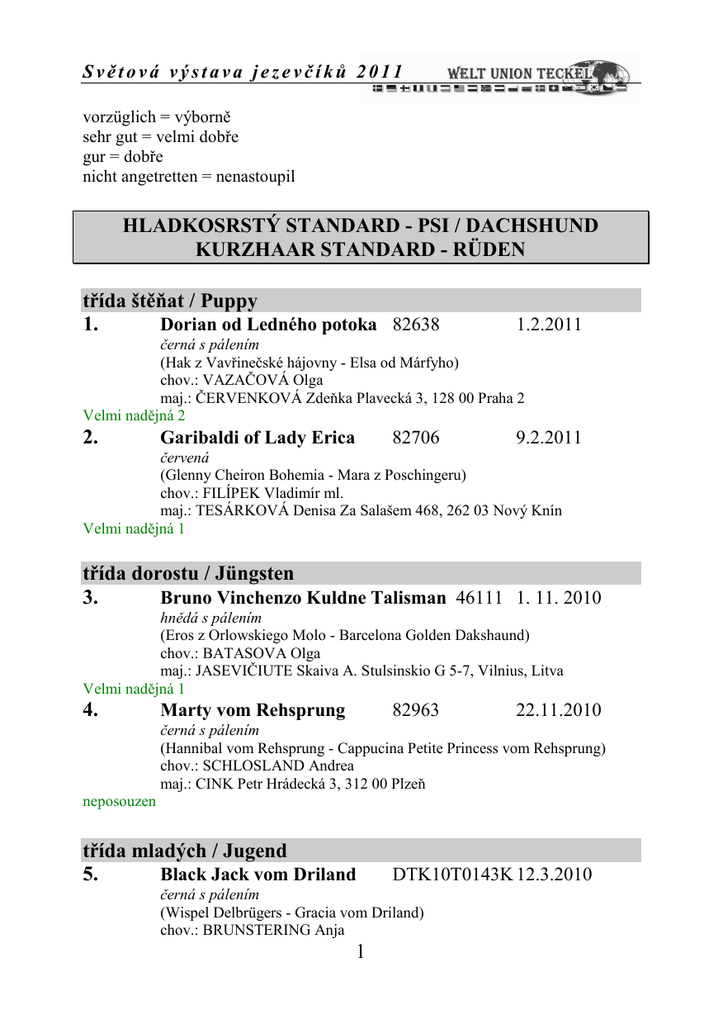 Světová výstava jezevčíků 2011 vorzüglich = výborně sehr gut = velmi dobře gur = dobře nicht angetretten = nenastoupil HLADKOSRSTÝ STANDARD - PSI / DACHSHUND KURZHAAR STANDARD - RÜDEN třída štěňat / Puppy 1. Dorian od Ledného potoka 82638 1.2.2011 černá s pálením (Hak z Vavřinečské hájovny - Elsa od Márfyho) chov.: VAZAČOVÁ Olga maj.: ČERVENKOVÁ Zdeňka Plavecká 3, 128 00 Praha 2 Velmi nadějná 2 2. Garibaldi of Lady Erica 82706 9.2.2011 červená (Glenny Cheiron Bohemia - Mara z Poschingeru) chov.: FILÍPEK Vladimír ml. maj.: TESÁRKOVÁ Denisa Za Salašem 468, 262 03 Nový Knín Velmi nadějná 1 třída dorostu / Jüngsten Bruno Vinchenzo Kuldne Talisman 46111 1. 11. 2010 3. hnědá s pálením (Eros z Orlowskiego Molo - Barcelona Golden Dakshaund) chov.: BATASOVA Olga maj.: JASEVIČIUTE Skaiva A. Stulsinskio G 5-7, Vilnius, Litva Velmi nadějná 1 4. Marty vom Rehsprung 82963 22.11.2010 černá s pálením (Hannibal vom Rehsprung - Cappucina Petite Princess vom Rehsprung) chov.: SCHLOSLAND Andrea maj.: CINK Petr Hrádecká 3, 312 00 Plzeň neposouzen třída mladých / Jugend 5. Black Jack vom Driland DTK10T0143K 12.3.2010 černá s pálením (Wispel Delbrügers - Gracia vom Driland) chov.: BRUNSTERING Anja 1 Světová výstava jezevčíků 2011 vorzüglich = výborně sehr gut = velmi dobře gur = dobře nicht angetretten = nenastoupil maj.: BRUNSTERING Anja Springbiel 1, 484 55 Bad Bentheim, Německo Výborná 1, CAJC, Světový vítěz mladých WUT 2011 6. Cid ze Slavičího vrchu 81232 21.5.2010 červená (Oliver z Poschingeru - Mína z Poschingeru) chov.: VENCLOVÁ Petra maj.: ŠTEFKOVÁ Jana Pod Karlovicemi 1224, 564 01 Žamberk Výborná 3 7. Diesel z Raholin 80935 26.4.2010 černá s pálením (Cato ze Zelené mýtiny - Honey z Vavřinečské hájovny) chov.: CHODILOVÁ Markéta Bc. maj.: RAAB Katja Plavecká 3, 128 00 Praha 2 Velmi dobrá 8. Elton z Hradskej Hory SPKP7130 29.3.2010 červená (Jättilainen Keski-Maan - Alex Amber Twine) chov.: ČERMÁK Karol maj.: ČERMÁK Karol Pod Lipami 107, 033 01 Liptovský Hrádok, Slovensko Velmi dobrá 9. Ferrero Zoldachs 24.12.2010 CORA1294-10/148 hnědá s pálením (Ken vom Lachsenbach - Born 2B Happy Zoldachs) chov.: MAJOROS Eva maj.: ILIE Anca Pictor Lidia Agricola nr. 14, Rumunsko Výborná 2 10. Fiddy z Tisovského háje 80814 31.3.2010 černá s pálením (Aragon z Chromova dvora - Witka z Kordegardy) chov.: KUBÍKOVÁ Ludmila maj.: JEŘÁBEK Hubert Trocnovská 1724, 347 01 Tachov Velmi dobrá mezitřída / Zwischenkl. 2 Světová výstava jezevčíků 2011 vorzüglich = výborně sehr gut = velmi dobře gur = dobře nicht angetretten = nenastoupil 11. Egoist Hodowla Mylsinów Kantri Park's 27.2.2010 PKR.IV-25706 červená (El Celtibero Arcano's - Alpheratz Catwalk) chov.: BOBIKOVA Valeria maj.: OLESCZUK Wanda Myslinów 16, 59 424 Mecinka, Polsko Výborná 1, CAC, Světový vítěz WUT 2011 12. Filosofic Goldachs 24.12.2010 COR1293-10/148 hnědá s pálením (Ken vom Lachsenbach - Born 2B Happy Zoldachs) chov.: MAJOROS Eva maj.: Eva MAJOROS Silviculturii 2, 430 332 Baia Mare, Rumunsko Výborná 2, r. CAC 13. Lorenzo von der Windedze 09T0576K 13.10.2009 červená, žíhaná (Orlando vom Markushof - Ninette Engels) chov.: HIRLAND Karin maj.: STEINS Elke Willy-Brandt str. 60, 514 69 Bergiseh Gladbach, Německo Výborná 4 14. Nor z Kozíčku 7998710 23. 9. 2009 červená (Il-Faro Fino Bohemia - Elíss Z Mojmírova domu) chov.: COUFAL Jan maj.: SOBEK Petr Šumbarská 29/197, Havířov - Dolní Suchá, 73564 Výborná 3 15. Voque Klan Ady Lowczyni 43810 2. 12. 2009 černá s pálením (Eskamilio Kantri Park’s - Garda-Carda Klan Ady Lowczyni) chov.: WOLKOWSKA Danuta maj.: JASEVIČIUTE Skaiva A. Stulsinskio G 5-7, Vilnius, Litva Výborná třída otevřená / Offene 16. Amy od Vaňkovy skály 78860 červená 3 25.5.2009 Světová výstava jezevčíků 2011 vorzüglich = výborně sehr gut = velmi dobře gur = dobře nicht angetretten = nenastoupil (Oscar z Poschingeru - Ully z Poschingeru) chov.: VAŇKOVÁ PŘIBYLOVÁ Jitka maj.: HLINÁKOVÁ Jana Náměstí ČSA 31, 551 01 Jaroměř Výborná 17. Aston Martin Dominant Instinct 0.1.1900 SPKP7113 červená (Arden z Poschingeru - Mystery Fino Bohemia) chov.: BALÁŽ Roman maj.: BALÁŽ Roman Ivana Krasku 1767/18, 960 01 Zvolen., Slovensko Výborná 2, r. CAC 18. Dakar z Moravského vikýře 24. 2. 2009 7823910 černá s pálením (Goldader Exclusive - Fatty Z Vamberecké stráně) chov.: DITTRICHOVÁ ROZ. KRáTKá Světlana maj.: NESVORNý Jan Branická 118, Praha 4, 14700, Česká Republika Výborná 4 19. Gabriel von der Amtsschlade 20.5.2008 DTK08T0279K hnědá s pálením (Jago Engels - Naomi Engels) chov.: BATHE Yutta maj.: THEUNIS Silke Hereheidestraat 20, 3560 Lummen, Belgie Výborná 3 20. Garp z Vamberecké stráně 75640 26.1.2008 černá s pálením (Niky od Hagarda Orla - Frencis z Vamberecké stráně) chov.: ŠUBRT Josef maj.: MÜLLER Zdeněk 468 12 Bedřichov 152 Výborná 21. Yahoo Diva Noire Rt.-48/07 černá s pálením (Alaric Rufus van't Woeste Huys - Xantia Diva Noire) chov.: BENCSIK Zsolt maj.: BENCSIK Zsolt Gólya u. 38, 2030 Érd, Maďarsko Výborná 1, CAC 4 3.2.2007 Světová výstava jezevčíků 2011 vorzüglich = výborně sehr gut = velmi dobře gur = dobře nicht angetretten = nenastoupil třída pracovní / Gebrauch 22. Ahur Phillipo Saltatrix 7767409 18. 9. 2008 červená (Cato Delbrüggers - Elischa ze Slívku) chov.: JANDOVY Marie a Klára maj.: JANDOVY Marie a Klára Ledčická 643, Praha, 18400, Výborná 3 23. Ben Schacht's 09T0172K 15.4.2009 černá s pálením (Bax vom Grabsteder Grund - Nala vom Laschenbach) chov.: SCHACHT Silke maj.: SCHACHT Silke Eckernfördenerstr. 97, 24116 Kiel, Německo Výborná 24. Bily z Moravského vikýře 75510 12.12.2007 černá s pálením (Niky od Hagarda Orla - Fatty z Vamberecké stráně) chov.: KRÁTKÁ Světlana maj.: MLÁDKOVI Ivana + Václav 1. máje 14/870, 736 01 Haví