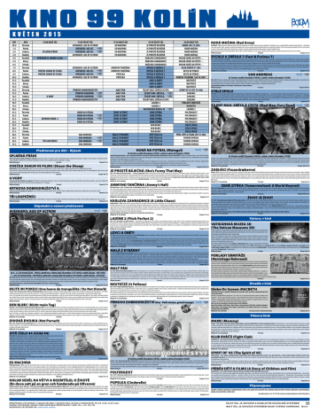 KVĚTEN 2015 DAT 30.4 1.5 2.5 3.5 4.5 5.5 6.5 7.5 8.5 9.5 10.5 11.5 12.5 13.5 14.5 15.5 16.5 17.5 18.5 19.5 20.5 21.5 22.5 23.5 24.5 25.5 26.5 27.5 28.5 29.5 30.5 31.5 DEN Čtvrtek Pátek Sobota Neděle Pondělí Úterý Středa Čtvrtek Pátek Sobota Neděle Pondělí Úterý Středa Čtvrtek Pátek Sobota Neděle Pondělí Úterý Středa Čtvrtek Pátek Sobota Neděle Pondělí Úterý Středa Čtvrtek Pátek Sobota Neděle 15:00 MALÝ SÁL SPLNĚNÁ PŘÁNÍ 17:00 VELKÝ SÁL AVENGERS: AGE OF ULTRON AVENGERS: AGE OF.. AVENGERS: AGE OF.. AVENGERS: AGE OF ULTRON 17:30 MALÝ SÁL EX MACHINA EX MACHINA EX MACHINA EX MACHINA 19:30 VELKÝ SÁL JE PROSTĚ BÁJEČNÁ JE PROSTĚ BÁJEČNÁ JE PROSTĚ BÁJEČNÁ JE PROSTĚ BÁJEČNÁ KRÁLOVA ZAHRADNICE KRÁLOVA ZAHRADNICE KRÁLOVA ZAHRADNICE RYCHLE A ZBĚSILE 7 RYCHLE A ZBĚSILE 7 RYCHLE A ZBĚSILE 7 RYCHLE A ZBĚSILE 7 LOVCI A OBĚTI LOVCI A OBĚTI LOVCI A OBĚTI ŠÍLENÝ MAX: ZBĚSILÁ CESTA ŠÍLENÝ MAX: ZBĚSILÁ.. ŠÍLENÝ MAX: ZBĚSILÁ.. ŠÍLENÝ MAX: ZBĚSILÁ CESTA LADÍME 2 LADÍME 2 VATIKÁNSKÁ MUZEA 3D ZEMĚ ZÍTŘKA ZEMĚ ZÍTŘKA ZEMĚ ZÍTŘKA ZEMĚ ZÍTŘKA DEN BLBEC DEN BLBEC DEN BLBEC DÍTĚ ČÍSLO 44 DÍTĚ ČÍSLO 44 DÍTĚ ČÍSLO 44 DÍTĚ ČÍSLO 44 VYBÍJENÁ (H. MÁMA-9.30h) OVEČKA SHAUN VE FILMU OVEČKA SHAUN VE FILMU U VODY KRTKOVA DOBR. 4 TŘI LOUPEŽNÍCI AVENGERS: AGE OF ULTRON AVENGERS: AGE OF.. AVENGERS: AGE OF.. AVENGERS: AGE OF ULTRON JIMMYHO TANČÍRNA JIMMYHO TANČÍRNA POPELKA POPELKA PÍRKOVO DOBRODRUŽSTVÍ PÍRKOVO DOBRODR. PÍRKOVO DOBRODR. PÍRKOVO DOBRODRUŽSTVÍ MALÝ PÁN MALÝ PÁN MALÝ PÁN MALÝ PÁN HURÁ NA FOTBAL HURÁ NA FOTBAL HURÁ NA FOTBAL HURÁ NA FOTBAL ŽIVOT JE ŽIVOT ŽIVOT JE ŽIVOT ŽIVOT JE ŽIVOT ŽIVOT JE ŽIVOT SAN ANDREAS SAN ANDREAS SAN ANDREAS SAN ANDREAS MALÁ Z RYBÁRNY MALÁ Z RYBÁRNY MALÁ Z RYBÁRNY MALÁ Z RYBÁRNY 20:00 MALÝ SÁL MAMI! (FK-19.30h) RUDÁ MAŠINA RUDÁ MAŠINA RUDÁ MAŠINA HOLUB SEDĚL NA VĚTVI… HOLUB SEDĚL NA VĚTVI… HOLUB SEDĚL NA VĚTVI… KLUB RVÁČŮ (P-100) DEJTE MI POKOJ! DEJTE MI POKOJ! BERLÍN. FILHARM. *od 19.30h* NEUTEČEŠ NEUTEČEŠ NEUTEČEŠ SPIRIT OF 45 (FK-19.30h) ZABIJÁCI ZABIJÁCI ZABIJÁCI POKLADY ERMITÁŽE MACBETH LADÍME 2 POLTERGEIST POLTERGEIST POLTERGEIST POLTERGEIST STÁLE SPOLU STÁLE SPOLU STÁLE SPOLU PŘÍB. DĚTÍ A FILMU (FK-19.30h) DIVOKÁ DVOJKA DIVOKÁ DVOJKA DIVOKÁ DVOJKA RUDÁ MAŠINA (Red Army) USA/Rusko - 2014. Celovečerní dokument, jehož autoři byli nominováni na Oscara a získali cenu Emmy, pojednává o Sovětském svazu a o nejúspěšnějším uskupení sportovní historie - o hokejovém týmu Rudá armáda. Příběh, vyprávěný z pohledu jeho kapitána Slavy Fetisova, popisuje přerod národního hrdiny do role politického nepřítele. Film, který zachycuje jak období SSSR, tak i ruské, zkoumá to, jak se ve sportu odráží společenská a kulturní hnutí, a hledá ve vzestupu a pádu týmu Rudá armáda paralely s vývojem Sovětského svazu. Rudá Mašina (Red Army) je pozoruhodný příběh studené války na zimních stadionech, a muže, který se vzepřel mocnému aparátu a umožnil celým generacím Rusů cestu ke změnám. Mládeži přístupný 85 minut Vstupné 120,- Kč RYCHLE A ZBĚSILE 7 (Fast & Furious 7) USA - 2014. Pomsta se vrací domů... I auta můžou létat. Alespoň pro nesmrtelnou sérii Rychle a zběsile to platí. Její hrdinové už stihli prožít a přežít neuvěřitelné věci, teď však narazí na nepřítele, vedle něhož všichni jejich dosavadní soupeři připomínají bandu dětí z mateřské školky. Počet fanoušků ságy s každým dalším dílem rapidně narůstá, ale tvůrci nenechávají nic náhodě. Už tak našlapanou hereckou sestavu v sedmém díle vyšperkovali Kurtem Russellem a hlavně Jasonem Stathamem, ikonou rychlých a zběsilých filmových řidičů. Statham hraje Deckarda Shawa, živý stroj na zabíjení, který vycvičila elitní vojenská jednotka. Pokud vám příjmení téhle postavy něco připomíná, pak se nepletete. Shawův mladší bratr Owen obtěžoval naše hrdiny v šestém díle tak intenzivně, až ho připravili o život. A rozrušený Shaw starší se rozhodne, že na oplátku připraví o život je a všechny jejich blízké. Bez ohledu na to, jak rychlí či zběsilí budou. Hrají: Vin Diesel, Paul Walker, Jason Statham, Dwayne Johnson, Michelle Rodriguez, Jordana Brewster, Tyrese Gibson.. Mládeži do 12 let nevhodný 132 minut Vstupné 110,- Kč SAN ANDREAS Ve čtvrtek a neděli 2D projekce (100 Kč), v pátek a sobotu 3D projekce (130 Kč) USA - 2015. Poté, kdy o sobě dá vědět nechvalně známý tektonický zlom San Andreas a vyvolá v Kalifornii zemětřesení o síle 9 Richterovy stupnice, vydávají se pilot průzkumného a záchranného vrtulníku (Dwayne Johnson) a jeho bývalá manželka, s níž již delší dobu nežije, na cestu z Los Angeles do San Francisca zachránit svou jedinou dceru. Ale jejich složitá cesta na sever je pouze začátek. A když už si myslí, že to nejhorší už mají za sebou... tak velké drama teprve začíná. Hrají: Alexandra Daddario, Carla Gugino, Colton Haynes, Dwayne Johnson. Mládeži přístupný 115 minut Vstupné 100/130,- STÁLE SPOLU ČR- 2014. Petr a Simona spolu žijí dvacet pět let. Mají devět dětí, se kterými bydlí v maringotkách na šumavské louce – bez televize, počítače a tekoucí vody. Autoritativní Petr sám sebe nazývá „profesionálním otcem.“ Potomky vede ke svobodě a souznění s přírodou a zároveň se je snaží chránit před škodlivým vlivem konzumní společnosti. Do školy chodí děti jen na přezkoušení - vysokoškolsky vzdělání rodiče je učí doma. Rodinná soudržnost, která v dnešním západním světě už prakticky nemá obdoby, působí na první pohled idylicky. Při bližším pozorování však začínají vyvstávat pochybnosti. Film Stále spolu zkoumá, jaká je