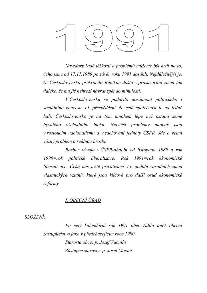 Navzdory řadě těžkostí a problémů můžeme být hrdi na to, čeho jsme od 17.11.1989 po závěr roku 1991 dosáhli. Nejdůležitější je, že Československo překročilo Rubikon-došlo v prosazování změn tak daleko, že mu již nehrozí návrat zpět do minulosti. V Československu se podařilo dosáhnout politického i sociálního koncesu, t.j. přesvědčení, že celá společnost je na jedné lodi. Československo je na tom mnohem lépe než ostatní země bývalého východního bloku. Největší problémy naopak jsou v rostoucím nacionalismu a v zachování jednoty ČSFR. Jde o velmi vážný problém a reálnou hrozbu. Rozbor vývoje v ČSFR-období od listopadu 1989 a rok 1990=rok politické liberalizace. Rok 1991=rok ekonomické liberalizace. Čeká nás ještě privatizace, t.j. období zásadních změn vlastnických vztahů, které jsou klíčové pro další osud ekonomické reformy. I. OBECNÍ ÚŘAD SLOŽENÍ: Po celý kalendářní rok 1991 obec řídilo totéž obecní zastupitelstvo jako v předcházejícím roce 1990. Starosta obce: p. Josef Vaculín Zástupce starosty: p. Josef Machů 1. radní: p. Vladimír Měřínský, do jeho kompetence svěřeno řízení komise kulturně sociální. Jmenovaný požádal o zproštění poslaneckého mandátu v obecním zastupitelství. Jeho žádost Radou obecního úřadu byla projednána dne 31.10.t.r. 2. radní: p. Jan Šafařík, stejně jako v minulém roce řídí komisi výstavby 3. radní: p. Josef Urubek, pověřen řízením komise kontrolní Členem okresního shromáždění za obec Újezd zůstává p. Josef Vaculín, starosta obce. Zaměstnanci obecního úřadu: Jana Dohnalová-účetní obecního úřadu Jindřiška Šafaříková-samostatná referentka a matrikářka Ludmila Kráčalíková-ve funkci účetní pracovala do zrušení drobných provozoven t.j. do 25.7.1991 Miroslav Polomík-řidič, jeho pracvní poměr jako zaměstnance obecního úřadu ukončen v průběhu roku Františka Urubková-uklizečka, ze zdravotních důvodů pracovní poměr ukončen Josef Polčák-topič jen po dobu topné sezony r. 1991 Emil Hlavička-zaměstnanec obecního úřadu pro úklid obce Anna Petulová-uklizečka budovy nastoupila v II. pololetí roku 1991 Úřední hodiny zůstávají nezměněny. Pondělí 7,00-16,30 Úterý 7,00-15,00 Středa 7,00-17,00 Čtvrtek 7,00-15,00 obecního úřadu Pátek 7,00-14,30 Sobota a neděle jsou dny pracovního klidu. V tyto dny se ohlásí rozhlasové zařízení obecního úřadu, pokud kdo z občanů slaví své životní výročí či je hlášena jiná významná událost. ČINNOST OÚ: Od voleb do obecního zastupitelstva (podzim 1990) uběhlo několik měsíců. Občané již přicházejí na ,,obec“ a ne na ,,národní výbor“. V budově OÚ se schází obecní rada a také zastupitelstvo, v jeho čelo byl zvolen starosta a již ne předseda. Vyšším orgánem je Okresní úřad ve Zlíně, nikoliv v Gottwaldově, v jeho čele pracuje přednosta p. PhDr. Zdeněk Dostál. Členové našeho obecního zastupitelstva nejsou funkcionáři nezkušení, bohužel někteří pracovali jako poslanci ve volebních obdobích národních výborů. Všichni členové obecního zastupitelstva podporují drobné podnikání na úseku obchodu, služeb. Během roku 1991 jen v naší obci bylo evidováno na Okresním úřadě ve Zlíně, na odboru Místního hospodářství, 66 registrů. NEZAMĚSTNANÍ: V roce 1991 zaměstnával obecní úřad asi 6 pracovníků. Byli to převážně mladiství z místních nezaměstnaných. Úřad práce ve Zlíně hradil v plné výši mzdy. Tito nezaměstnaní-zaměstnaní vykonávali práce v rámci obce. Byly to práce úklidové na veřejném prostranství, zajišťovali sjízdnost a bezpečnost místních komunikací, podíleli se na výstavbě chodníku ke škole, byla opravena střecha na obecních objektech. Ze zápisů rady obecního úřadu: 27.12.1990 1. V obci budou od 1.1.1991 pracovat tyto komise: 1) stavební-předseda: Jan Šafařík, 2. radní členové: Stanislav Drga, Jaroslav Martinec 2) finanční-předseda: Jaroslav Janoš členové: Stanislav Černobila, Vladimír Kráčalík 3) kontrolní-předseda: Josef Urubek, 3. radní členové: Josef Raška 4) školská a kulturní-předseda: Vladimír Měřínský členové: Vojtěška Černobilová, Jiřina Maliňáková 5) pro mládež a sport-předseda: Josef Maliňák členové: Miroslav Dohnal Práci Sboru pro občanské záležitosti (SOZ) bude řídit komise školská a kulturní. 2. Obecní rada v závěru roku 1990 požádala o navrácení obecních lesů a o zastavení těžby dřeva v obecních lesích. Nato, během r. 1991 obecní úřad převzal obecní lesy po 40 letech do vlastnictví. Výměra činí asi 65 ha a s nimi přibyly starosti o péči, dohled. Toto vše dostala do kompetence komise výstavby. 17.1.1991 1. Byla schválena daň ze psů a to aktivně činní občané zaplatí složenkou 100,- Kčs, důchodci a pasekáři 50,- Kčs za rok. 2. Obec Újezd byla rozdělena na 15 obvodů. 19.2.1991 1. Rada OÚ souhlasila přidělit místnost bývalé čistírny v Domě služeb do ekonomického pronájmu p. Aleně a Miroslavu Pavelkovi pro obchodní činnost-prodejnu se smíšeným zbožím. 14.3.1991 1. Vedoucí kulturního zařízení, majetku OÚ, byla stanovena paní Vojtěška Černobilová. 2. Rada obecního zastupitelstva vydala zákaz prodeje pornografického tisku v prodejnách a stáncích obce. 4.4.1991 1. Od 1.4.1991 se zvyšuje poplatek za odvoz popela a to na 160,- Kčs. 2. Upravují se poplatky za jednohroby a popelnicové hroby na 60,- Kčs, za dvojhroby na 120,- Kčs a hrobky na 375,- Kčs. Výše poplatků je za každý m2 plochy na dobu 15 let. 2.5.1991 1. Úpravu návsi (včetně zeleně) provádí p. František Machů, Újezd 308. 23.5.1991 1. V letních měsících v zájmu šetření elektrickou energií bude omezeno osvětlení veřejn