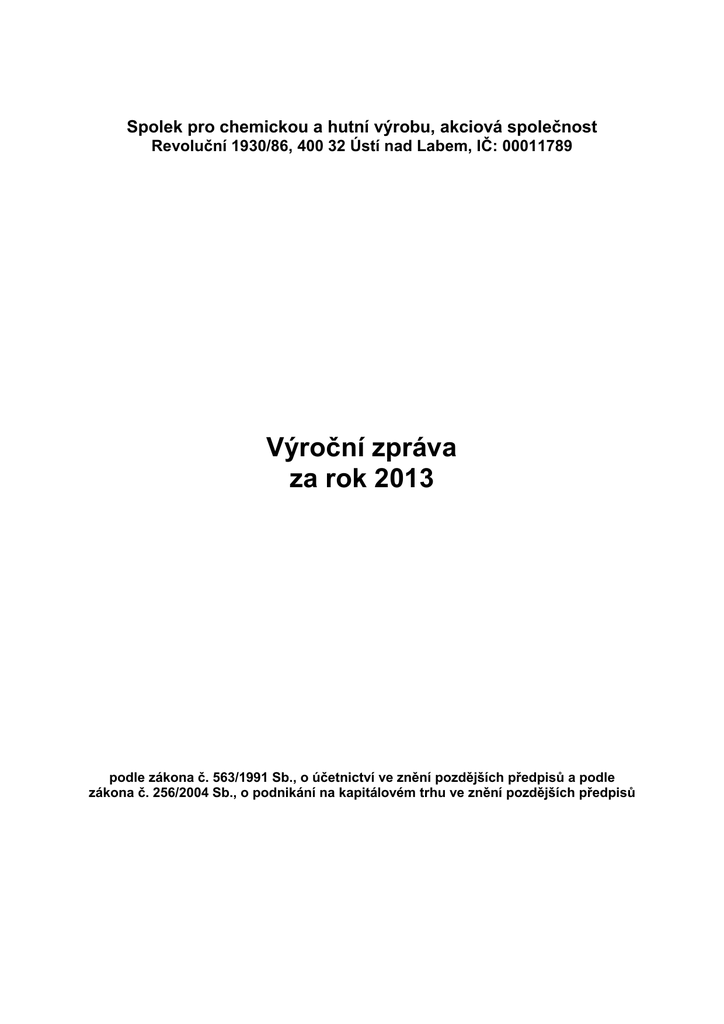 Spolek pro chemickou a hutní výrobu, akciová společnost Revoluční 1930/86, 400 32 Ústí nad Labem, IČ: 00011789 Výroční zpráva za rok 2013 podle zákona č. 563/1991 Sb., o účetnictví ve znění pozdějších předpisů a podle zákona č. 256/2004 Sb., o podnikání na kapitálovém trhu ve znění pozdějších předpisů OBSAH VÝROČNÍ ZPRÁVA ZA ROK 2013 podle zákona č. 563/1991 Sb., o účetnictví ve znění pozdějších předpisů a podle zákona č. 256/2004 Sb., o podnikání na kapitálovém trhu ve znění pozdějších předpisů (dále jen výroční zpráva) pro emitenty kótovaných cenných papírů. Zpráva nezávislého auditora pro akcionáře společnosti Spolek pro chemickou a hutní výrobu, akciová společnost I. ZPRÁVA PŘEDSTAVENSTVA O PODNIKATELSKÉ ČINNOSTI SPOLEČNOSTI, STAVU JEJÍHO MAJETKU ZA ROK 2013, ŘÁDNÉ ÚČETNÍ ZÁVĚRCE ZA ROK 2013, KONSOLIDOVANÉ ÚČETNÍ ZÁVĚRCE ZA ROK 2013 A NÁVRHU NA ROZDĚLENÍ ZISKU ZA ROK 2013 II. TEXTOVÁ ČÁST VÝROČNÍ ZPRÁVY EMITENTA KÓTOVANÉHO CENNÉHO PAPÍRU 1. 2. 3. 4. 5. Údaje o emitentovi kótovaného cenného papíru Údaje o činnosti Údaje o majetku a finanční situaci Údaje o statutárních a dozorčích orgánech emitenta Informace dle § 118 odst. 4 písm. b), c), e), j) a odst. 5 zákona č. 256/2004 Sb., o podnikání na kapitálovém trhu, ve znění pozdějších předpisů 5. Údaje o osobách odpovědných za výroční zprávu Pozn.: V některých bodech této části výroční zprávy se vyskytuje odkaz na příslušnou část Účetní závěrky ke dni 31.12.2013 nebo odkaz na příslušnou část Konsolidované účetní závěrce ke dni 31.12.2013, které jsou součástí této zprávy, popřípadě odkaz na Zprávu o vztazích mezi ovládající a ovládanou osobou a o vztazích mezi ovládanou osobou a ostatními osobami ovládanými stejnou ovládající osobou za rok 2013, která je také součástí této zprávy (dále jen Zpráva o vztazích). III. NEKONSOLIDOVANÁ ÚČETNÍ ZÁVĚRKA SESTAVENÁ DLE IFRS VE ZNĚNÍ PŘIJATÉM EU ZA ROK 2013 IV. KONSOLIDOVANÁ ÚČETNÍ ZÁVĚRKA PŘIPRAVENÁ PODLE MEZINÁRODNÍCH STANDARDŮ ÚČETNÍHO VÝKAZNICTVÍ VE ZNĚNÍ PŘIJATÉM EU SESTAVENÁ K 31. PROSINCI 2013 V. ZPRÁVA O VZTAZÍCH MEZI PROPOJENÝMI OSOBAMI ZA ROK 2013 1 KPMG Česká republika Audit, s.r.o. Pobřežní 648/1 a 186 00 Praha 8 Česká republika Telephone Fax Internet +420 222 123 111 +420 222 123 100 www.kpmg.cz Zpráva nezávislého auditora pro akcionáře společnosti Spolek pro chemickou a hutní výrobu, akciová společnost Nekonsolidovaná účetní závěrka Na základě provedeného auditu jsme dne 30. května 2014 vydali k účetní závěrce, která je součástí této výroční zprávy, zprávu následujícího znění: „Provedli jsme audit přiložené účetní závěrky společnosti Spolek pro chemickou a hutní výrobu, akciová společnost, tj. výkazu o finanční pozici k 31. prosinci 2013, výkazu o úplném výsledku, výkazu změn vlastního kapitálu a výkazu o peněžních tocích za rok 2013 a přílohy této účetní závěrky, včetně popisu použitých významných účetních metod a ostatních doplňujících údajů. Údaje o společnosti Spolek pro chemickou a hutní výrobu, akciová společnost jsou uvedeny v bodě 1 přílohy této účetní závěrky. Odpovědnost statutárního orgánu účetní jednotky za účetní závěrku Statutární orgán společnosti Spolek pro chemickou a hutní výrobu, akciová společnost je odpovědný za sestavení účetní závěrky, která podává věrný a poctivý obraz v souladu s Mezinárodními standardy účetního výkaznictví ve znění přijatém Evropskou unií, a za takový vnitřní kontrolní systém, který považuje za nezbytný pro sestavení účetní závěrky tak, aby neobsahovala významné nesprávnosti způsobené podvodem nebo chybou. Odpovědnost auditora Naší odpovědností je vyjádřit na základě provedeného auditu výrok k této účetní závěrce. Audit jsme provedli v souladu se zákonem o auditorech, Mezinárodními auditorskými standardy a souvisejícími aplikačními doložkami Komory auditorů České republiky. V souladu s těmito předpisy jsme povinni dodržovat etické požadavky a naplánovat a provést audit tak, abychom získali přiměřenou jistotu, že účetní závěrka neobsahuje významné nesprávnosti. Audit zahrnuje provedení auditorských postupů, jejichž cílem je získat důkazní informace o částkách a skutečnostech uvedených v účetní závěrce. Výběr auditorských postupů závisí na úsudku auditora, včetně vyhodnocení rizik, že účetní závěrka obsahuje významné nesprávnosti způsobené podvodem nebo chybou. Při vyhodnocování těchto rizik auditor posoudí vnitřní kontrolní systém, který je relevantní pro sestavení účetní závěrky podávající věrný a poctivý obraz. Cílem tohoto posouzení je navrhnout vhodné auditorské postupy, nikoli vyjádřit se k účinnosti vnitřního kontrolního systému účetní jednotky. Audit též zahrnuje posouzení vhodnosti použitých účetních metod, přiměřenosti účetních odhadů provedených vedením i posouzení celkové prezentace účetní závěrky. Jsme přesvědčeni, že získané důkazní informace poskytují dostatečný a vhodný základ pro vyjádření našeho výroku. Obchodní rejstřík vedený Městským soudem v Praze oddíl C, vložka 24185. KPMG Česká republika Audit, s.r.o., a Czech limited liability company and a member firm of the KPMG network of independent member firms affiliated with KPMG International Cooperative (“KPMG International"), a Swiss entity. IČ 49619187 DIČ CZ699001996 Výrok auditora Podle našeho názoru účetní závěrka podává věrný a poctivý obraz aktiv a pasiv společnosti Spolek pro chemickou a hutní výrobu, akciová společnost k 31. prosinci 2013 a n