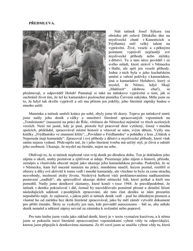 PŘEDMLUVA. Náš tatínek Josef Sýkora (na obrázku při oslavě Dětského dne na myslivecké chatě v Kunraticích u Frýdlantu) měl velký talent na vyprávění. Živě, vesele a s pěknými pointami vyprávěl nejčastěji své myslivecké příhody nebo zážitky z dětství. Tu a tam něco pověděl i ze svého mládí, které strávil v Německu v Halle, ale spíš jen veselé příhody. Jedna z nich byla o jeho kuchařském umění a vaření polévky s kamarádem, jiná o kamarádovi Holubovi, který si myslel, že Němci, když říkají „Mahlzeit“ (dobrou chuť), se představují, a odpověděl Holub! Pamatuji si také na tatínkovo vyprávění o tom, jak si zachránil život tím, že šel ke kamarádovi poslouchat písničku Červená sukýnka. Měla jsem za to, že když tak skvěle vyprávěl a oči mu přitom jen jiskřily, jeho literární zápisky budou o mnoho sušší. Maminka a tatínek umřeli krátce po sobě, zbyly jsme tři dcery. Teprve po tatínkově smrti jsme našly jeho deník z války a množství literárně zpracovaných vzpomínek na „Totaleinsatz“ (nasazení na práci do Říše, většinou do Německa) nejméně ve třech ucelených verzích. Není mi jasné, kdy je psal, protože byl pracovně dost vytížený, činný v mnoha spolcích, překládal, zpracovával místní historii a věnoval se nám, svým dětem. Vyšly mu knížky „Frýdlantsko ve znamení kříže“, „Povídání o Frýdlantsku“ a pohádky z lesa „Ušáček a Neposeda mají kamarády“. Zpracoval i své příhody z dětství a myslivecké příhody, které však zatím nejsou vydané. Překvapilo mě, že i jeho literární tvorba má určitý styl, je čtivá a odráží jeho osobnost. Ukazuje, že myslel na čtenáře, nejen na sebe. Obdivuji to, že si tatínek nepřestal vést svůj deník po dlouhou dobu. Ten je dokladem jeho zájmu o okolí, snahy poznávat a zjišťovat si údaje. Prozrazuje jeho zájem o historii, přírodu, zeměpis a vlastivědu obecně stejně jako ukazuje jeho kamarádskou povahu. Podotýká, že se v Německu, kam byl nuceně nasazen na práci, mnohému naučil, leccos poznal, rozšířil si obzory a díky své aktivitě k tomu vedl i mnohé kamarády, ale všechno to bylo za cenu strachu, nesvobody, možnosti ztráty života. Neskrývá hořkost vůči proklamovanému nadřazenému postavení „nadlidí“, ale spravedlivě ukazuje dobré německé lidi, které potkal a kteří mu pomohli. Našly jsme deníkové záznamy, které končí v roce 1944. Je pravděpodobné, že tatínek v deníku pokračoval i dál, čemuž by nasvědčovalo poměrně přesné a detailní líčení následujících událostí z pozdějších zpracování, ale tuto část deníku se nám prozatím nepodařilo najít. Je zajímavé, s jakou péčí si tatínek deník vedl – psal ho úhledným písmem a vlastně ho od začátku bez škrtů literárně zpracovával, jako by měl záměr vytvořit dokument pro příští čtenáře. Škrty se vyskytly jen tam, kde prováděl autocenzuru – bál se, aby někdo deník nenašel a některé zápisy nevzal za záminku k uvěznění nebo popravě. Pro tuto knihu jsem vzala jako základ deník, který je v textu vyznačen kurzívou, a k němu jsem se pokusila mezi literárně zpracovanými vzpomínkami vybrat vždy tu odpovídající, kterou jsem připojila k deníkovému záznamu. Ze tří verzí jsem se snažila vybrat vždy tu, která byla pěkně formulovaná a působila autenticky. Někdy jde o směs těchto tří verzí. Literárně zpracované příhody většinou neměly dataci jako deníkové záznamy, byla to tedy někdy téměř detektivní práce najít odpovídající příhodu k deníkovému záznamu. Snažila jsem se zachovat úpravu deníkových záznamů tak, jak ji zavedl tatínek, tedy ne vždy dokonale jednotně. V knize se čtenář někdy dozví o téže události dvojmo: jednou z deníkového záznamu, podruhé z textu, který tatínek později zpracoval. Záměrně jsem tuto duplicitu nechala, aby čtenáři mohli posoudit, jak autor vyprávění s odstupem vnímal některé události nebo jak se je snažil literárně uchopit. Tatínek (na obrázku na Dětském dnu v Kunraticích) si také vytvořil album pohledů a fotografií, které vyzdobil květinovými ornamenty. První list alba obsahuje tatínkem vytvořenou mapku míst, která navštívil, a ozdobně napsaný úvod. Kopie archů fotoalba jsou připojeny v příloze. Z nich jsem přefotografovala jednotlivé pohledy nebo fotografie a zařadila je do textu. Tatínek i v tom projevil velkou prozíravost, když téměř vše je možno zdokumentovat na základě pohledů a fotografií, které si pořídil. Také si schoval některé jízdenky, vstupenky a program z divadla. V textu jsem se snažila využít maximum materiálů z rodinného archivu, které se k příběhu pojí. Někdy bude muset čtenář zapojit fantazii, protože například kvalita fotografií není špičková. Pro shovívavého čtenáře jsou také určeny ilustrační skici, které jsem nakreslila podle dobových fotografií. Pro nás, tři sestry, mají tyto materiály cenu pokladu (na obrázku je první stránka fotoalba s pohledy a fotografiemi z doby 2. světové války). Uvědomujeme si ale, že mnoho lidí by mohlo tatínkovo vyprávění, doprovázené množstvím dokumentace, také zajímat. Vydáním knížky chceme vzpomenout na tatínka jako skvělého člověka, ze tmy zapomnění vynést dílo, které vytvořil, přihlásit se k jeho odkazu, a dát čtenářům autentický dokument, obohacený o osobité postřehy a úvahy. Jistě mi dáte za pravdu, že to byl veselý a optimistický člověk. Přeju Vám, abyste si užili jeho přítomnost. Tak „Mahlzeit“ ke čtení! Anna Košárková, rozená Sýkorová. TATÍNKOVY VZPOMÍNKY. Josef Sýkora Tatínkův deník ÚVOD. Sotva jsem vstupoval do světa dospělých a začal se mi otvírat svět