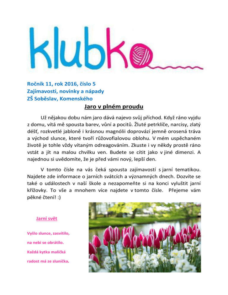 Ročník 11, rok 2016, číslo 5 Zajímavosti, novinky a nápady ZŠ Soběslav, Komenského Jaro v plném proudu Už nějakou dobu nám jaro dává najevo svůj příchod. Když ráno vyjdu z domu, vítá mě spousta barev, vůní a pocitů. Žluté petrklíče, narcisy, zlatý déšť, rozkvetlé jabloně i krásnou magnólii doprovází jemně orosená tráva a východ slunce, které tvoří růžovofialovou oblohu. V mém uspěchaném životě je tohle vždy vítaným odreagováním. Zkuste i vy někdy prostě ráno vstát a jít na malou chvilku ven. Budete se cítit jako v jiné dimenzi. A najednou si uvědomíte, že je před vámi nový, lepší den. V tomto čísle na vás čeká spousta zajímavostí s jarní tematikou. Najdete zde informace o jarních svátcích a významných dnech. Dozvíte se také o událostech v naší škole a nezapomeňte si na konci vyluštit jarní křížovky. To vše a mnohem více najdete v tomto čísle. Přejeme vám pěkné čtení! :) Jarní svět Vyšlo slunce, zasvítilo, na nebi se obrátilo. Každá kytka maličká radost má ze sluníčka. Dne 23. března 2016 se v soběslavské hale uskutečnila školní akce OVOV. V této akci soutěžili žáci rozdělené na kategorie tříd: 4-5, 6-7 a 8-9. Soutěžilo se v trojskoku, leh-sedech, klikách, hodu medicinbalem, skákání přes švihadlo a v driblingu. Byly k vidění velmi dobré výkony. Na odznaku bylo k vidění hodně nových rekordů. Žáci a žákyně z 2. stupně překonávali rekordy a umístili se: u mladších žáků se o rekordy postaralo 5 žáků, mezi nimi byl 2x Miroslav Forszták, Dušan Bříza, Miroslav Siner a Prokop Žák. V kategorii mladších žáků se umístili na 1. místě už uvedený Prokop Žák, na 2. místě Tomáš Petrásek a 3. skončil Dušan Bříza. U mladších žákyních překonaly rekordy jen tři dívky, mezi nimi byla Denisa Tupá, Šárka Drunecká a Adéla Geierová. V kategorii mladších dívek byla 1. Kateřina Masařová, 2. Šárka Drunecká a 3. se umístila Kristýna Hybšová. Starší žáci se zasloužili jen o dva nové rekordy, osmáci Adam Čížek a Rostislav Zeman. Na prvních třech pozicích se umístili jen osmáci, a to na 1. místě Adam Čížek, na 2. David Chlaň a na 3. místě Dominik Pauš. U starších žákyň byly k vidění také jen 2 rekordy, o které se zasloužily Tereza Zemanová a Veronika Fördösová. Na 1. místě skončila Veronika Fördösová na 2. Eliška Novotná a 3. byla Kristýna Fördösová. Myslím, že se tato akce povedla, nikomu se nic nestalo a bylo k vidění hodně zajímavých výkonů i rekordů. 2 Čížek Adam, VIII. A Výlet do Ameriky Dne 18. 4. 2016 jsem se společně se svým taťkou a dalšími třemi známými vydal na cestu do Ameriky. V 11 hodin dopoledne jsme odlétali z pražského letiště. Cesta byla dlouhá, letěli jsme nejprve do Londýna a odsud do New Yorku. Cesta trvala celkem asi 13 hodin. Do hotelu jsme dorazili v 9 hodin místního času a hned po ubytování jsme šli do protější restaurace, kde jsme si nemohli dát nic jiného než pravý americký burger. Jelikož jsem byl ospalý, šel jsem si lehnout. První noc byla opravdu strašná. Probudil jsem se ve 2 hodiny ráno a nemohl spát. S největší pravděpodobností to bylo zapříčiněno časovým posunem, který je 6 hodin. Když jsem se konečně dočkal rána, šli jsme se nasnídat do zdejší restaurace, kde to bylo neuvěřitelně drahé. Byli jsme totiž ubytováni přímo na Manhattanu. V New Yorku jsme byli další 4 dni a navštívili asi všechna známá místa jako je například: Central Park, sochu Svobody, Brooklynský most, Times Sqaure, památník dvojčat na Grand Zero, Madison Square Garden a další… Po ukončení pobytu v New Yorku jsme si půjčili auto a jeli směrem do Detroitu, kde na nás čekali známí. Vzali jsme to přes Kanadu a navštívili jsme tak i Niagarské vodopády a známá kanadská jezera. Když jsme dorazili do Detroitu, čekalo nás milé uvítání ve formě grilování, a jelikož jsem měl ten den narozeniny, dostal jsem i domácí cheesecake. Ještě ten den jsme šli na zápas NHL, který Detroit proti Montrealu vyhrál 4:3. Po skončení utkání jsme měli možnost nahlédnout do kabiny domácího celku a potkali jsme se i s gólmanem Petrem Mrázkem, který nám podepsal kšiltovky a dresy. Po zápase jsme šli spát, protože zápas skončil skoro o půlnoci. Další den jsme navštívili budovu GM, což je nejvyšší budova Detroitu. Večer jsme vyrazili na hokejovou farmu Detroitu, kde jsme se setkali s českými hokejisty Tomášem Noskem a Martinem Frkem. Domů jsme opět dorazili velmi pozdě, a to asi ve 2 hodiny ráno. Další den jsme vyrazili na prohlídku Města duchů a také 8. míle. To je jedna z nejobávanějších čtvrtí v celé Americe. Je zde zhruba 8/10 vražd neobjasněných. Další den jsme se vydali na zápas NBA, kde domácí celek vyhrál. Na zápase byla neuvěřitelná atmosféra, protože tam bylo asi 25 tisíc diváků. Následující den jsme šli na poslední hokejové klání, ve kterém se proti sobě 3 postavili domácí „Red wings“ a hostující Buffalo Sabres. Zbylé dva dny jsme věnovali pouze nakupování, na které jsem se po pravdě docela těšil. Ve středu jsme se už jen rozloučili a vydali zpět do New Yorku, odkud nám v pátek v 8 hodin večer letělo letadlo. Cesta byla poměrně dobrá, mezipřistání jsme měli v Madridu. Domů jsme dorazili ve dvě hodiny odpoledne. Výlet jsem si výborně užil a domů jsme si odvezli neuvěřitelně mnoho krásných vzpomínek a zážitků! 4 Roman Pokorný, VIII. A Pálení čarodějnic se odehrává v noci z 30. dubna na 1. května. Historie: Jedná se o velmi starý a dodnes živý lidový zvyk a zvláštní svátek. Tuto noc se lidé scházejí u zapálených ohňů a slaví příchod jara. Na některých místech se staví májka. Noc z 30. du