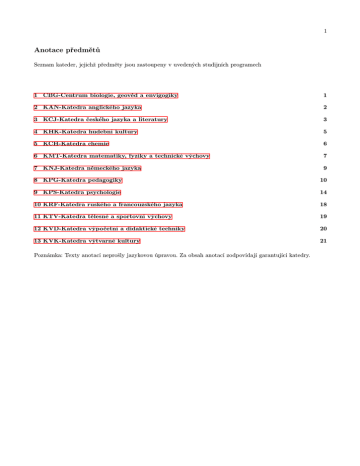 1 Anotace předmětů Seznam kateder, jejichž předměty jsou zastoupeny v uvedených studijních programech 1 CBG-Centrum biologie, geověd a envigogiky 1 2 KAN-Katedra anglického jazyka 2 3 KČJ-Katedra českého jazyka a literatury 3 4 KHK-Katedra hudební kultury 5 5 KCH-Katedra chemie 6 6 KMT-Katedra matematiky, fyziky a technické výchovy 7 7 KNJ-Katedra německého jazyka 9 8 KPG-Katedra pedagogiky 10 9 KPS-Katedra psychologie 14 10 KRF-Katedra ruského a francouzského jazyka 18 11 KTV-Katedra tělesné a sportovní výchovy 19 12 KVD-Katedra výpočetní a didaktické techniky 20 13 KVK-Katedra výtvarné kultury 21 Poznámka: Texty anotací neprošly jazykovou úpravou. Za obsah anotací zodpovídají garantující katedry. 1 1 CBG-Centrum biologie, geověd a envigogiky CBG/BIZV Biologie dítěte a zdrav. výchova Mgr. Alena Dostálová, Ph.D. 2 kr. Zp,Zk Přednáška 2 [hod/týd] možný semestr: ZS Cíle: Prohloubit středoškolské znalosti anatomie a fyziologie člověka s důrazem na pochopení účelu anatomických struktur a funkci fyziologicých dějů a navázat teoretické znalosti na praktické. Seznámit studenty s lidskou ontogenezí včetně specifik jednotlivých vývojových fází. Naučit studenty základy první pomoci, péči o zdraví a seznámit je s vybranými fyzickými a psychickými nemocemi a poruchami, včetně jejich možného vlivu na vzdělávání žáků. Způsobilosti: Student bude mít přehled o jednotlivých anatomických soustavách člověka i s jejich vývojovými a zdravotními aspekty. Student bude schopen dávat si jednotlivá fakta do souvislostí, například vyvodit souvislost mezi funkcí dýchací soustavy a funkcí mitochondrií. Student bude znát základy zásady první pomoci a péče o zdraví. Student dokáže popsat typické příznaky a projevy vybraných fyzických a psychických chorob a poruch včetně jejich možného vlivu na výchovu a vzdělávání žáků. Předpoklady: Znalost biologie člověka na úrovni gymnaziálního učiva. CBG/NASPX Náslechová praxe - bakalářská (BIO) Doc. RNDr. Michal Mergl, CSc. 1 kr. Zp Seminář 5 [dnů/sem] možný semestr: ZS/LS Cíle: Seznámit studenty s procesuální stránkou výuky formou náslechové praxe na škole. Způsobilosti: Student získá schopnost analyzovat vyučovací proces z hlediska využívání forem, metod a prostředků. Předpoklady: Student by měl mít zájem o studium učitelství, měl by mít zájem o biologické obory. 2 2 KAN-Katedra anglického jazyka KAN/NASPX Náslechová praxe - bakalářská Mgr. Gabriela Klečková, Ph.D. 1 kr. Zp Seminář 1 [týd/sem] možný semestr: ZS/LS Cíle: Cílem předmětu je vytvoření základní představy o praktických aplikacích vědomostí a dovedností získaných teoretickým studiem oboru. Studenti se seznámí s aktuální praxí respektive problematikou výuky anglického jazyka a školním prostředím. Takovou zkušenost následně písemně reflektují. Způsobilosti: Studenti jsou schopni: zaznamenat průběh vyučovací hodiny popsat školní prostředí a současnou výuku anglického jazyka částečně analyzovat pozorované postupy z pohledy jejich efektivity pro osvojení si ciziho jazyka Předpoklady: Nejsou předepsány žádné specifické předpoklady. 3 3 KČJ-Katedra českého jazyka a literatury KČJ/CJ1 Čeština jako cizí jazyk 1 Doc. PhDr. Milan Hrdlička, CSc. 4 kr. Zp Přednáška 2 [hod/týd] + Seminář 2 [hod/týd] možný semestr: ZS/LS Cíle: Cílem kurzu je seznámit posluchače se základy nově koncipovaného oboru a s vybranými otázkami popisu a prezentace českého jazyka jako jazyka cílového. Frekventanti kurzu budou vedeni ke schopnosti samostatně a tvůrčím způsobem aplikovat získané poznatky a dovednosti v praxi. V průběhu semináře vypracuje student referát a zpracuje dílčí úkol (podklad pro práci v hodině češtiny jako cizího jazyka). Způsobilosti: Frekventanti kurzu jsou schopni aplikovat bázové poznatky ve vyučovací praxi (výuka základních řečových dovednosti), orientují se v problematice komunikativní koncepce výuky češtiny pro cizince, mají přehled o kvalitě a zaměření vybraných dostupných učebních materiálů i o SERR a o popisech úrovní češtiny jako cizího jazyka (A1-A2B1-B2). Předpoklady: Předpokládá se znalost alespoň jednoho cizího jazyka, optimální je paralelní studium bohemistiky. KČJ/CJ2 Čeština jako cizí jazyk 2 Doc. PhDr. Milan Hrdlička, CSc. 5 kr. Zp,Zk Přednáška 2 [hod/týd] + Seminář 2 [hod/týd] možný semestr: ZS/LS Cíle: Cílem kurzu je prohloubit a rozvinout základní poznatky z kurzu ”Čeština jako cizí jazyk 1”. Pozornost bude věnována zejména problematice popisu a prezentace mluvnice českého jazyka jinojazyčným mluvčím, rozboru tuzemských i zahraničních učebních materiálů češtiny pro cizince a přípravě posluchačů na práci ve vyučovací hodině českého jazyka pro cizince. Způsobilosti: Studenti jsou schopni vykládat gramatiku českého jazyka (její formální i funkční aspekty, její fungování i řečové užití) jinojazyčnému mluvčímu, dovedou vytvářet sylabus kurzu, mají zkušenosti s přípravou na vyučovací hodinu češtiny jako cizího jazyka, umějí připravovat různé typy cvičení, aplikují ve výuce komunikační přístup, umějí analyzovat základní příčiny nejfrekventovanějších chyb. Předpoklady: Základním předpokladem je úspěšné absolvování kurzu ČCJ 1 a schopnost aplikovat předchozí získané poznatky a dovednosti. KČJ/CPP Čeština pro překladatele PhDr. Jaroslava Nováková, Ph.D. 4 kr. Zp Přednáška 2 [hod/týd] + Cvičení 2 [hod/týd] možný semestr: ZS/LS Cíle: Vybavit studenty kompetencemi potřebnými pro překládání textů do českého jazyka. Způsobilosti: Studenti jsou schopni: - bezpečně rozlišit texty z hlediska funkčních stylů (a jejich podtypů)