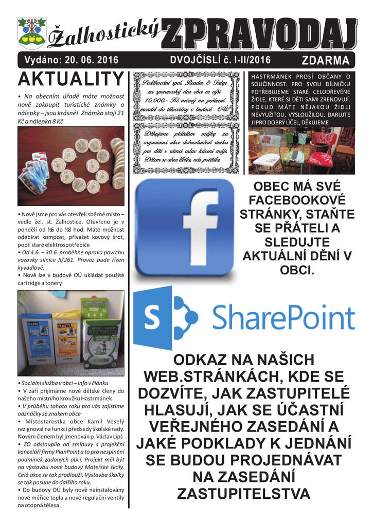 y k c i t s o Z P R A V O D A J Žalh Vydáno: 20. 06. 2016 AKTUALITY • Na obecním úøadì máte možnost novì zakoupit turistické známky a nálepky – jsou krásné! Známka stojí 21 Kè a nálepka 8 Kè DVOJÈÍSLÍ è. I-II/2016 ZDARMA HASTRMÁNEK PROSÍ OBÈANY O P o d ì k o v á n ís p o l .R e a d e r & F a l g e SOUÈINNOST. PRO SVOU DÍLNIÈKU z a s p o n z o r s k ý d a r o b c iv e v ý i POTØEBUJEME STARÉ CELODØEVÌNÉ ŽIDLE, KTERÉ SI DÌTI SAMI ZRENOVUJÍ. 1 0 . 0 0 0 , K è u r è e n ý n a p o ø í z e n í P O K U D M ÁT E N Ì J A KO U Ž I D L I z r c a d e ld o t ì l o c v i è n y v b u d o v ì O Ú ! NEVYUŽITOU, VYSLOUŽILOU, DARUJTE JI PRO DOBRÝ ÚÈEL, DÌKUJEME D ì k u j e m ep ø á t e l ù m m á j k y z a o r g a n i z a c ia k c e d o b r o d r u n á s t e z k a p r o d ì t iv r á m c io s l a v k á c e n ím á j e . D ì t e m s e a k c e l í b i l a , n á s p o t ì i l a . • Novì jsme pro vás otevøeli sbìrné místo – vedle žel. st. Žalhostice. Otevøeno je v pondìlí od 16 do 18 hod. Máte možnost odebírat kompost, pøivážet kovový šrot, popø. staré elektrospotøebièe • Od 4.6. – 30.6. probìhne oprava povrchu vozovky silnice II/261. Provoz bude øízen kyvadlovì. • Novì lze v budovì OÚ ukládat použité cartridge a tonery • Sociální služba v obci – info v èlánku • V záøí pøijímáme nové dìtské èleny do našeho místního kroužku Hastrmánek • V prùbìhu tohoto roku pro vás zajistíme odznáèky se znakem obce • Místostarostka obce Kamil Veselý rezignoval na funkci pøedsedy školské rady. Novým èlenem byl jmenován p. Václav Lipš • ZO odstoupilo od smlouvy s projekèní kanceláøí firmy PlanPoint a to pro nesplnìní podmínek zadaných obcí. Projekt mìl být na výstavbu nové budovy Mateøské školy. Celá akce se tak prodlouží. Výstavba školky se tak posune do dalšího roku. • Do budovy OÚ byly novì nainstalovány nové mìøice tepla a nové regulaèní ventily na otopná tìlesa OBEC MÁ SVÉ FACEBOOKOVÉ STRÁNKY, STAÒTE SE PØÁTELI A SLEDUJTE AKTUÁLNÍ DÌNÍ V OBCI. ODKAZ NA NAŠICH WEB.STRÁNKÁCH, KDE SE DOZVÍTE, JAK ZASTUPITELÉ HLASUJÍ, JAK SE ÚÈASTNÍ VEØEJNÉHO ZASEDÁNÍ A JAKÉ PODKLADY K JEDNÁNÍ SE BUDOU PROJEDNÁVAT NA ZASEDÁNÍ ZASTUPITELSTVA Žalhostický zpravodaj str. 2 výbìrového øízení na novou úèetní školy a vypsání výbìrového øízení na pozici zástupce øeditele. Probìhlo výbìrové øízení na externí úèetní, do konce èervna sdìlí øeditel obci jméno nového zástupce školy. Musíme zdùraznit, že posuzujeme pouze to, co nám ukládá zákon a naším pøáním a závazkem je, aby škola byla kvalitním a fungujícím celkem, aby byla dùležitou komunitní souèástí života našich obèanù, ale i okolí. V žádném pøípadì jsme nikdy neuvažovali o zrušení školy, èi o jejím omezení, jsou to jen výmysly, které nezasluhují žádnou pozornost. Závìrem bychom jen ještì rádi zdùraznili, že všichni, kterým na škole záleží, si i uvìdomují, jak je pro naši školu a následnì i obec výhodné, že naše dìti budou chodit do naší školy v naší obci. Jednak získají kamarády, se kterými se budou potkávat i mimo školu, získají, alespoò doufáme, vztah ke své obci a rodièe budou mít vìtší pøehled o svých dìtech, protože venkovské školy jsou pøece jen více rodinného typu než ve mìstech, kde panuje vìtší individualismus. Chceme vìøit, že už ustane nezdravá „hysterie“ okolo školy, èekají nás všechny velké letní prázdniny, dovolené. 1. záøí bude nejen novým školním rokem, ale urèitì i novým krokem ke vzájemné spolupráci školy a jejího zøizovatele, obce Žalhostice a jejího vedení. Stanislava Hanková, starostka Alena Vacková, zastupitelka O B E C K O L U P O D P O R U J E Zastupitelstvo obce Žalhostice skuteènì øeší a i do budoucnosti bude øešit naši školu, protože nám na ní záleží. Okolní obce sepisují petice, zastánci školy vyvolali veøejnou kampaò proti souèasnému vedení naší obce. Je pochopitelné, že mnozí z vás jsou souèasnou situací, která se nechvalnì šíøí na všechny strany, znepokojeni. Stejnì jako panovala a prý stále panuje zvìst o tom, že nové vedení obce chce školu zrušit, èi srovnat se zemí, èi namísto ní postavit penzion pro seniory, je na svìtì další. Tento èlánek zveøejòujeme proto, abyste mìli možnost udìlat si svùj vlastní úsudek, nebyli jste vystaveni cíleným manipulacím. Obec Žalhostice je zøizovatelem naší školy. Tzn., že my ji udržujeme v provozu, jsme za její veškeré dìní a èinnost zodpovìdní. Jsme pøímý nadøízený orgán školy. Z našeho rozpoètu èást penìz investujeme na provoz školního zaøízení. Od státu na provoz školy získáváme z rozpoètového urèení daní na jednoho žáka èástku cca 8 000,- Kè., což v pøepoètu na poèet žákù je cca 880 tisíc korun. Výše tohoto pøíspìvku je pøímo závislá na poètu dìtí. Èím více dìtí ve škole je, tím více penìz na její provoz obdržíme. Každá obec má zákonnou povinnost zajistit obèanùm základní vzdìlání. Naše místní škola se tak stala školou spádovou pro vìtšinu okolních obcí. Pøed systémem pøímého urèení daní se na podílu nákladù podílely obce, jejichž dìti do školy docházely a nutno podotknout, že se podílely jen na skuteènì nutných nákladech, veškeré „pøilepšení“ škole bylo vždy na bedrech naší obce (úvìry na rekonstrukci, opravy, vybavení apod.) Provoz školy roènì vychází zøizovatele, tj. naši obec na èástku mezi 1 – 1,5 milionem korun. Za rok 2015 obec z rozpoètu na provoz školy pøispìla èástkou ve výši 1,3 milionu. Naše škola je spádová pro dìti z okolních obcí, jako jsou Libochovany (22 žákù), Píš