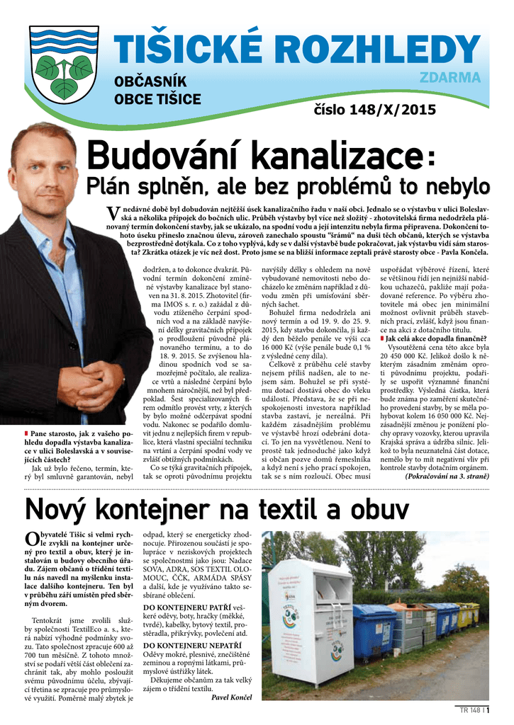 číslo 148/X/2015 Budování kanalizace: Plán splněn, ale bez problémů to nebylo V nedávné době byl dobudován nejtěžší úsek kanalizačního řadu v naší obci. Jednalo se o výstavbu v ulici Boleslavská a několika přípojek do bočních ulic. Průběh výstavby byl více než složitý - zhotovitelská firma nedodržela plánovaný termín dokončení stavby, jak se ukázalo, na spodní vodu a její intenzitu nebyla firma připravena. Dokončení tohoto úseku přineslo značnou úlevu, zároveň zanechalo spoustu “šrámů“ na duši těch občanů, kterých se výstavba bezprostředně dotýkala. Co z toho vyplývá, kdy se v další výstavbě bude pokračovat, jak výstavbu vidí sám starosta? Zkrátka otázek je víc než dost. Proto jsme se na bližší informace zeptali právě starosty obce - Pavla Končela. n Pane starosto, jak z vašeho pohledu dopadla výstavba kanalizace v ulici Boleslavská a v souvisejících částech? Jak už bylo řečeno, termín, který byl smluvně garantován, nebyl dodržen, a to dokonce dvakrát. Původní termín dokončení zmíněné výstavby kanalizace byl stanoven na 31. 8. 2015. Zhotovitel (firma IMOS s. r. o.) zažádal z důvodu ztíženého čerpání spodních vod a na základě navýšení délky gravitačních přípojek o prodloužení původně plánovaného termínu, a to do 18. 9. 2015. Se zvýšenou hladinou spodních vod se samozřejmě počítalo, ale realizace vrtů a následné čerpání bylo mnohem náročnější, než byl předpoklad. Šest specializovaných firem odmítlo provést vrty, z kterých by bylo možné odčerpávat spodní vodu. Nakonec se podařilo domluvit jednu z nejlepších firem v republice, která vlastní speciální techniku na vrtání a čerpání spodní vody ve zvlášť obtížných podmínkách. Co se týká gravitačních přípojek, tak se oproti původnímu projektu navýšily délky s ohledem na nově vybudované nemovitosti nebo docházelo ke změnám například z důvodu změn při umísťování sběrných šachet. Bohužel firma nedodržela ani nový termín a od 19. 9. do 25. 9. 2015, kdy stavbu dokončila, ji každý den běželo penále ve výši cca 16 000 Kč (výše penále bude 0,1 % z výsledné ceny díla). Celkově z průběhu celé stavby nejsem příliš nadšen, ale to nejsem sám. Bohužel se při systému dotací dostává obec do vleku událostí. Představa, že se při nespokojenosti investora například stavba zastaví, je nereálná. Při každém zásadnějším problému ve výstavbě hrozí odebrání dotací. To jen na vysvětlenou. Není to prostě tak jednoduché jako když si občan pozve domů řemeslníka a když není s jeho prací spokojen, tak se s ním rozloučí. Obec musí uspořádat výběrové řízení, které se většinou řídí jen nejnižší nabídkou uchazečů, pakliže mají požadované reference. Po výběru zhotovitele má obec jen minimální možnost ovlivnit průběh stavebních prací, zvlášť, když jsou finance na akci z dotačního titulu. n Jak celá akce dopadla finančně? Vysoutěžená cena této akce byla 20 450 000 Kč. Jelikož došlo k některým zásadním změnám oproti původnímu projektu, podařily se uspořit významné finanční prostředky. Výsledná částka, která bude známa po zaměření skutečného provedení stavby, by se měla pohybovat kolem 16 050 000 Kč. Nejzásadnější změnou je ponížení plochy opravy vozovky, kterou upravila Krajská správa a údržba silnic. Jelikož to byla neuznatelná část dotace, nemělo by to mít negativní vliv při kontrole stavby dotačním orgánem. (Pokračování na 3. straně) Nový kontejner na textil a obuv O byvatelé Tišic si velmi rychle zvykli na kontejner určený pro textil a obuv, který je instalován u budovy obecního úřadu. Zájem občanů o třídění textilu nás navedl na myšlenku instalace dalšího kontejneru. Ten byl v průběhu září umístěn před sběrným dvorem. Tentokrát jsme zvolili služby společnosti TextilEco a. s., která nabízí výhodné podmínky svozu. Tato společnost zpracuje 600 až 700 tun měsíčně. Z tohoto množství se podaří větší část oblečení zachránit tak, aby mohlo posloužit svému původnímu účelu, zbývající třetina se zpracuje pro průmyslové využití. Poměrně malý zbytek je odpad, který se energeticky zhodnocuje. Přirozenou součástí je spolupráce v neziskových projektech se společnostmi jako jsou: Nadace SOVA, ADRA, SOS TEXTIL OLOMOUC, ČČK, ARMÁDA SPÁSY a další, kde je využíváno takto sesbírané oblečení. Do kontejneru patří veškeré oděvy, boty, hračky (měkké, tvrdé), kabelky, bytový textil, prostěradla, přikrývky, povlečení atd. Do kontejneru nepatří Oděvy mokré, plesnivé, znečištěné zeminou a ropnými látkami, průmyslové ústřižky látek. Děkujeme občanům za tak velký zájem o třídění textilu. Pavel Končel TR 148 I 1 Nový člen zastupitelstva T omáš Jablončík: Narozen v roce 1984, v Tišicích žije od roku 1995 s menší pauzou 2006 až 2010. Zaměstnán od roku 2007 v České spořitelně jako firemní bankéř. Aktivně se věnoval fotbalu jako trenér přípravky. Do obecního zastupitelstva kandidoval poprvé. n Do obecního zastupitelstva jste kandidoval ve volbách na podzim minulého roku. Jaká byla v té době představa vaší práce pro obec? Dlouhodobě pracuji ve finančním sektoru. Mám zkušenosti s financováním veřejného a neziskového sektoru, nyní se převážně věnuji financování společností do obratu 60 mil Kč. Dále mám zkušenosti se získání a průběhem dotačních titulů. Tyto své zkušenosti chci zúročit i v práci pro obec. n Nyní jste nastoupil do funkce zastupitele. Změnily se s ročním odstupem vaše cíle, kterých byste chtěl v této funkci dosáhnout? Mé cíle se obdobím nezměnily. Chci se věnovat převážně financím a 