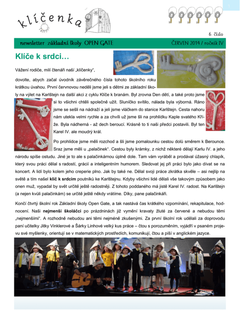 Klíče k srdci… Vážení rodiče, milí čtenáři naší „klíčenky“, dovolte, abych začal úvodník závěrečného čísla tohoto školního roku krátkou úvahou. První červnovou neděli jsme jeli s dětmi ze základní školy na výlet na Karlštejn na další akci z cyklu Klíče k branám. Byl zrovna Den dětí, a také proto jsme si to všichni chtěli společně užít. Sluníčko svítilo, nálada byla výborná. Ráno jsme se sešli na nádraží a jeli jsme vláčkem do stanice Karlštejn. Cesta nahoru nám utekla velmi rychle a za chvíli už jsme šli na prohlídku Kaple svatého Kříže. Byla nádherná - až dech beroucí. Krásně to ti naši předci postavili. Byl ten Karel IV. ale moudrý král. Po prohlídce jsme měli rozchod a šli jsme pomalounku cestou dolů směrem k Berounce. Sraz jsme měli u „palačinek“. Cestou byly krámky, z nichž některé dělají Karlu IV. a jeho národu spíše ostudu. Jiné je to ale s palačinkárnou úplně dole. Tam vám vyráběl a prodával úžasný chlapík, který svou práci dělal s radostí, grácií a inteligentním humorem. Sledovat jej při práci bylo jako dívat se na koncert. A lidí bylo kolem jeho creperie plno. Jak by také ne. Dělal svoji práce zkrátka skvěle – asi nejlíp na světě a tím našel klíč k srdcím poutníků ke Karlštejnu. Kdyby všichni lidé dělali vše takovým způsobem jako onen muž, vypadal by svět určitě ještě radostněji. Z tohoto poddaného má jistě Karel IV. radost. Na Karlštejn (a nejen kvůli palačinkám) se určitě ještě někdy vrátíme. Díky, pane palačinkáři. Končí čtvrtý školní rok Základní školy Open Gate, a tak nastává čas krátkého vzpomínání, rekapitulace, hodnocení. Naši nejmenší školáčci po prázdninách již vymění kravaty žluté za červené a nebudou těmi „nejmenšími“. A rozhodně nebudou ani těmi nejméně zkušenými. Za první školní rok udělali za doprovodu paní učitelky Jitky Vinklerové a Šárky Linhové velký kus práce – čtou s porozuměním, vyjádří v psaném projevu své myšlenky, orientují se v matematických prostředích, komunikují, čtou a píší v anglickém jazyce. ČERVEN 2014 www.i-klicenka.cz Získávají zdravé sebevědomí. To vše je stále zabaleno do obalu přirozenosti, bezprostřednosti a radostnosti. Důkazem toho byly jejich oborové prezentace a vystoupení v rámci divadelního festivalu. Naše druháky předává do třetí třídy paní učitelka Hana Vavrečková a Šárka Linhová. Všichni prožili naplněný další školní rok a ve vzdělávání udělali opět velký pokrok. Upevnili si dovednosti z prvního ročníku, rozšířili si znalosti ve všech předmětech poznávání světa a jsou schopni uplatňovat vše v reálném životě – píší články do klíčenky, na vysoké úrovni předvedli své prezentace a vrcholem bylo jejich vystoupení při divadelním festivalu. Hloubku přínosu jejich zpracování nelehkého tématu Otevírání studánek Bohuslava Martinů jsme cítili asi všichni, ale míru působení na rozvoj jejich cítění, kulturnosti pocítí sami žáci možná až v dospělosti. Rozhodně budou mít na to, co prožili se svou první paní učitelkou, nezapomenutelné vzpomínky. Naši početně nejsilnější žáci třetích tříd jsou již za půlkou svého působení na základní škole. Stávají se z nich zodpovědnější školáci, mají za sebou úspěšně obsahově náročný třetí ročník. Vzpomínám, na malé školáčky, kteří v září 2011 vstoupili do bran Open Gate jako ti nejmenší. Čas uplynul vskutku raketově a dnes se vzrůstem mnozí vyrovnají páťákům. Stále jim zůstává však jejich dětská hravost a to je jedině dobře. Tyto na chlapce silné ročníky provedly úspěšně třetím ročníkem paní učitelky Petra Kobrová, Věra Pockley, Veronika Malá a páni učitelé Michael Franklin a Steven Cartman. ČERVEN 2014 www.i-klicenka.cz Žáky čtvrtého ročníku čeká v příštím školním roce náročný krok na jejich cestě vzděláváním – a to přijímací pohovory na gymnázium. Jak víte z minulých let, již na podzim budou vykonávat tzv. přijímací pohovory nanečisto, které mnohé napoví. Od dubna se žáci pravidelně navíc setkávali se svou novou třídní paní učitelkou Alexandrou Děžinskou a s paní zástupkyní Petrou Kobrovou, aby se tomuto tématu intenzivněji věnovali. Síla tohoto kolektivu spočívá především právě v „kolektivu“, což nám žáci prokázali ve svém divadelním představení, které jejich rejža nazval „kolektivní“ improvizací. Individualita jednotlivých žáků se ve třídě však také vhodně projevuje, což se ukázalo při prezentacích, divadle i běžné školní práci. Letos to pozorovali jejich starší průvodci – paní učitelky Jitka Hildebrandová, Alexandra Děžinská, Marie Zicháčková a páni Michael Franklin, Steven Cartman a Jiří Luka. Základní školu v letošním roce opouští 18 žáků pátého ročníku, kteří směle naplňují profil žáka Základní školy Open Gate. Jsou zvídaví, rádi se učí nové věci, přemýšlí o přijímaných informacích, dokáží vidět věci z více úhlů pohledu, s jistotou vyjadřují své myšlenky v Čj i Aj, dokáží naslouchat názorům druhých, znají a mají morální hodnoty, respektují dohodnutá pravidla, jsou citliví k potřebám a pocitům druhých, cítí osobní zodpovědnost v pomoci druhým, uvědomují si své silné stránky i slabosti a konstruktivně s nimi pracují, nebojí se vyjádřit myšlenky, názory, postoje, kterým věří, i když ví, že tyto nemusí být přijaty. S posledně jmenovanou dovedností mám osobní zkušenost z nedávné doby, kdy jsem s našimi nejstaršími řešil jistou situaci týkající se odchodů třídy z oběda. Za způsob řešení a průběh vlastní kom