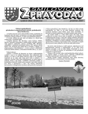 vydává Obec Smilovice Vážení spoluobèané, pøedsedové organizaèních složek, podnikatelé obce Smilovice, ve funkci starosty jsem velmi krátkou dobu, nepøísluší mi hodnotit celý rok 2007, se kterým se za pár dnù rozlouèíme a budeme všichni oèekávat, co nám rok následující pøinese. V úvodu sdìlím jen pár akcí od dubna t.r., které byly realizovány v poslední dobì: vytápìní plynem ZŠ, likvidace staré budovy PZKO, úprava místních komunikací asfaltováním výmolù, ustanovení správce vodovodu, oprava osvìtlení MK, likvidace „skladištì“ v pùdních prostorách budovy OÚ, oprava støech budov OÚ. Program pro pøíští léta je uveden v èlánku „Co pøipravujeme v obci Smilovice“ - viz str. 5, který v obdobném znìní byl taktéž otištìn v Tøineckém hutníku dne 5. 12. 2007. Vážení obèané, stojíme a pomalu již klepeme na brány nejkrásnìjších svátkù v roce, a to svátkù vánoèních. Pár sváteèních dnù pøejde, a ti, kdo se tak pìknì zdravili, pøáli si vše nejlepší, usmívali se na sebe, pak stojí proti sobì a usilují o to nejhorší. Chceme Vám všem pøipomenout, že tento pokoj a pohoda, která v nás bude v prùbìhu vánoèních svátkù, je podmínkou dobrých vztahù mezi sousedy a má velký význam pro dìní a spolupráci v obci. Na tìchto základech porozumìní a kompromisu bychom rádi postavili svoji práci PF 2008 www.smilovice.cz prosinec 2007 s Vámi spoluobèany obce Smilovice. Já vím, ne vždy to bude jednoduché, ne vždy se na sebe budeme usmívat, ale rozumná domluva mezi lidmi, mezi tìmi obzvláštì, se kterými se dennì potkáváme, je jedinì možná cesta vpøed. Na tomto místì a v tuto dobu bych rád Vám všem podìkoval za práci, kterou jste se podíleli na zkvalitòování a zpøíjemòování života v naší obci. Naším mladým obèanùm za jejich dobré výsledky ve škole a uèitelkám za jejich vedení. Rodièùm a dospìlým za dobré pøíklady hodné následování, sportovcùm za dobrou reprezentaci obce, seniorùm za jejich shovívavost k nám, jelikož se od života stále ještì uèíme. Na závìr roku bychom se mìli zastavit, odpoèinout si od každodenních starostí a popøemýšlet, co se nám letos všechno povedlo a jak se nám daøilo. Pochválit se za to dobré, a ze zlého se pouèit, ze smutného si vzít ponauèení a pokusit se zapomenout. Pøejme si do nového roku 2008 pøedevším dobré zdraví, co nejvíce štìstí a pevné nervy, správné rozhodování a mnoho úspìchù jak v zamìstnání, tak i v rodinì. Hezké prožití svátkù vánoèních Vám pøeje starosta, zastupitelé obce a zamìstnanci obecního úøadu. a Gustav Chwistek 2 Zpravodaj obce SMILOVICE Podzim v ZŠ a MŠ Smilovice O prázdninách Paní uèitelky rozebíraly vyøazená AKU kamna a použitelný šrot odvážely do sbìru. Získané peníze byly pøidány k èástce na vybavení poèítaèové uèebny. Paní Wlosoková nacvièila s dìtmi z Øeky program na Vítání obèánkù v obci Øeka. Záøí Vèelaøíci pøipravili expozici svého kroužku na Krajské výstavì v Ostravì. Žáci 1. a 2.roèníku a dìti z MŠ shlédly divadélko Pat a Mat. Dìti z MŠ v rámci projektu „Návštìva u kamaráda“ navštívili Klárku Zmijovou v Gutech. První tøída dostala zaèátkem záøí dárek - nové, výškovì nastavitelné lavice a židle. Sponzorùm moc dìkujeme! Školní družstvo získalo 3. místo na turnaji v pøehazované. Soutìž se konala v Ropici a zúèastnily se jí všechny malotøídní školy mikroregionu Povodí Stonávky. Trenérem našich žákù byla Mgr. Kubeczková. Stacha, aby vyhodnotil øíjnovou sbìraèskou soutìž. Naše dìti nasbíraly celkem 560 kg žaludù a kaštanù. Ze 45 žákù školy se soutìže úèastnilo 32 a nejlepším sbìraèem byla Dagmar Jokielová z 5. tøídy, která odevzdala 150 kg. Žáci 4. roè. provedli mezi svými spolužáky anketu, pøi které zjistili že: 1) Školní uniformy by nechtìl nikdo. 2) Na poèítaèích se doma hrají jen hry a žádné uèební programy. 3) Jen asi tøetina dìtí si dopisuje pøes internet, nejvíce s kamarády z prázdnin. 4) Z Vánoc mají dìti nejradìji tu chvíli, kdy se rozbalují dárky. Úèelem ankety nebylo pochopitelnì nìco zjišovat, ale pocvièit dìti v samostatnosti a spoleèenském vystupování. Èinností pøipravovaných pro dìti je spousta. Snahou pedagogù je, aby byly rozmanité a rozvíjely osobnost dítìte. Akce školy a školky pøispívají k vytvoøení dobrého image školy a vìøíme, že i veøejnost ocení pøístup pedagogù a zamìstnancù školy k rozvoji dìtí. ZŠ + MŠ (www.zssmilovice.ic.cz) Radost pro všechny ! Øíjen Hned první øíjnový den se MŠ i ZŠ úèastnily akce obecní knihovny - Velké øíjnové ètení. Dìti z MŠ pracovaly ve škole v keramické dílnì a v poèítaèové uèebnì. Pøivítaly také bývalé spolužáky, nynìjší žáky 1. roèníku na návštìvì v mateøské školce. Na škole probìhla soutìž ve sbìru žaludù a kaštanù. Organizátorem byla Mgr. Dybová. V polovinì øíjna jsme zaèali topit v našem novém plynovém ústøedním topení, které bylo do školy instalováno o letošních prázdninách. Do hodin angliètiny se dìti v den Halloweenu pøevlékly za duchy a strašidla. Soutìže, výzdobu a vyprávìní k tomuto svátku pøipravila Mgr. Kubeczková. Listopad Vyhráli jsme turnaj v minikopané, který zorganizovala již po páté naše škola pro ostatní školy v mikroregionu Povodí Stonávky. Dìkujeme sponzorùm (Minimarket Smilovice, restaurace „U dubu“, MUDr. Mírová, Ing. Kubala, p. Martynek, Ing. Riedel D., OÚ Øeka, TJ Smilovice), kteøí pomohli turnaj finanènì zajistit. Také dìkujeme èlenùm TJ Smilovice za spravedlivé soudcování. Na druhém místì byli žáci ZŠ Støítež, tøetí místo obsadila ZŠ Tøanovice. D