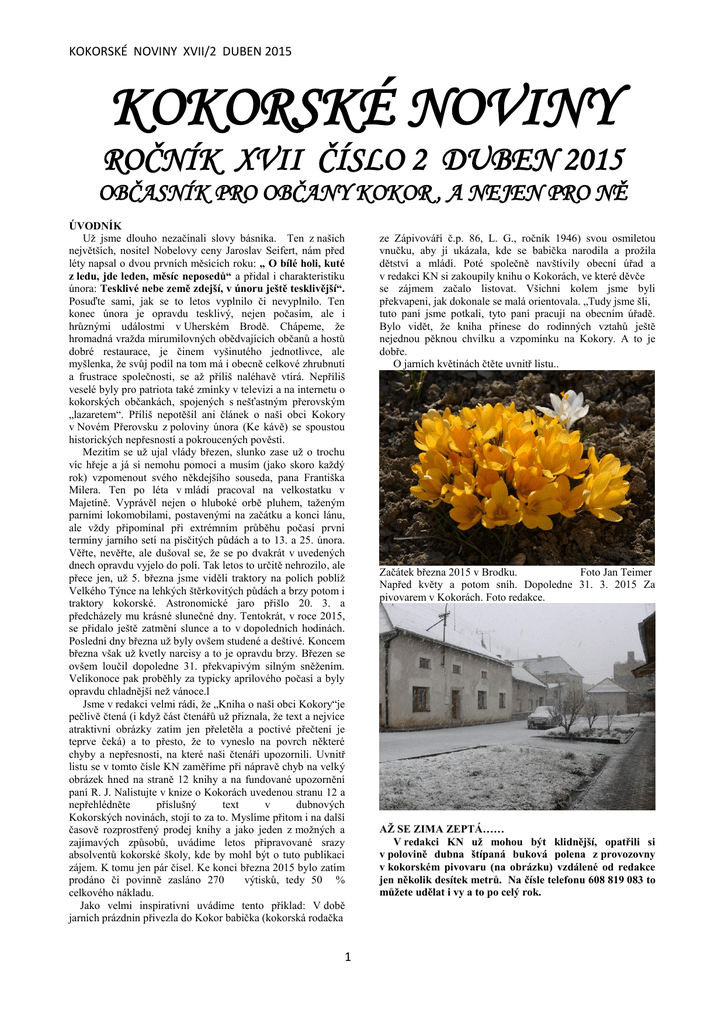 KOKORSKÉ NOVINY XVII/2 DUBEN 2015 KOKORSKÉ NOVINY ROČNÍK XVII ČÍSLO 2 DUBEN 2015 OBČASNÍK PRO OBČANY KOKOR , A NEJEN PRO NĚ ÚVODNÍK Už jsme dlouho nezačínali slovy básníka. Ten z našich největších, nositel Nobelovy ceny Jaroslav Seifert, nám před léty napsal o dvou prvních měsících roku: „ O bílé holi, kuté z ledu, jde leden, měsíc neposedů“ a přidal i charakteristiku února: Tesklivé nebe země zdejší, v únoru ještě tesklivější“. Posuďte sami, jak se to letos vyplnilo či nevyplnilo. Ten konec února je opravdu tesklivý, nejen počasím, ale i hrůznými událostmi v Uherském Brodě. Chápeme, že hromadná vražda mírumilovných obědvajících občanů a hostů dobré restaurace, je činem vyšinutého jednotlivce, ale myšlenka, že svůj podíl na tom má i obecně celkové zhrubnutí a frustrace společnosti, se až příliš naléhavě vtírá. Nepříliš veselé byly pro patriota také zmínky v televizi a na internetu o kokorských občankách, spojených s nešťastným přerovským „lazaretem“. Příliš nepotěšil ani článek o naší obci Kokory v Novém Přerovsku z poloviny února (Ke kávě) se spoustou historických nepřesností a pokroucených pověstí. Mezitím se už ujal vlády březen, slunko zase už o trochu víc hřeje a já si nemohu pomoci a musím (jako skoro každý rok) vzpomenout svého někdejšího souseda, pana Františka Milera. Ten po léta v mládí pracoval na velkostatku v Majetíně. Vyprávěl nejen o hluboké orbě pluhem, taženým parními lokomobilami, postavenými na začátku a konci lánu, ale vždy připomínal při extrémním průběhu počasí první termíny jarního setí na písčitých půdách a to 13. a 25. února. Věřte, nevěřte, ale dušoval se, že se po dvakrát v uvedených dnech opravdu vyjelo do polí. Tak letos to určitě nehrozilo, ale přece jen, už 5. března jsme viděli traktory na polích poblíž Velkého Týnce na lehkých štěrkovitých půdách a brzy potom i traktory kokorské. Astronomické jaro přišlo 20. 3. a předcházely mu krásné slunečné dny. Tentokrát, v roce 2015, se přidalo ještě zatmění slunce a to v dopoledních hodinách. Poslední dny března už byly ovšem studené a deštivé. Koncem března však už kvetly narcisy a to je opravdu brzy. Březen se ovšem loučil dopoledne 31. překvapivým silným sněžením. Velikonoce pak proběhly za typicky aprílového počasí a byly opravdu chladnější než vánoce.l Jsme v redakci velmi rádi, že „Kniha o naší obci Kokory“je pečlivě čtená (i když část čtenářů už přiznala, že text a nejvíce atraktivní obrázky zatím jen přeletěla a poctivé přečtení je teprve čeká) a to přesto, že to vyneslo na povrch některé chyby a nepřesnosti, na které naši čtenáři upozornili. Uvnitř listu se v tomto čísle KN zaměříme při nápravě chyb na velký obrázek hned na straně 12 knihy a na fundované upozornění paní R. J. Nalistujte v knize o Kokorách uvedenou stranu 12 a nepřehlédněte příslušný text v dubnových Kokorských novinách, stojí to za to. Myslíme přitom i na další časově rozprostřený prodej knihy a jako jeden z možných a zajímavých způsobů, uvádíme letos připravované srazy absolventů kokorské školy, kde by mohl být o tuto publikaci zájem. K tomu jen pár čísel. Ke konci března 2015 bylo zatím prodáno či povinně zasláno 270 výtisků, tedy 50 % celkového nákladu. Jako velmi inspirativní uvádíme tento příklad: V době jarních prázdnin přivezla do Kokor babička (kokorská rodačka 1 ze Zápivováří č.p. 86, L. G., ročník 1946) svou osmiletou vnučku, aby jí ukázala, kde se babička narodila a prožila dětství a mládí. Poté společně navštívily obecní úřad a v redakci KN si zakoupily knihu o Kokorách, ve které děvče se zájmem začalo listovat. Všichni kolem jsme byli překvapeni, jak dokonale se malá orientovala. „Tudy jsme šli, tuto paní jsme potkali, tyto paní pracují na obecním úřadě. Bylo vidět, že kniha přinese do rodinných vztahů ještě nejednou pěknou chvilku a vzpomínku na Kokory. A to je dobře. O jarních květinách čtěte uvnitř listu.. Začátek března 2015 v Brodku. Foto Jan Teimer Napřed květy a potom sníh. Dopoledne 31. 3. 2015 Za pivovarem v Kokorách. Foto redakce. AŽ SE ZIMA ZEPTÁ…… V redakci KN už mohou být klidnější, opatřili si v polovině dubna štípaná buková polena z provozovny v kokorském pivovaru (na obrázku) vzdálené od redakce jen několik desítek metrů. Na čísle telefonu 608 819 083 to můžete udělat i vy a to po celý rok. KOKORSKÉ NOVINY XVII/2 DUBEN 2015 ZASTUPITELSTVO OBCE´KOKORY Řádné zasedání zastupitelstva se konalo dne 18. 2. 2015. Usnesení tohoto i dalších mimořádných jednání bylo zveřejněno způsobem obvyklým a vyvěšeno na úřední desce. Z řádného zasedání v KN uvádíme:. USNESENÍ ZASTUPITELSTVA Zastupitelstvo obce schválilo: - ověřovatele zápisu Ing. Vojtěcha Francišku a Ing. Vladimíra Lichnovského - program zasedání zastupitelstva obce - delegování Ing. Vladimíra Lichnovského do dozorčí rady společnosti Vodovody a kanalizace Přerov, a.s. na další volební období - za člena školské rady Martina Bílého - rozpočtové opatření č. 5 k datu 29.12.2014 – schválené radou obce Kokory - příspěvek na provoz Základní školy a Mateřské školy Kokory, p.o. na rok 2015 ve výši 1,680.000,-- Kč - neinvestiční dotaci 1. AC Kokoráček, o.s. na rok 2015 ve výši 30.000,-- Kč na sportovní vybavení, kulturní akce pro děti a pořádání výročí 25 let založení klubu - neinvestiční dotaci Mysliveckému sdružení Hradisko na rok 2015 ve výši 50.000,-- Kč na nákup zvěře, krmení pro zvěř a nákup pachových ohradníků - neinvestiční dotaci Moravské hasičské jednotě, hasičskému sboru Koko