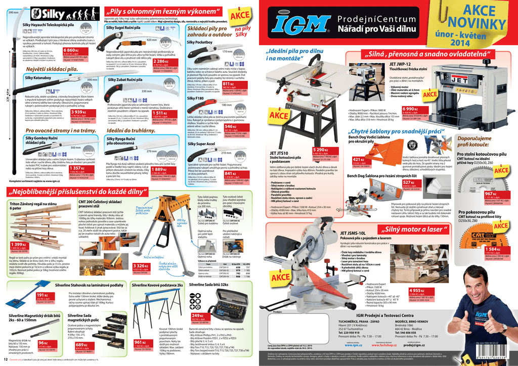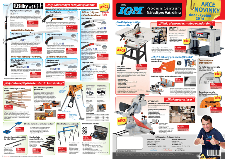 „Pily s ohromným řezným výkonem“ 390 mm Japonské pily Silky mají zuby vybrušovány patentovanou technologií. Pila se nehltí, řeže čistě a rychle napříč i podél vláken. Mají výjmečný design, sílu, rovnováhu a nejvyšší kvalitu provedení. Silky Hayauchi Teleskopická pila Skládací pily pro na pily zahradu a outdoor Silky Silky Sugoi Ruční pila EXTRA HRUBÝ ZUB Nejprodávanější japonská teleskopická pila pro prořezávání stromů ve výškách. Prodlužující tyče jsou z hliníkové slitiny oválného tvaru s vysokou pevností a tuhostí. Poskytují přesnou kontrolu pily při řezání ve výškách. Délka listu 390 mm, 6,5 zubů na 30 mm, tloušťka listu 1,5mm. Celková délka nastavitelná 2,35-4,9m. Hmotnost 2,52kg samostatně, 2,72kg s pouzdrem. Dodáváno se zabalenou rukojetí a krytem na pilový list. 6 860 Kč 8 301 Kč s dph Běžná cena 8 957 Kč s dph Obj.kód: 117-KSI017939N 420 mm EXTRA HRUBÝ ZUB Největší skládací pila. Silky Katanaboy 500 mm Obj.kód: 117-KSI639042 Silky Zubat Ruční pila 2,35 - 4,9 m HRUBÝ ZUB 330 mm EXTRA HRUBÝ ZUB Robustní pila, dobře vyvážená, s kónicky broušeným 50cm listem s impulsně kaleným ostřím poskytuje nejrychlejší řezání velkých větví a kmenů takřka bez námahy. Obouruční, pogumovaná rukojeť s polstrováním poskytuje jistý a pohodlný úchop. 3 939 Kč Délka listu 500mm, celková délka 119cm otevřená, 67cm zavřená, 5 zubů na 30mm. Hmotnost 920g. Dodáváno v nylonovém pouzdru se zavíráním na suchý zip, s nastavitelným popruhem přes rameno a kapsou pro náhradní pilový list. 4 767 Kč s dph Běžná cena 5 143 Kč s dph Obj.kód: 117-KSI540350 Pro ovocné stromy i na trámy. Silky Gomboy Ruční skládací pila Délka listu 330 mm, celková délka 47 cm, s pouzdrem na opasek 55 cm, 7,5 zubů na 30 mm. Hmotnost 300 g samostatně, 480 g s pouzdrem. Dodáváno v pouzdru na opasek. 1 511 Kč 1 829 Kč s dph Běžná cena 1 973 Kč s dph Obj.kód: 117-KSI327033 Ideální do truhlárny. 1 642 Kč s dph Běžná cena 1 772 Kč s dph Obj.kód: 117-KSI522130 Kompletní sortiment najdete na www.igm.cz Tloušťkovací frézka stolní Osvědčená stolní „protahovačka“ pro práci v dílně i na montážích. 811 Kč - Výkonný motor - Úběr materiálu až 2,5mm - Masivní vedení agregátu - Dvou-nožový válec 982 Kč s dph Běžná cena 1 059 Kč s dph Obj.kód: 117-KSI534017 HRUBÝ ZUB Lehká skládací silná pila se dvěma pracovními polohami listu. Rukojeť je vyrobena z polypropylenu s gumovou vložkou. Snadno a rychle řeže zelené větve i suché dřevo. Kč 546 Silky Super Accel JEMNÝ ZUB Pila Ryoga má dvojí odlišné ozubení pilového listu pro rychlé řezy podél a hladké řezy napříč vlákny. List je Kč přitom zbroušen směrem ke středu. Díky tomu docílte neuvěřitelně přesný, lehký 2 286 Kč s dph Běžná cena 2 466 Kč s dph a precizní řez. 1 889 Délka listu 270mm 14/10 zubů na 30mm. JET JTS10 HRUBÝ ZUB STŘEDNÍ ZUB Obj.kód: 117-KSI644027 Speciálně vyvinuté pro rychlé řezání. Pogumovaná polstrovaná rukojeť umožňuje pevný a pohodlný úchop. Pilový list lze uzamknout ve dvou polohách. Kč Délka listu 210 mm, celková délka 44 cm otevřená, 24 cm zavřená, 7,5 zubů na 30 mm. Hmotnost 200 g. Dodávána v blistru. Tyto čelisti pojmou klády nebo trubky do průměru cca 300 mm. CMT 200 Čelisťový skládací pracovní stůl CMT čelisťový skládací pracovní stůl rychle a pevně upne hranoly, lišty i desky silou až 1000kg do šířky materiálu 956mm. Jednou nohou jednoduše povolíte a zase uzamknete ploché čelisti pro upnutí materiálu a můžete jej řezat, hoblovat či jinak zpracovávat. Stůl lze za cca. 20 vteřin složit do přepravní pozice, takže jej lze snadno naložit do auta nebo uskladnit. 841 1 018 Kč s dph Běžná cena 1 099 Kč s dph Obj.kód: 117-KSI511021 Tyto ocelové čelisti jsou vhodné zejména pro práci s kovovými obrobky. Obj. kód: CMT200-01 Obj. kód: CMT200-02 Opěrná noha pro ještě lepší stabylitu Pro přehledné uložení nástrojů a nářadí Čelisti pro kulatinu 6 990 Kč 8 458 Kč s dph Běžná cena 10 029 Kč s dph Obj.kód: 121-JWP-12M Bench Dog Vodící šablona pro okružní pily Obj.kód: 117-KSI512518N 210 mm AKCE „Chytré šablony pro snadnější práci“ 661 Kč s dph Běžná cena 713 Kč s dph Stolní kotoučová pila s podstavcem 5 290 Kč 6 401 Kč s dph Běžná cena 7 993 Kč s dph Obj.kód: 121-JTS-10M Velmi oblíbená pila pro běžné řezání všech druhů dřeva a desek na bázi dřeva. Impozatní výška řezu 80mm. Paralelní pravítko lze upnout z obou stran od pilového kotouče. Vhodná pro kutily, údržby nebo na montáže. Vodící šablona pomáhá dosáhnout přesných kolmých řezů a řezů na 45°. Vodící lišta přesně vede pilu do řezu. Ze spodní strany má 2 gumové protiskluzové pásky. Ideální pro řezání dřeva, obložení, schodišťových stupínků. 421 Kč 510 Kč s dph Obj.kód: 128-938619 Bench Dog Šablona pro řezání stropních lišt Obj. kód: CMT200-03 Regál se šesti patry je určen pro vnitřní i vnější montáž na stěnu. Skládá se ze dvou částí, tím si šířku regálu můžete zvolit dle potřeby. Hloubka polic je 31cm, prostor mezi dvěmi policemi je 16,5cm a celková výška regálu je 103cm. Nosnost jedné police je 50kg (nostnost celého regálu 300kg). Popis Čelisti pro kulatinu 1 171 Kč s dph Běžná cena 1 671 Kč s dph Přípravek pro pokosové pily na přesné řezání stropních lišt. Nemusíte již složitě vyměřovat úhel a riskovat chybný řez. Tento přípravek je přímo navržen pro snadné nastavení úhlu (sklon) lišty a vy tak budete mít dokonalé rohové spoje. Možnost řezání dílců až do šířky 150mm. „Silný motor a laser “ JET JSMS-10L 4 025 Kč s dph Čelisti ocelové Obj.kód: CMT200 Opěrná noha Držák na