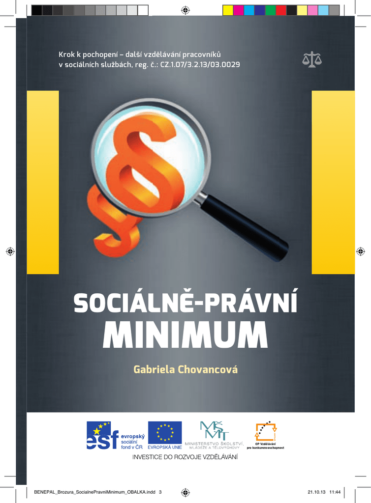 Krok k pochopení – další vzdělávání pracovníků v sociálních službách, reg. č.: CZ.1.07/3.2.13/03.0029 SOCIÁLNĚ-PRÁVNÍ MINIMUM Gabriela Chovancová BENEPAL_Brozura_SocialnePravniMinimum_OBALKA.indd 3 21.10.13 11:44 SOCIÁLNĚ-PRÁVNÍ MINIMUM Gabriela Chovancová Krok k pochopení – další vzdělávání pracovníků v sociálních službách reg. č. CZ.1.07/3.2.13/03.0029 1 BENEPAL_Brozura_SocialnePravniMinimum_kor.indd 1 21.10.13 11:44 Obsah ......4 1. ÚVOD ..................................................................................................4 ......5 ...... 7 ...... 7 ......9 .... 10 .... 10 ..... 11 .... 12 .... 12 .... 13 2. SOCIÁLNÍ SLUŽBY..............................................................................5 2.1 SOCIÁLNÍ SLUŽBY ........................................................................ 7 2.1.1 Druhy a formy poskytování sociálních služeb ................. 7 2.1.2 Úhrada nákladů za sociální služby ...................................9 2.1.3 Registrace sociálních služeb .......................................... 10 2.1.4 Povinnosti poskytovatelů sociálních služeb .................. 10 2.1.5 Smlouva o poskytnutí sociální služby ............................ 11 2.1.6 Standardy kvality sociálních služeb .............................. 12 2.2 PŘÍSPĚVEK NA PÉČI ................................................................... 15 2.2.1 Podmínky nároku na příspěvek, výše příspěvku ........... 15 2.2.2 Řízení o příspěvku na péči .............................................. 16 .... 14 .... 16 .... 16 .... 16 .....17 3. NEMOCENSKÉ POJIŠTĚNÍ ..................................................................17 3.1 Dávky nemocenského pojištění ................................................ 19 3.1.1 Nemocenské .................................................................... 19 3.1.2 Peněžitá pomoc v mateřství.......................................... 20 3.1.3 Ošetřovné........................................................................ 21 .... 18 .... 19 ... 20 ... 20 ... 23 ....24 4. DŮCHODOVÉ POJIŠTĚNÍ .................................................................. 21 4.1 Dávky z důchodového pojištění ............................................... 22 4.1.1 Starobní důchod ............................................................. 23 4.1.2 Invalidní důchod ..............................................................24 4.1.3 Vdovský a vdovecký důchod ..........................................27 4.1.4 Sirotčí důchod .................................................................27 ....24 5. ZDRAVOTNÍ POJIŠTĚNÍ ....................................................................... 28 2 BENEPAL_Brozura_SocialnePravniMinimum_kor.indd 2 21.10.13 11:44 6. SYSTÉM STÁTNÍ SOCIÁLNÍ PODPORY ............................................. 31 6.1 Dávky státní sociální podpory .................................................. 31 6.1.1 Přídavek na dítě ...............................................................32 6.1.2 Příspěvek na bydlení .......................................................32 6.1.3 Rodičovský příspěvek .....................................................33 6.1.4 Porodné .......................................................................... 34 6.1.5 Pohřebné ........................................................................ 34 7. DÁVKY PĚSTOUNSKÉ PÉČE ............................................................. 34 7.1 Příspěvek na úhradu potřeb dítěte (§ 47f) ...............................35 7.2 Odměna pěstouna (§ 47i, 47j) ...................................................35 7.3 Příspěvek pří převzetí dítěte (§47l) ......................................... 36 7.4 Příspěvek na zakoupení motorového vozidla (§ 47m) ............ 36 7.5 Státní příspěvek na výkon pěstounské péče (§ 47d zákona) .. 36 8. SYSTÉM POMOCI V HMOTNÉ NOUZI ...................................................37 8.1 Dávky pomoci v hmotné nouzi ................................................. 44 8.1.1 Příspěvek na živobytí ..................................................... 44 8.1.2 Doplatek na bydlení ....................................................... 45 8.1.3 Mimořádná okamžitá pomoc ......................................... 45 9. DÁVKY A VÝHODY PRO OSOBY SE ZDRAVOTNÍM POSTIŽENÍM ..... 46 9.1 Dávky pro osoby se zdravotním postižením ........................... 48 9.1.1 Příspěvek na mobilitu ..................................................... 48 9.1.2 Příspěvek na zvláštní pomůcku ..................................... 48 9.2 Průkaz osoby se zdravotním postižením ............................... 50 10. PODPORA V NEZAMĚSTNANOSTI .................................................. 52 11. SYSTÉM VÝPLATY SOCIÁLNÍCH DÁVEK .......................................... 54 12. ZÁVĚR ...............................................................................................55 3 BENEPAL_Brozura_SocialnePravniMinimum_kor.indd 3 21.10.13 11:44 1. ÚVOD Milí čtenáři, dostává se Vám do rukou studijní příručka vzdělávacího kurzu Sociálně-právní minimum. Tento kurz je určen jak začínajícím sociálním pracovníkům, kteří se teprve orientují v oblasti sociálně-právního poradenství, tak všem pracovníkům, kteří si chtějí svoje znalosti oživit, popřípadě doplnit o informace nové a aktuální. Obsah sociálně-právního poradenství může být chápán různě. Někteří poskytovatelé sociálních služeb zahrnují pod tuto činnost i poradenství v oblasti rodinného práva, pracovněprávních vztahů, problematiky nájemního bydlení apod. V našem případě se zaměříme „pouze“ na témata vyplývající především ze sféry práva sociálního zabezpečení. Jak všichni z