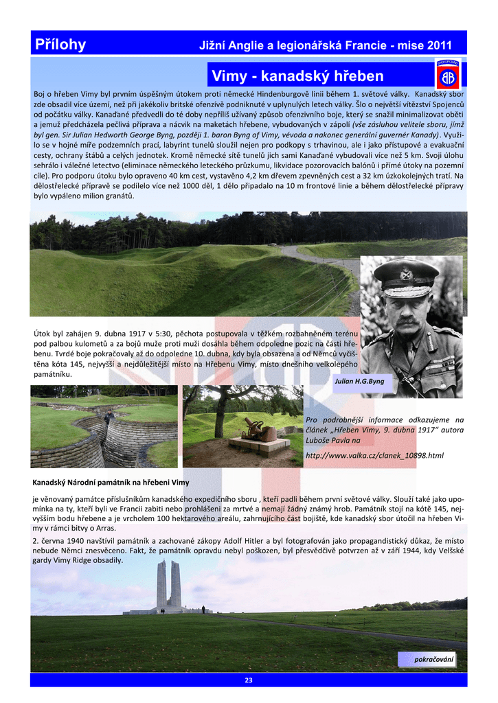 Přílohy Jižní Anglie a legionářská Francie - mise 2011 Vimy - kanadský hřeben Boj o hřeben Vimy byl prvním úspěšným útokem proti německé Hindenburgově linii během 1. světové války. Kanadský sbor zde obsadil více území, než při jakékoliv britské ofenzívě podniknuté v uplynulých letech války. Šlo o největší vítězství Spojenců od počátku války. Kanaďané předvedli do té doby nepříliš užívaný způsob ofenzivního boje, který se snažil minimalizovat oběti a jemuž předcházela pečlivá příprava a nácvik na maketách hřebene, vybudovaných v zápolí (vše zásluhou velitele sboru, jímž byl gen. Sir Julian Hedworth George Byng, později 1. baron Byng of Vimy, vévoda a nakonec generální guvernér Kanady). Využilo se v hojné míře podzemních prací, labyrint tunelů sloužil nejen pro podkopy s trhavinou, ale i jako přístupové a evakuační cesty, ochrany štábů a celých jednotek. Kromě německé sítě tunelů jich sami Kanaďané vybudovali více než 5 km. Svoji úlohu sehrálo i válečné letectvo (eliminace německého leteckého průzkumu, likvidace pozorovacích balónů i přímé útoky na pozemní cíle). Pro podporu útoku bylo opraveno 40 km cest, vystavěno 4,2 km dřevem zpevněných cest a 32 km úzkokolejných tratí. Na dělostřelecké přípravě se podílelo více než 1000 děl, 1 dělo připadalo na 10 m frontové linie a během dělostřelecké přípravy bylo vypáleno milion granátů. Útok byl zahájen 9. dubna 1917 v 5:30, pěchota postupovala v těžkém rozbahněném terénu pod palbou kulometů a za bojů muže proti muži dosáhla během odpoledne pozic na části hřebenu. Tvrdé boje pokračovaly až do odpoledne 10. dubna, kdy byla obsazena a od Němců vyčištěna kóta 145, nejvyšší a nejdůležitější místo na Hřebenu Vimy, místo dnešního velkolepého památníku. Julian H.G.Byng Pro podrobnější informace odkazujeme na článek „Hřeben Vimy, 9. dubna 1917“ autora Luboše Pavla na http://www.valka.cz/clanek_10898.html Kanadský Národní památník na hřebeni Vimy je věnovaný památce příslušníkům kanadského expedičního sboru , kteří padli během první světové války. Slouží také jako upomínka na ty, kteří byli ve Francii zabiti nebo prohlášeni za mrtvé a nemají žádný známý hrob. Památník stojí na kótě 145, nejvyšším bodu hřebene a je vrcholem 100 hektarového areálu, zahrnujícího část bojiště, kde kanadský sbor útočil na hřeben Vimy v rámci bitvy o Arras. 2. června 1940 navštívil památník a zachované zákopy Adolf Hitler a byl fotografován jako propagandistický důkaz, že místo nebude Němci znesvěceno. Fakt, že památník opravdu nebyl poškozen, byl přesvědčivě potvrzen až v září 1944, kdy Velšské gardy Vimy Ridge obsadily. pokračování 23 Jižní Anglie a legionářská Francie - mise 2011 Přílohy Vimy - kanadský hřeben druhý se stylizovaným květem lilie za Francii, symbolizují jednotu a oběti obou zemí. Na vrcholu pylonů je seskupení postav společně označované jako Chorus. Nejvyšší z nich představují Spravedlnost a Mír. Mír stojí se vztyčenou pochodní, což je nejvyšší bod v místa a širokého okolí. Autorem památníku je torontský sochař Walter Seymour Allward, práce trvala 11 let. Král Edward VIII odhalil památník 26. července 1936 za přítomnosti francouzského prezidenta Alberta Lebruna, více než 50 tisíc kanadských a francouzských veteránů a jejich rodin. Po rozsáhlé rekonstrukci památník znovu otevřela 9. dubna 2007, při příležitosti 90. výročí bitvy, královna Alžběta II. Součástí pomníku je velké množství stylizovaných prvků, včetně 20 lidských postav. Přední stěna, obvykle mylně považovaná za zadní, je 7,3 m vysoká a představuje neproniknutelnou zeď obrany. Skupinová skluptura „Zlomení meče“ (tři mladíci, jeden klečí a láme meč. Představují porážku militarismu a touhu po míru a jde o neobvyklý motiv na válečných památnících. Původní plán počítal se sousoším, na němž bude nohou drcena německá helma. Allward tento návrh zamítl jako příliš militaristický.) Naděje, Láska, Čest a Víra jsou umístěny pod Spravedlností a Mírem na východní straně, Pravda a Znalosti na západní straně. Kolem jsou štíty Kanady, Británie a Francie. Vnější stranu každého pylonu zdobí velké kříže. Sousoší „Soucit Kanaďanů s bezmocnými“ je na severním rohu (jeden muž stojí vzpřímeně, zatímco tři další postavy, postižené hladem nebo nemocí, se krčí a klečí kolem něj. Právě stojící muž prezentuje onen soucit se slabými a utlačovanými). Na úpatí mezi oběma stožáry je sousoší Obětavost. Mladý umírající voják, hledící vzhůru jako v ukřižování, hodil pochodeň kamarádovi, který ji drží ve vzduchu za ním. Jde o skrytý odkaz na báseň ve Flandrských polích Johna McCrae, kdy pochodeň přechází od jednoho kamaráda k druhému ve snaze udržet památku na padlé. Nad každou skupinou je jako symbol míru dělová hlaveň zahalená ve vavřínu a olivové ratolesti vytesané do zdi. Postava zahalené mladé ženy známá jako „Matka Kanada“, stojí na vrcholu čelní stěny a má výhled na Douaiské pláně. Má skloněnou hlavu, oči sklopené a bradu spočívající v jedné ruce a je ztělesněním smutku mladého národa nad smrtí svých synů. Na rozdíl od ostatních soch na památníku byla zhotovena z jednoho třicetitunového bloku kamene a je největším monolitem na památce. Na zadní straně pomníku (mylně považované za přední) jsou vedle chodiště „Truchlící rodiče“ - nalevo matka a napravo otec (pravděpodobně jsou inspirovány sochami od Michelangela na hrobce Medici ve Florencii). Na vnější pamětní zdi jsou vytesaná jména 11 285 Kanaďanů nezvěstných za